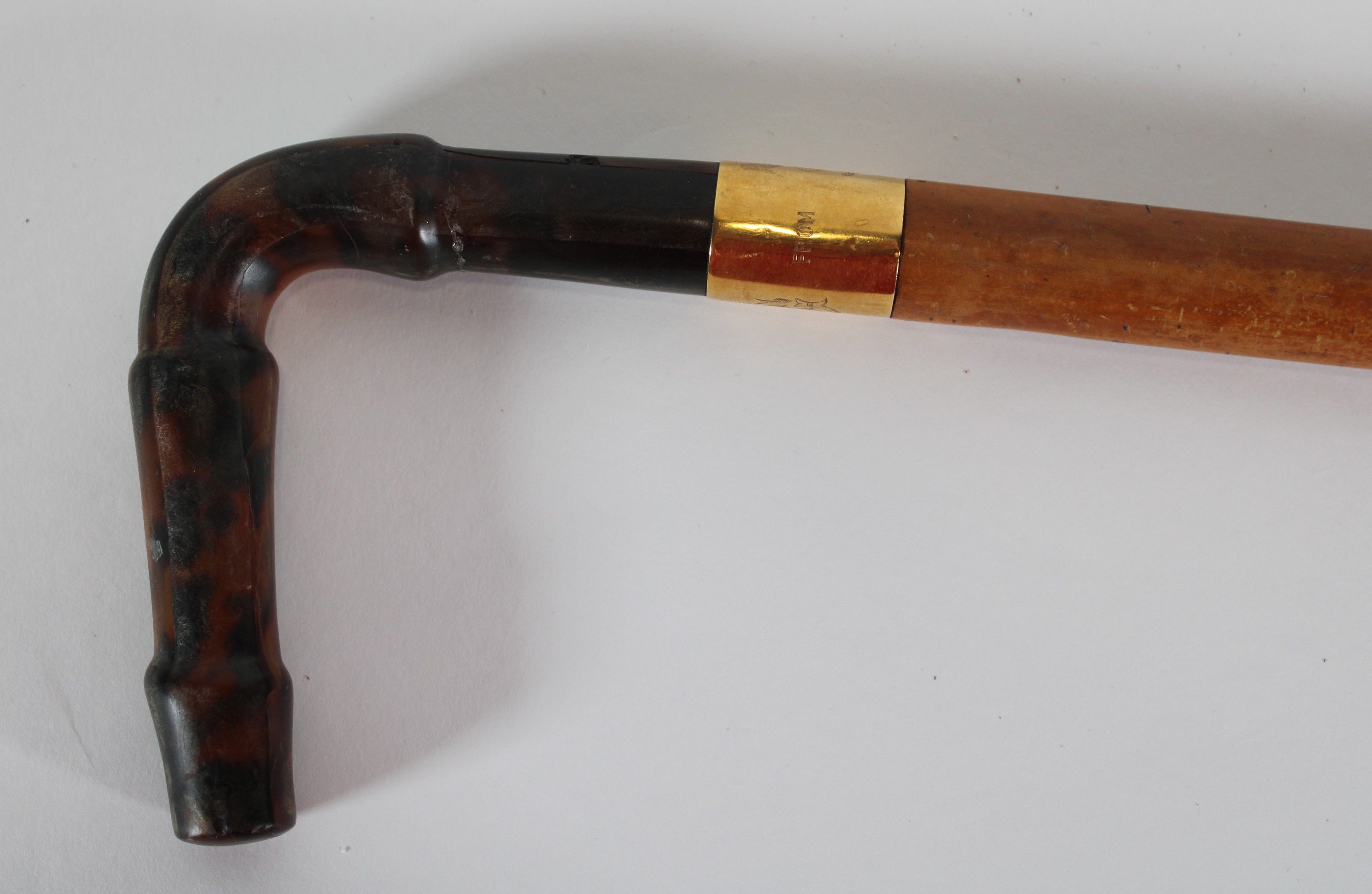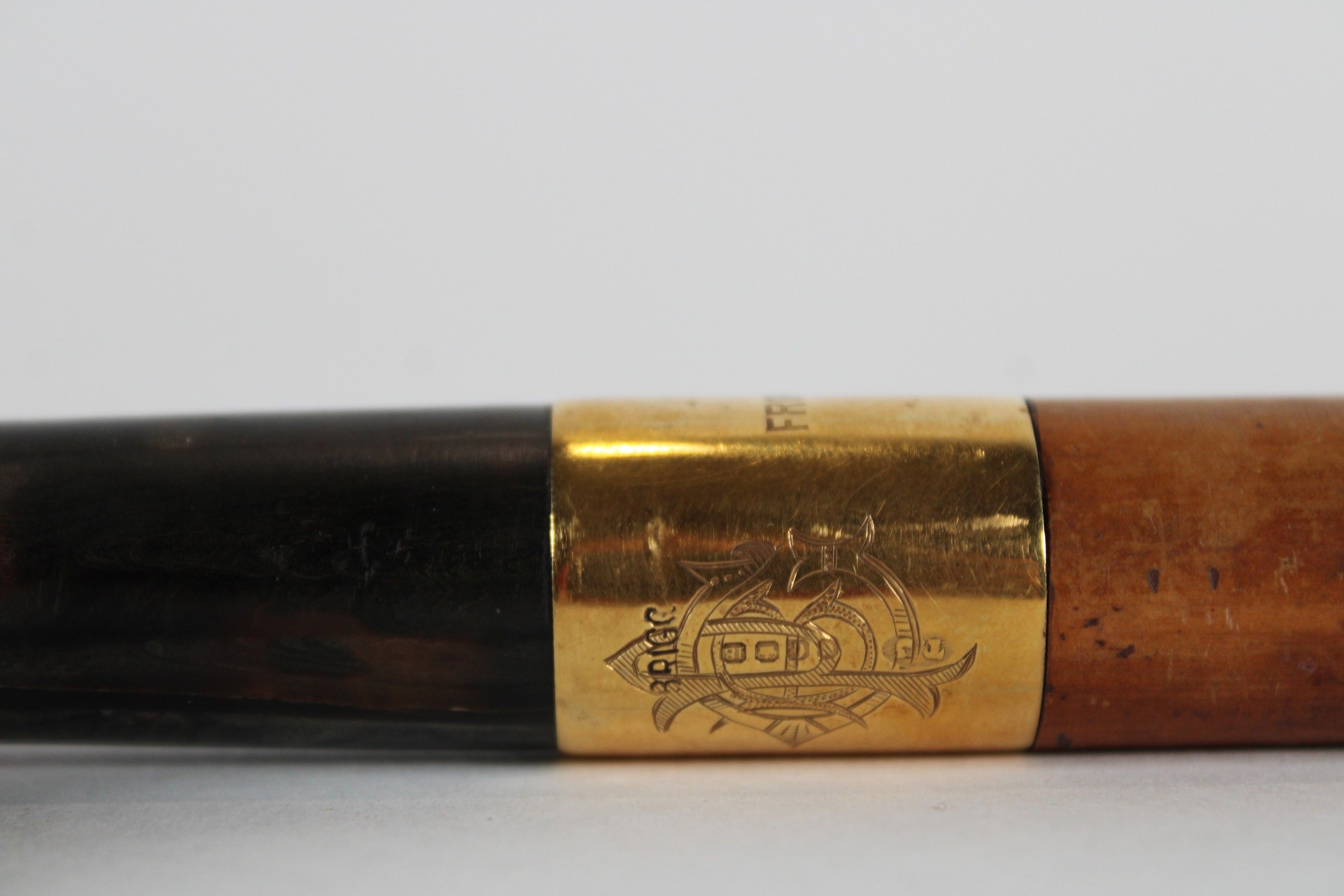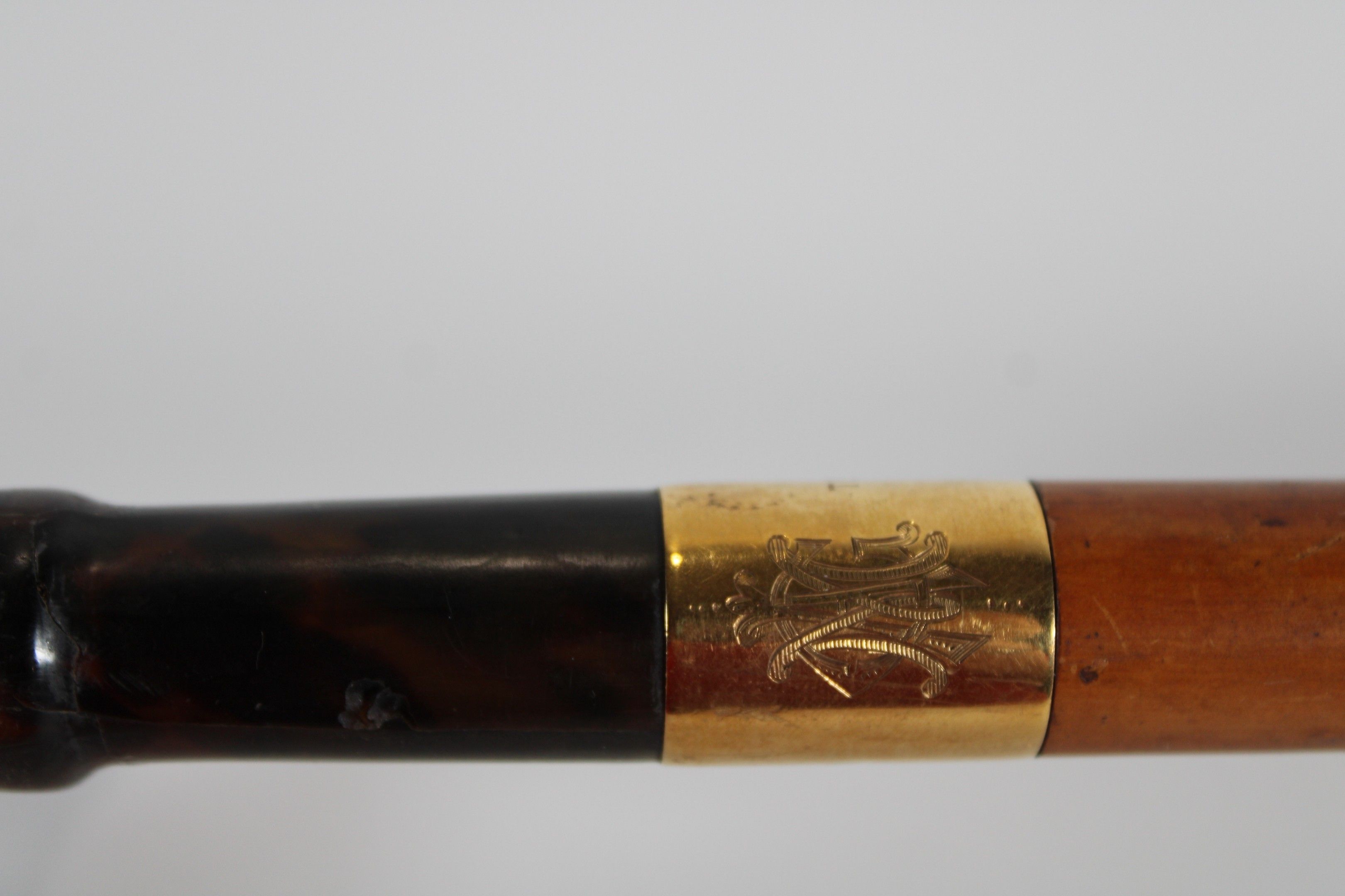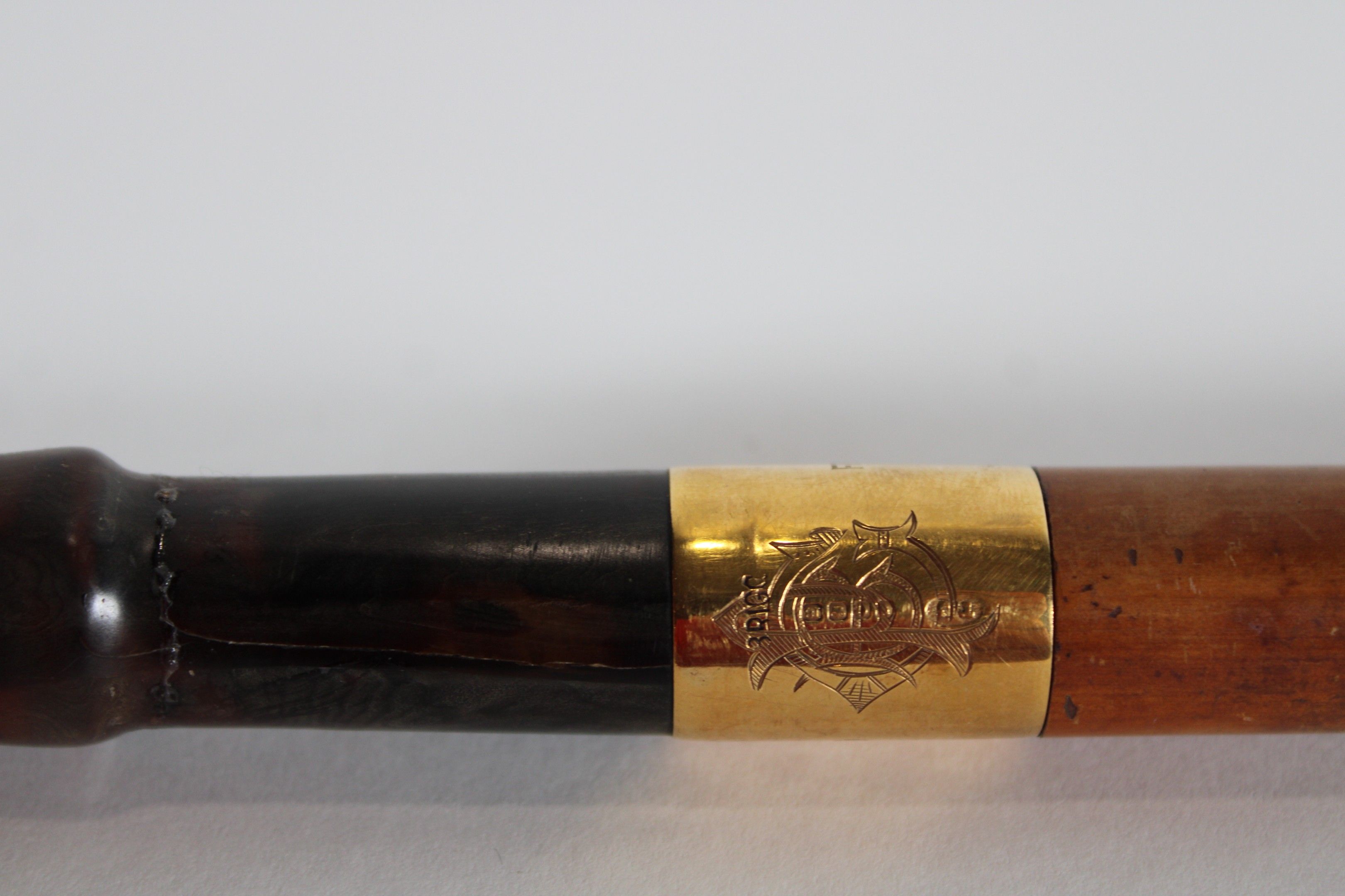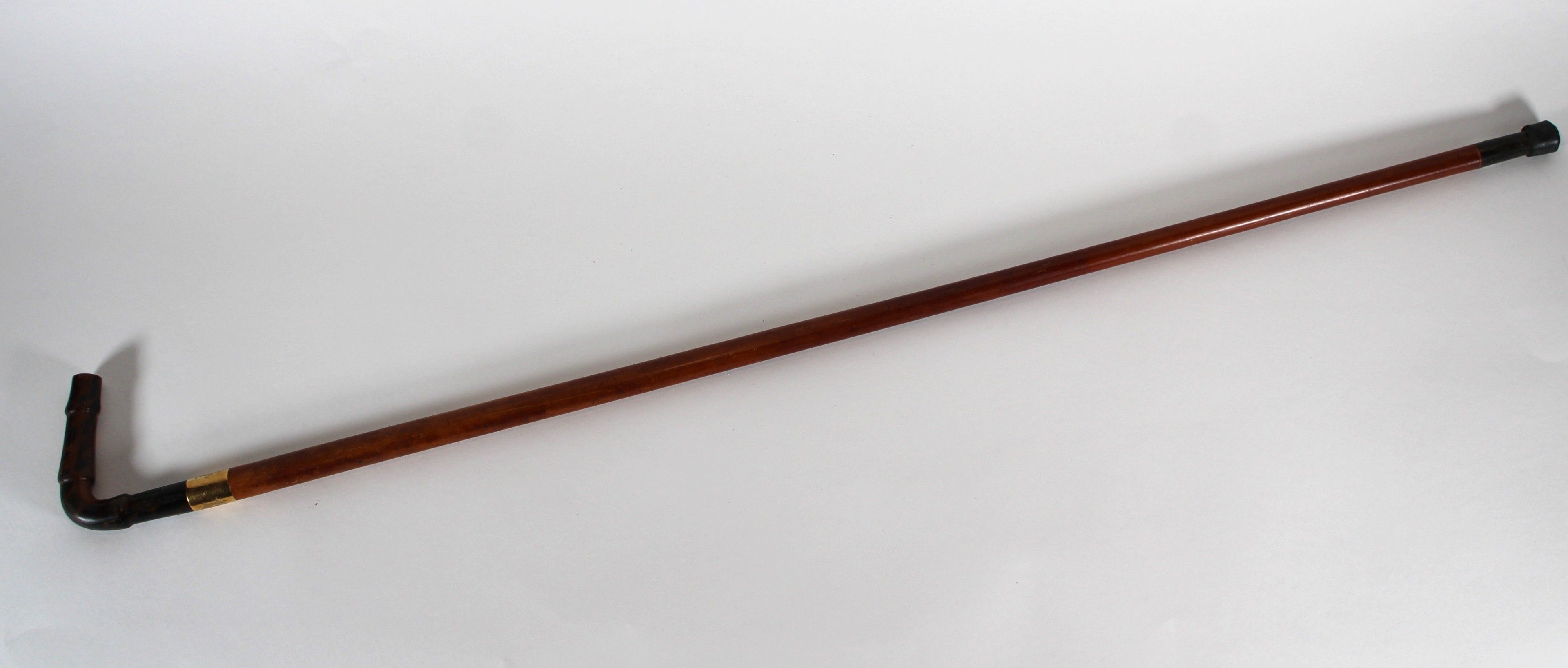 Wooden cane, the pommel underlined by a 750°° gold ring bearing engraved initials.