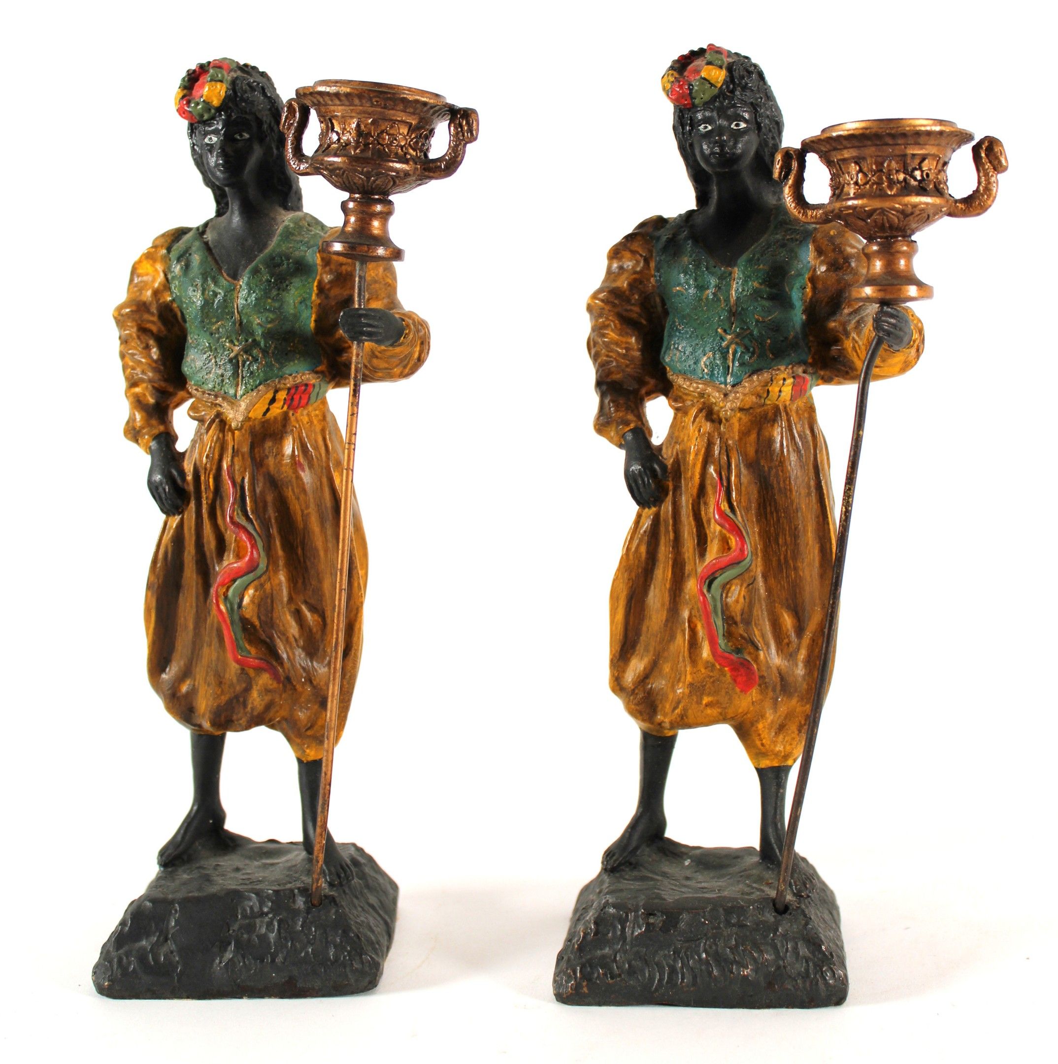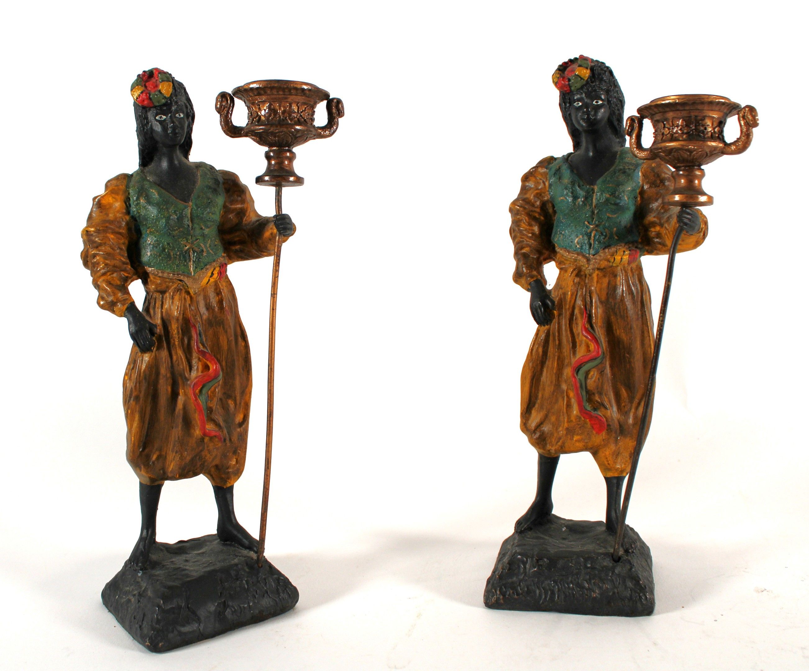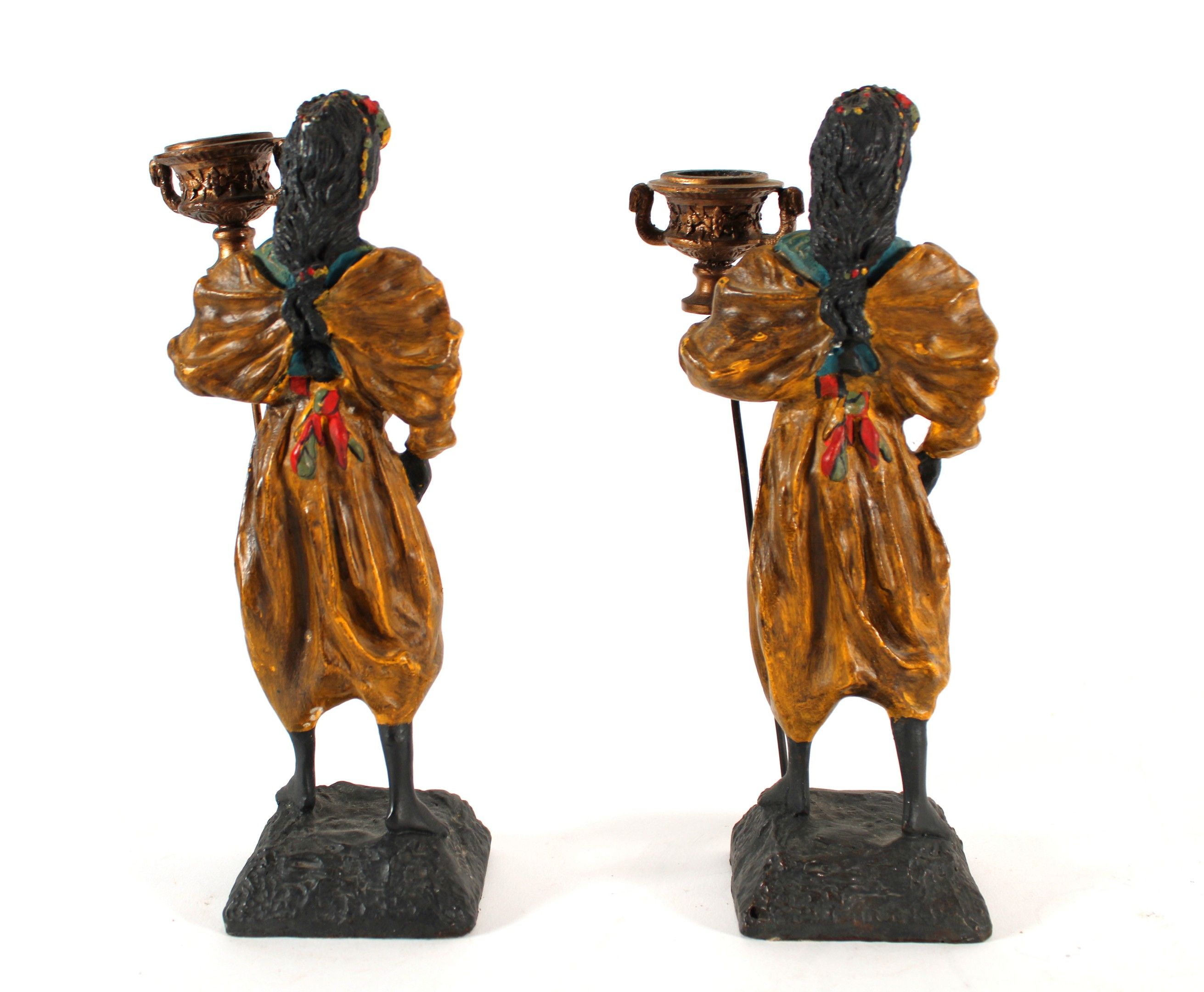 A pair of polychrome bronze candlesticks depicting Nubian women.
