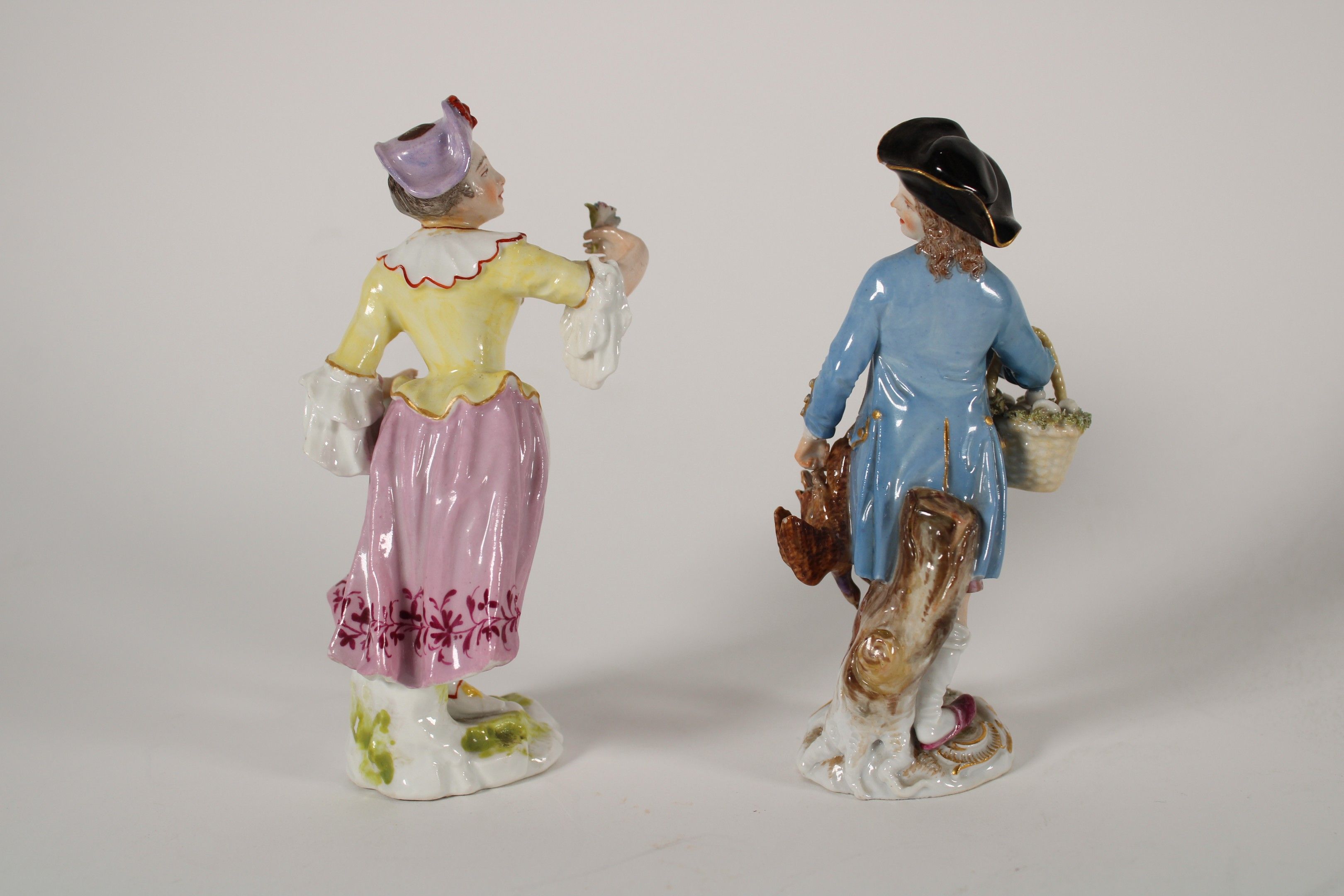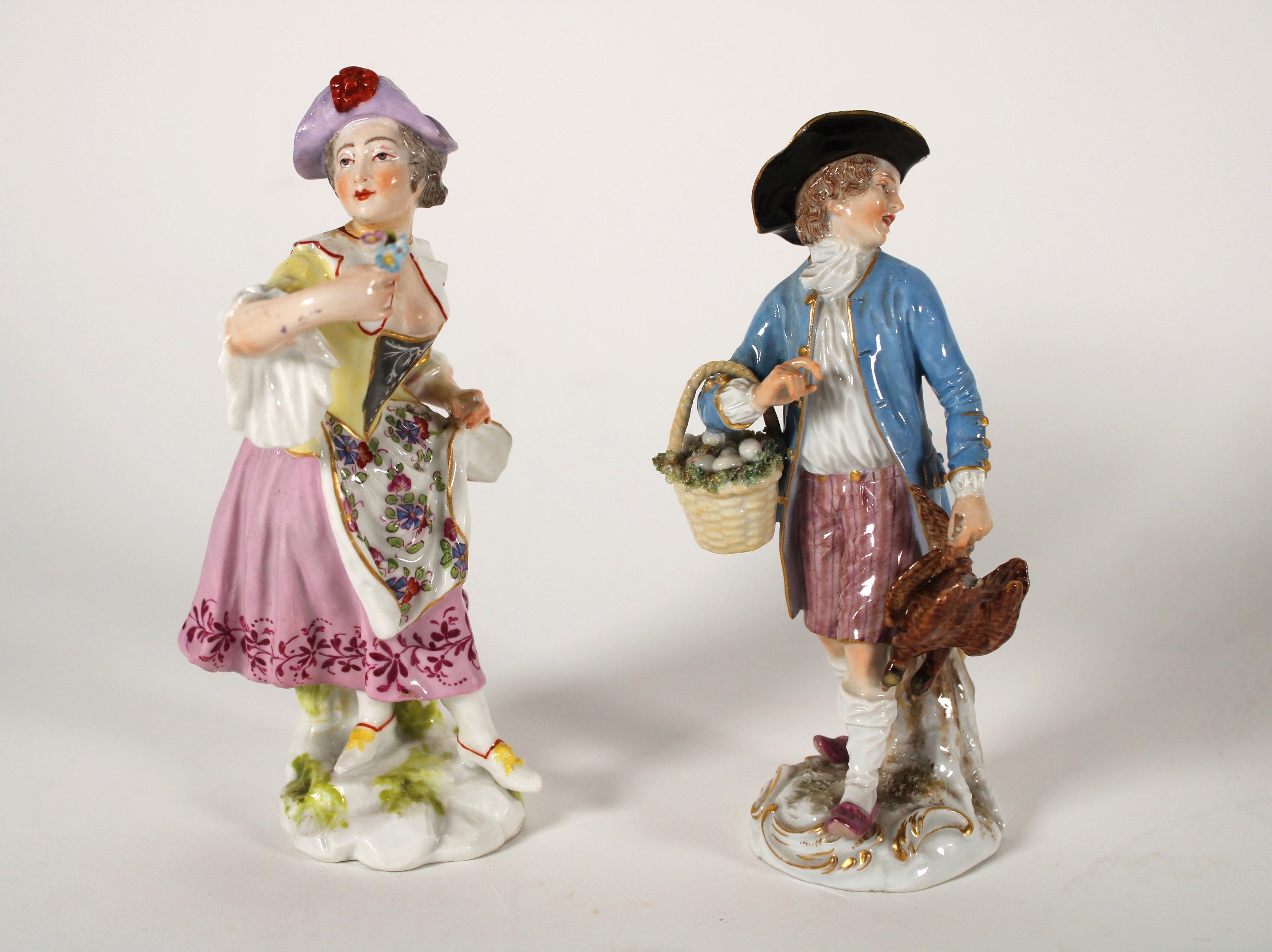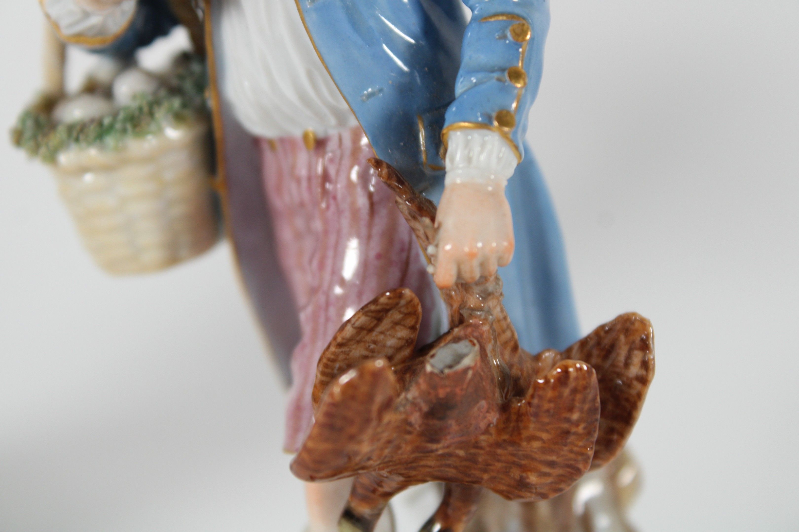 - A young man carrying a basket of eggs. Meissen mark and numbers underneath. (accidents to the birds and to the hat). Height : 13,5 cm