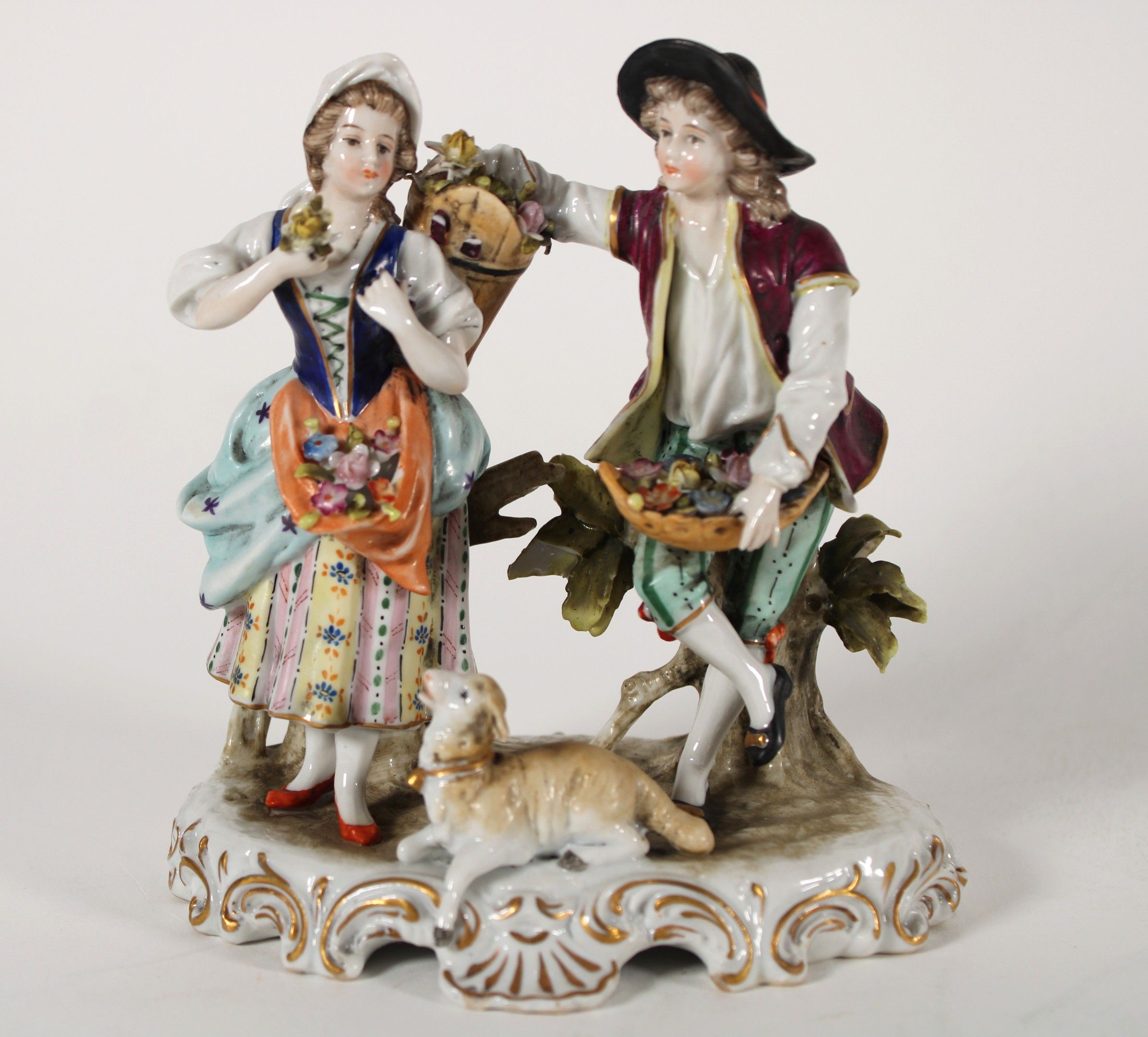 - A group showing two figures with flowers and a lamb. Mark in blue on the underside. Height : 13,5 cm