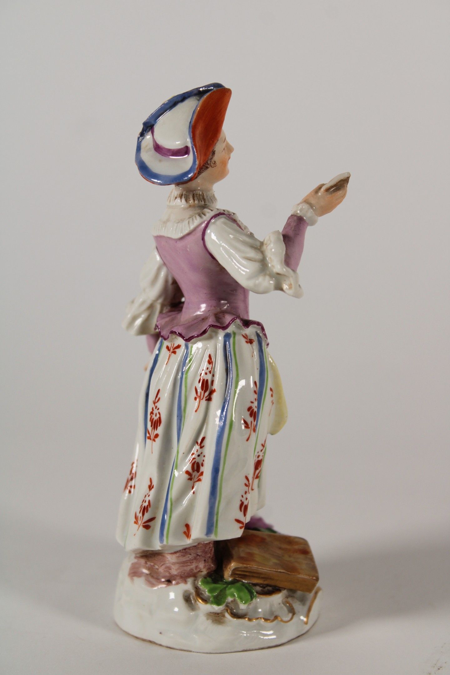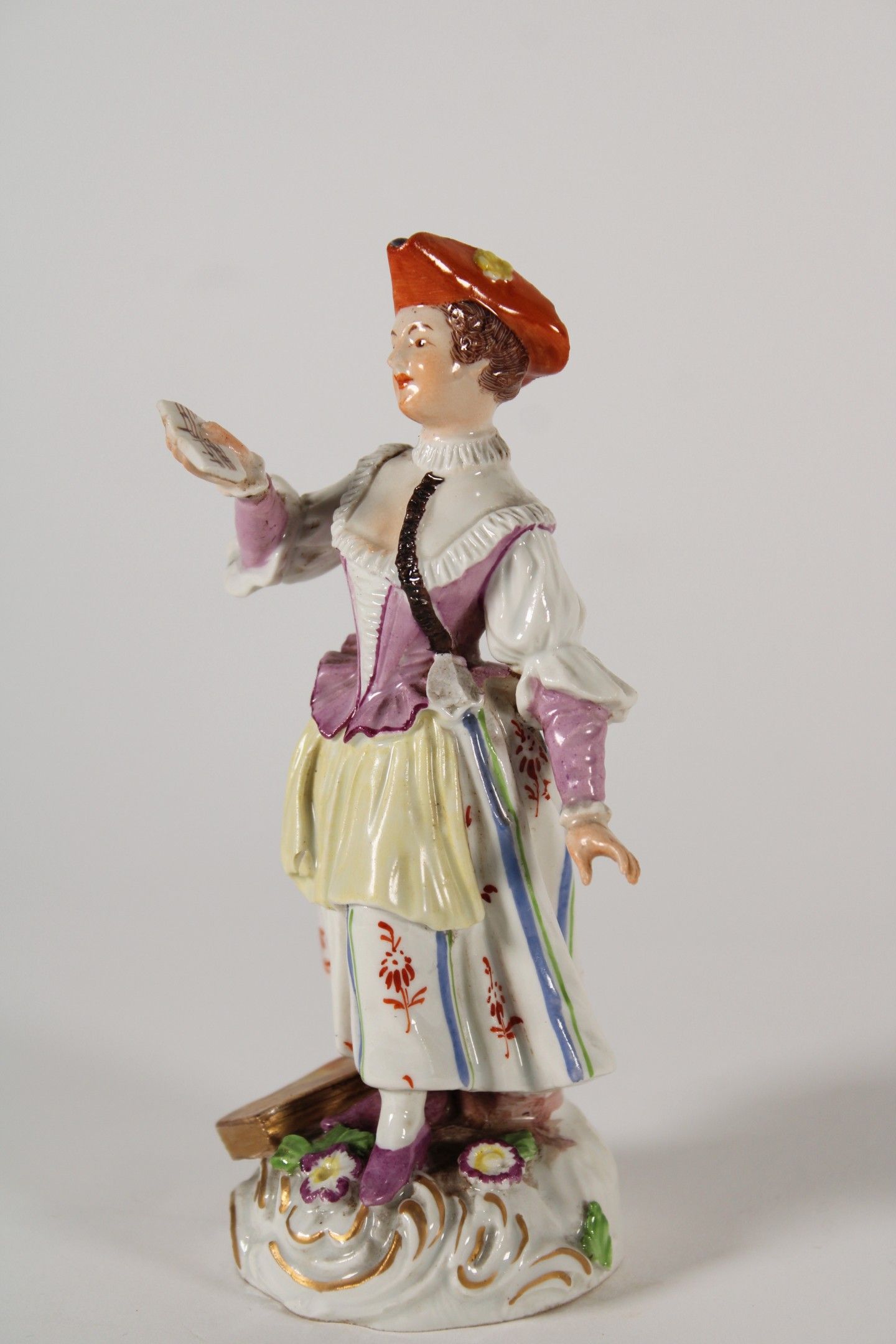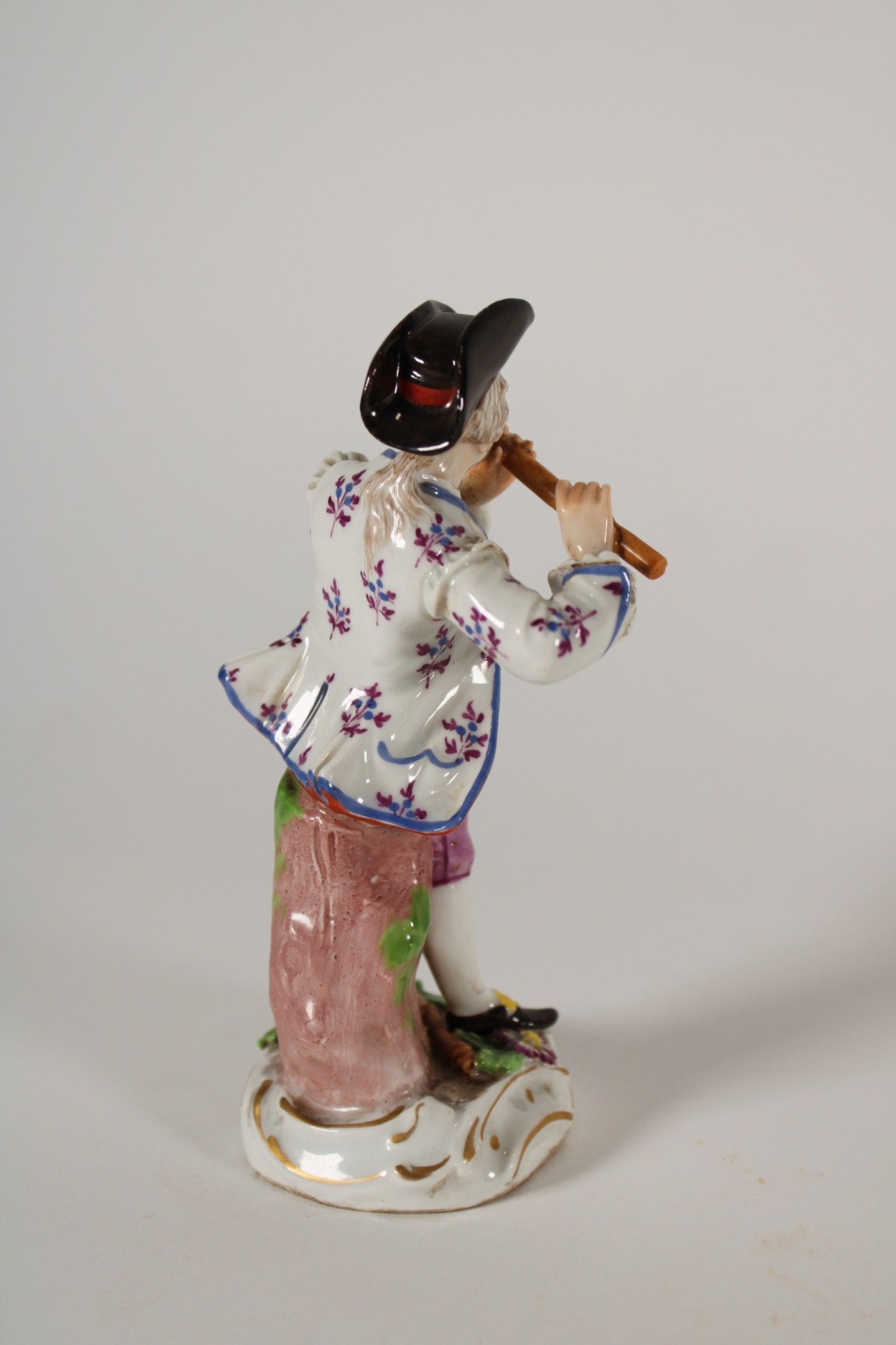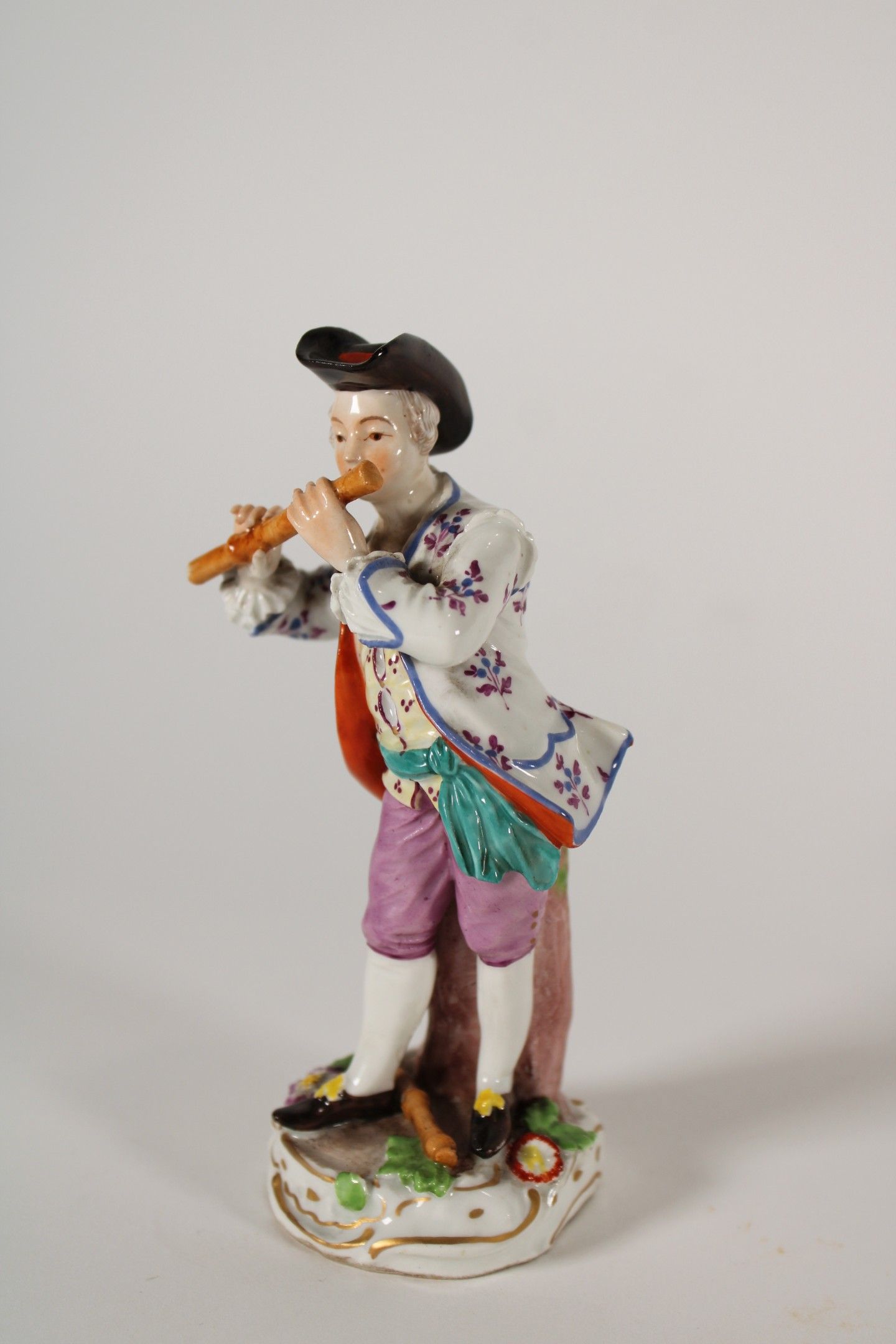 Two polychrome and gilt enamelled porcelain figures, one a man playing a flute and the other a woman holding a sheet of music.