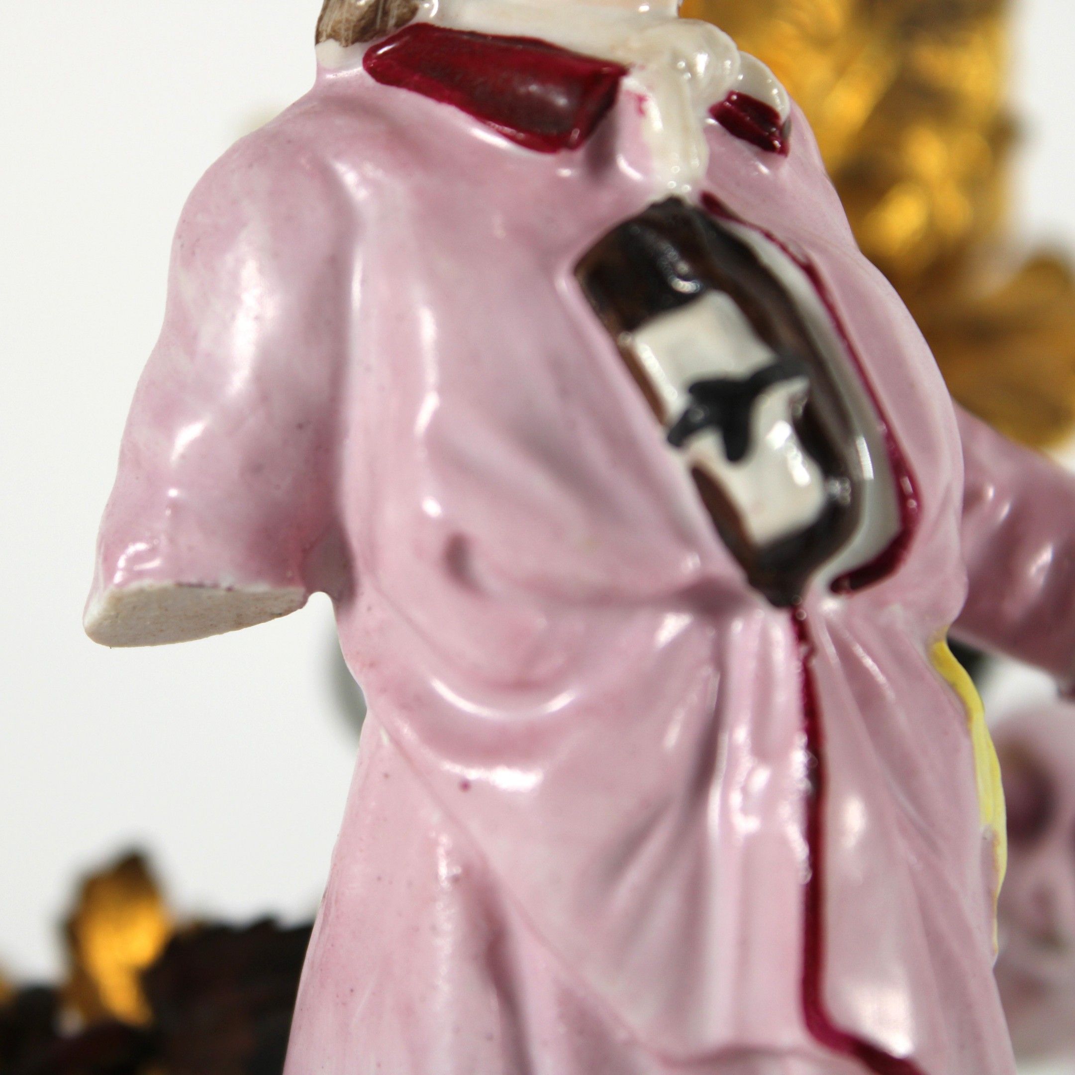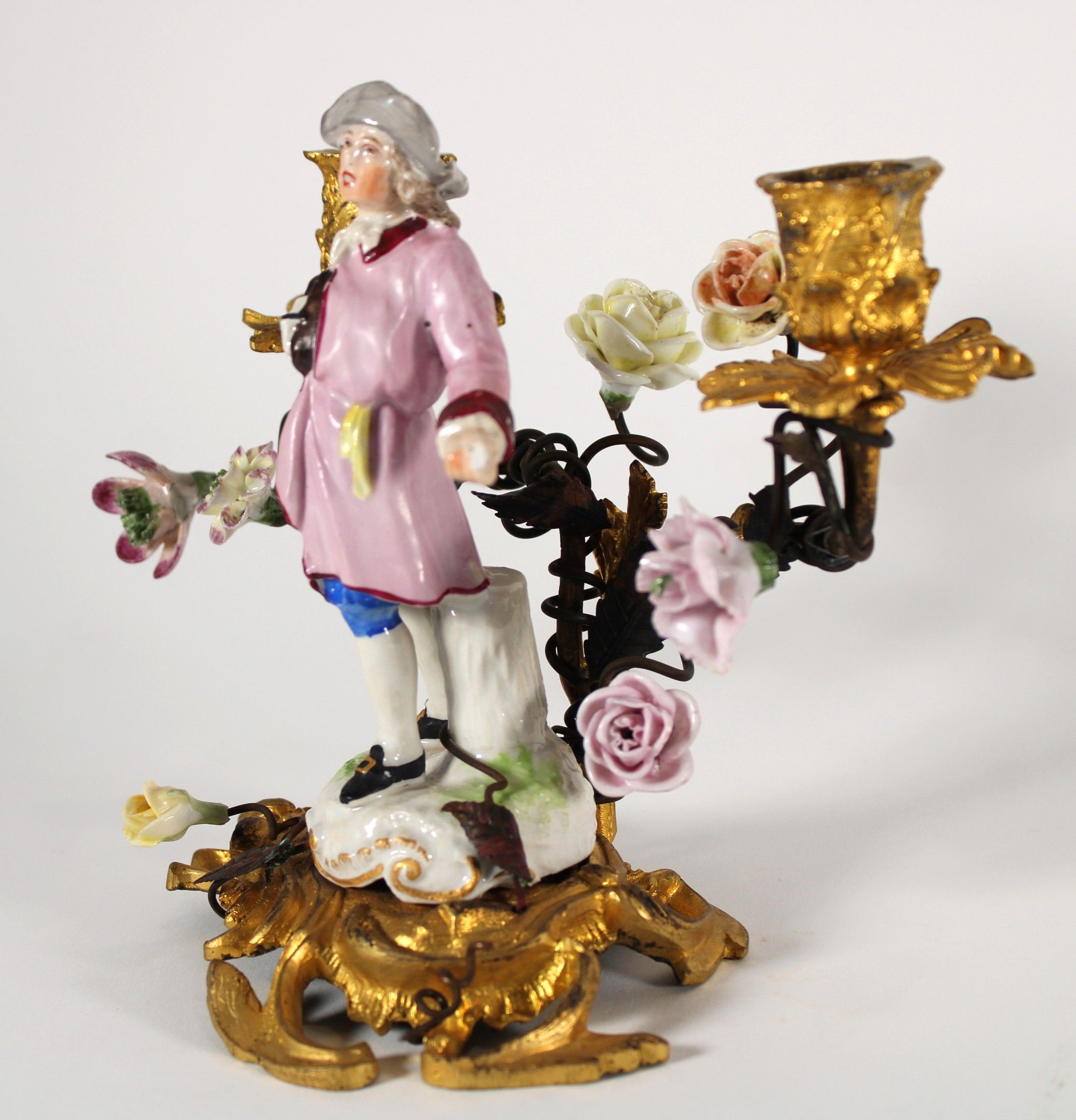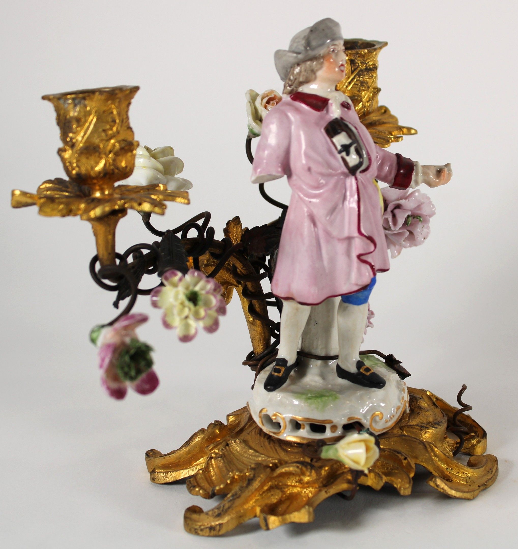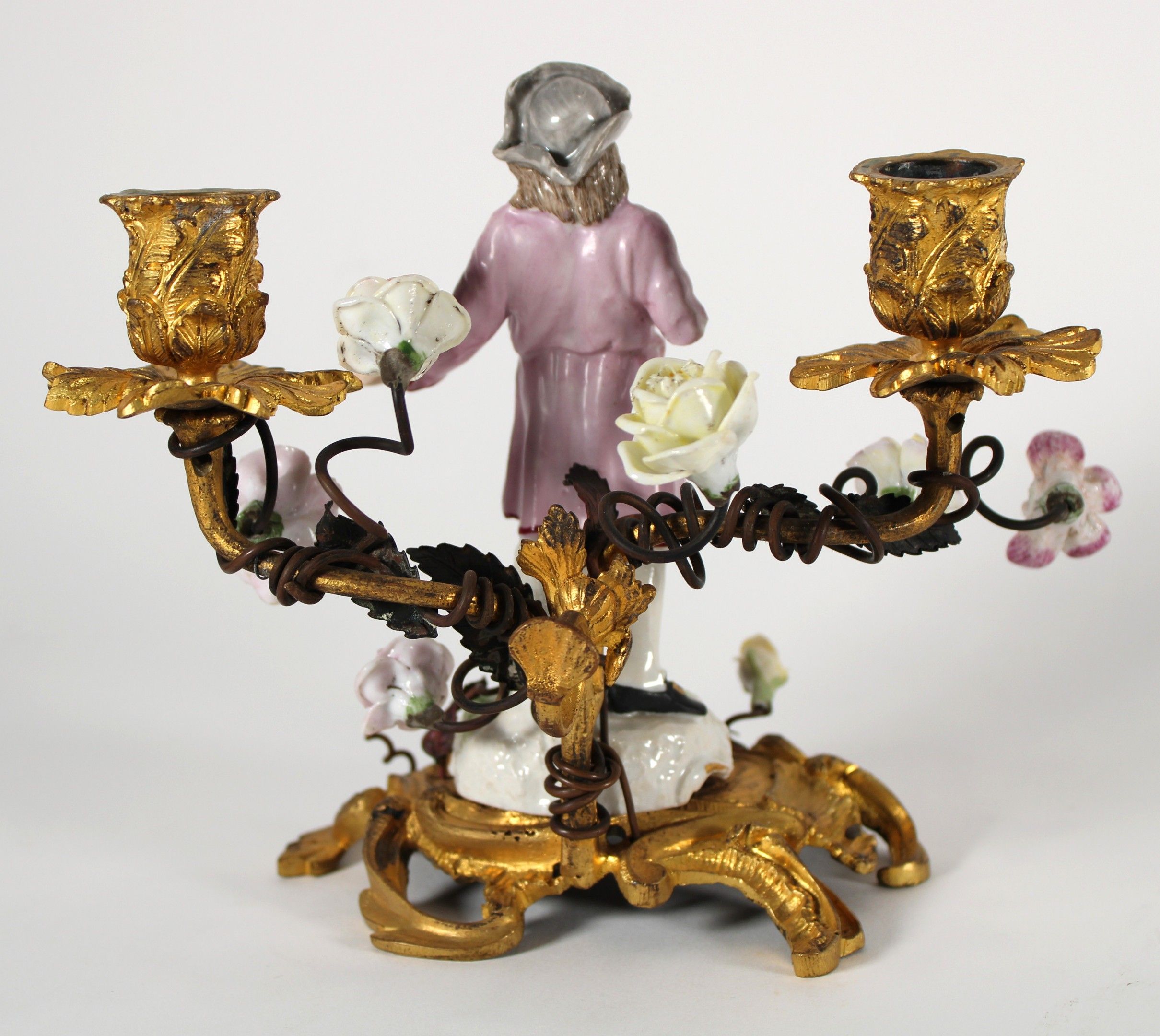 A chased gilt bronze two-light candlestick with rocaille decoration featuring a central figure in porcelain probably by MEISSEN, decorated with porcelain flowers mounted on metal stems.