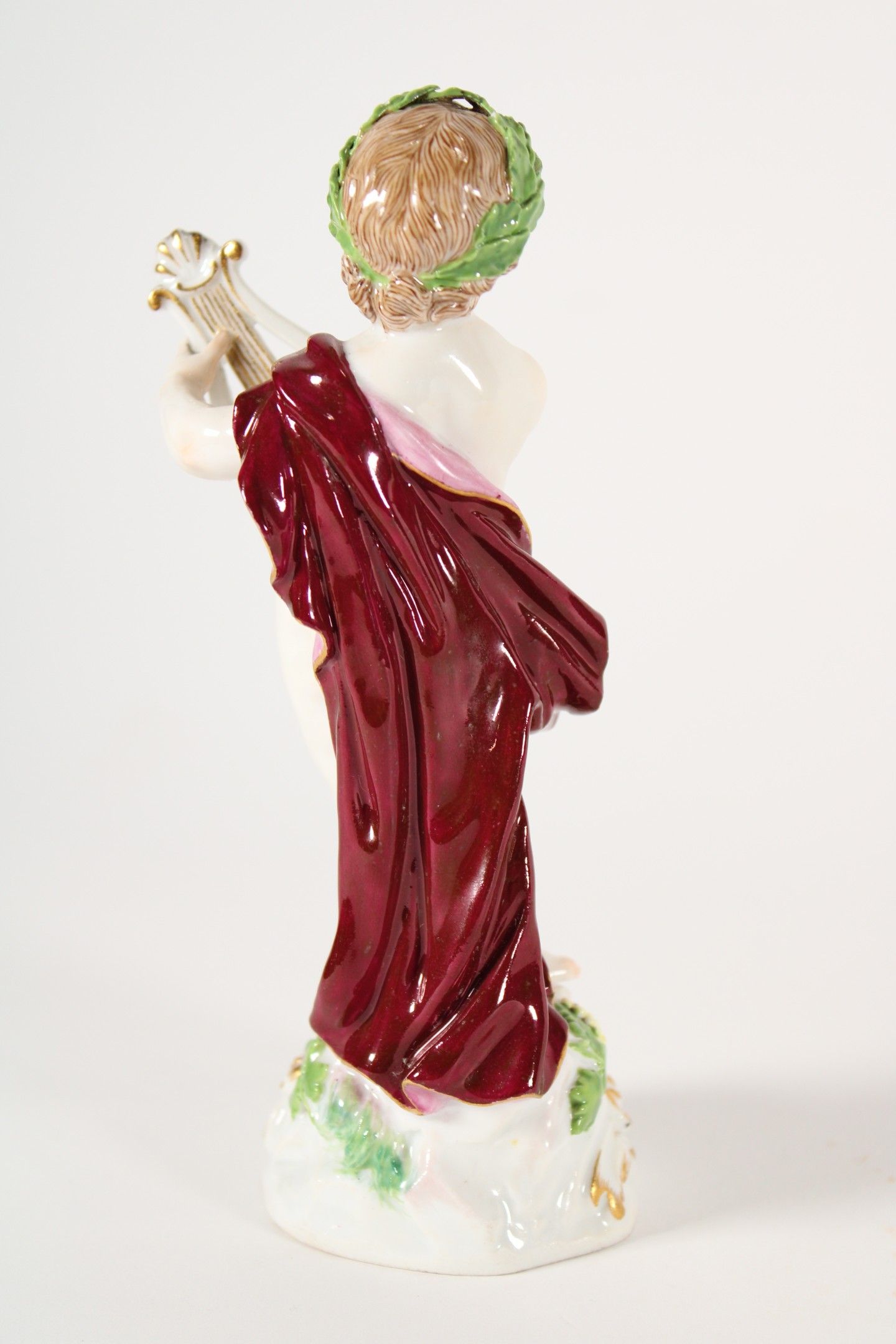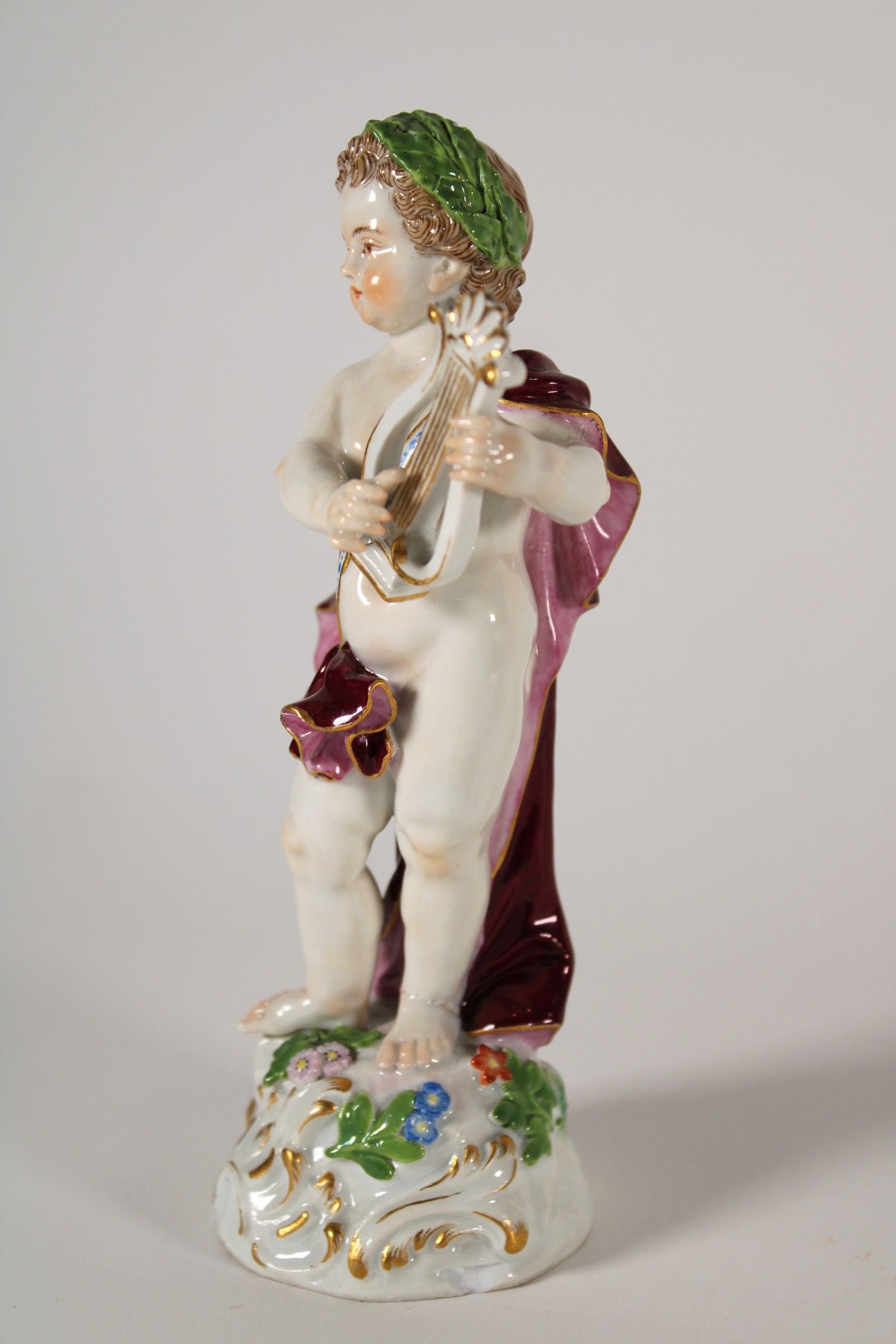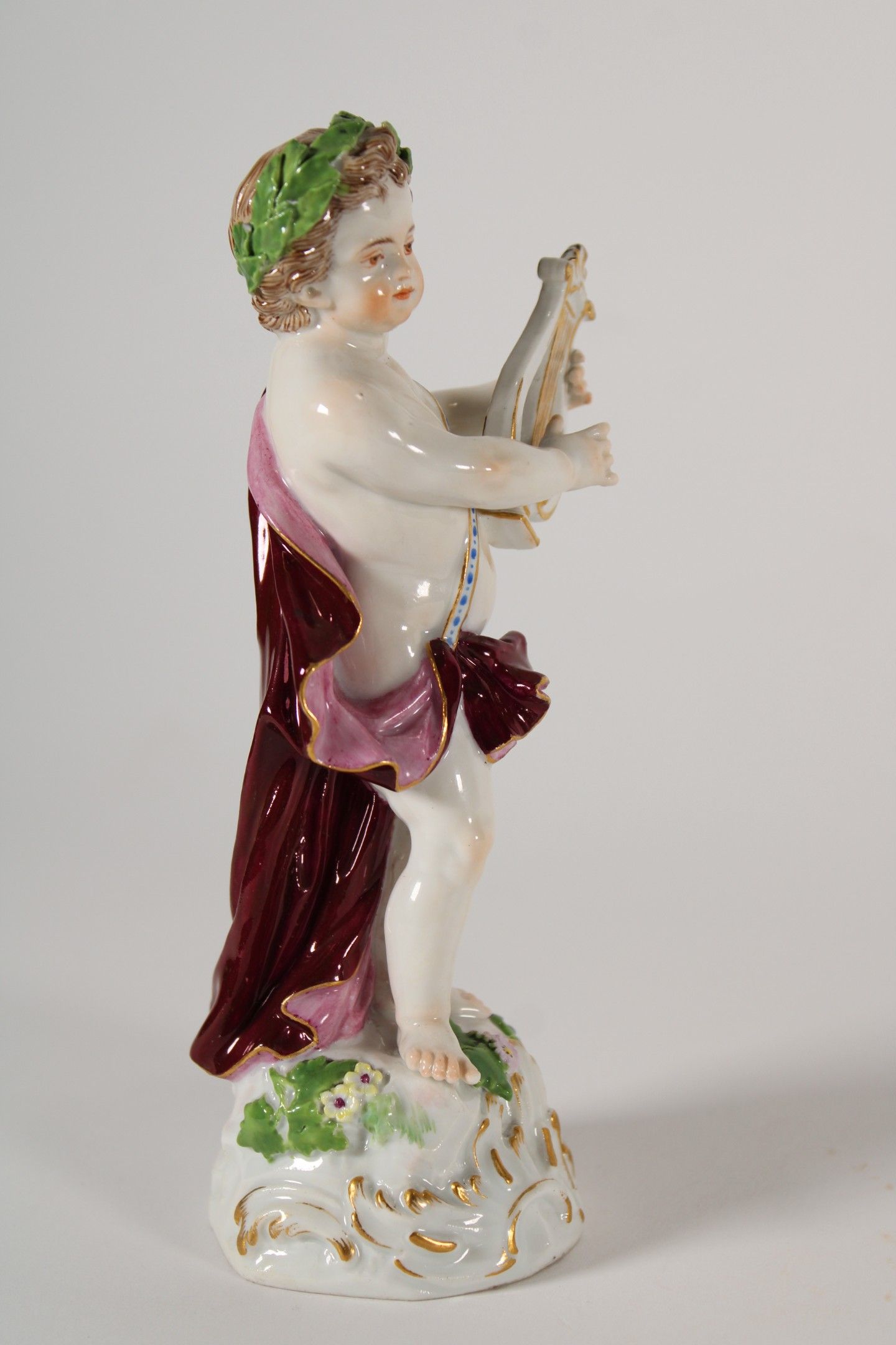 A polychrome enamelled porcelain subject with gold highlights depicting a putto playing a lyre.