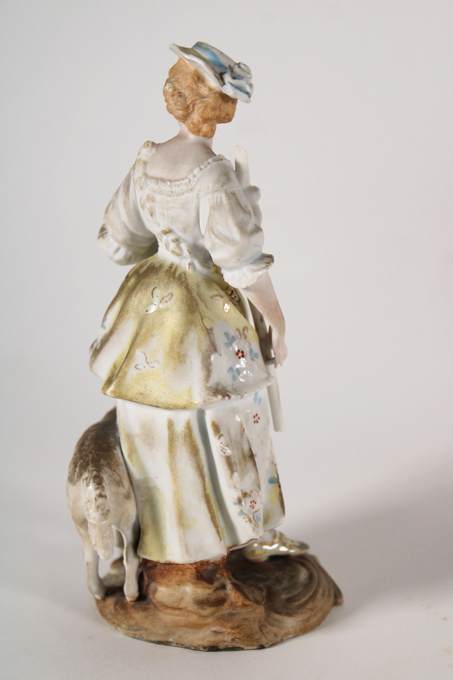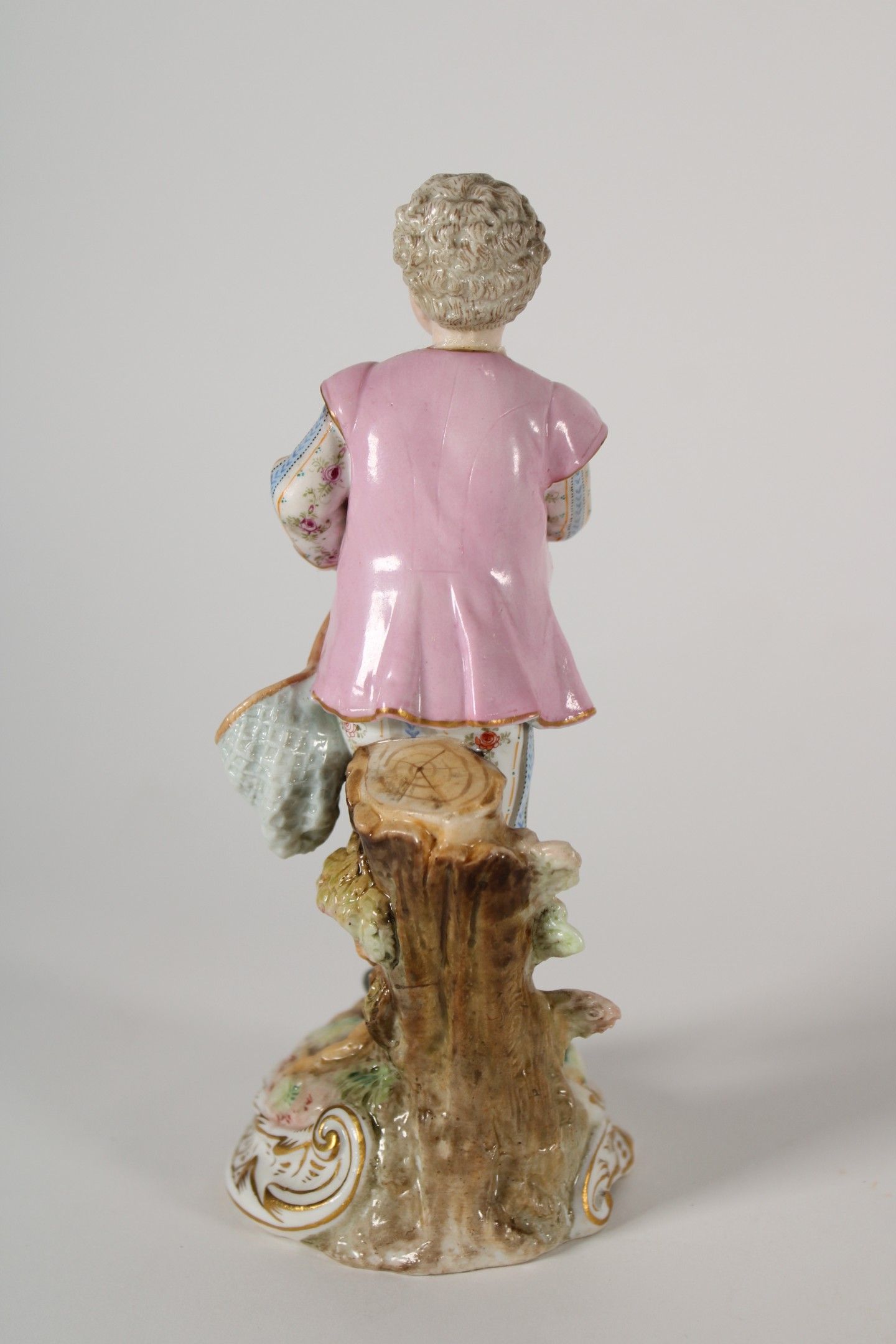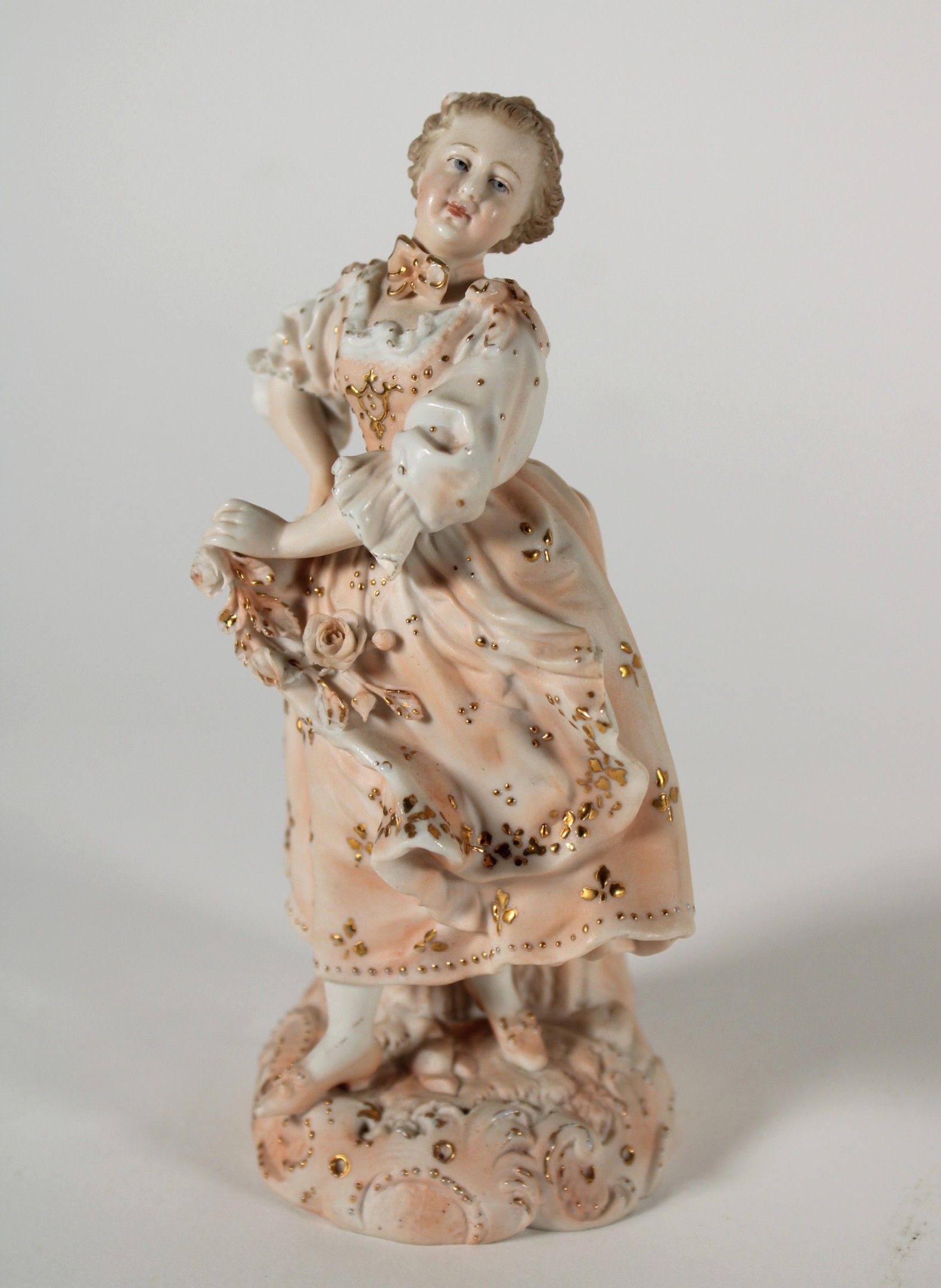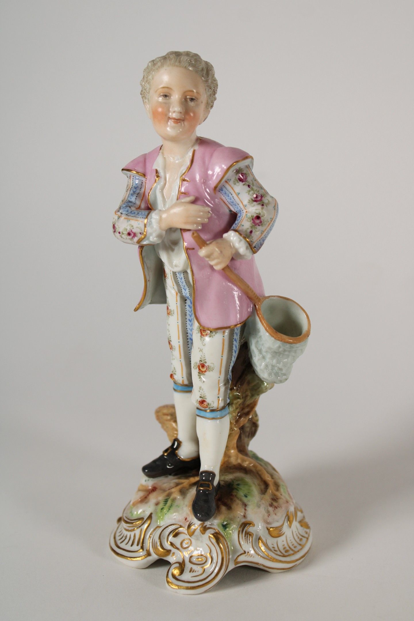Four polychrome and gilt enamelled porcelain and biscuit subjects depicting four figures including a shepherdess, a young woman dancing, a young woman with a mask and a young boy holding a butterfly net.