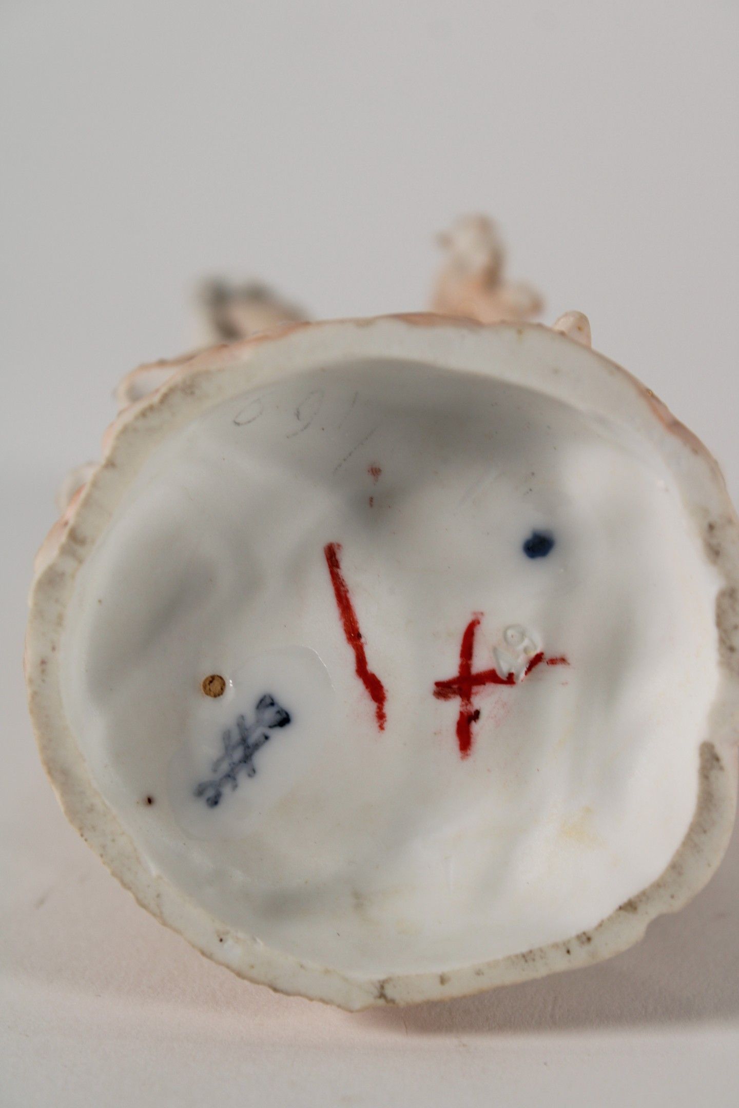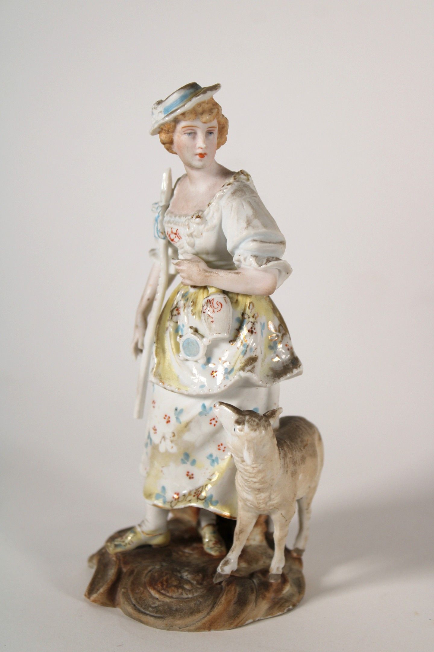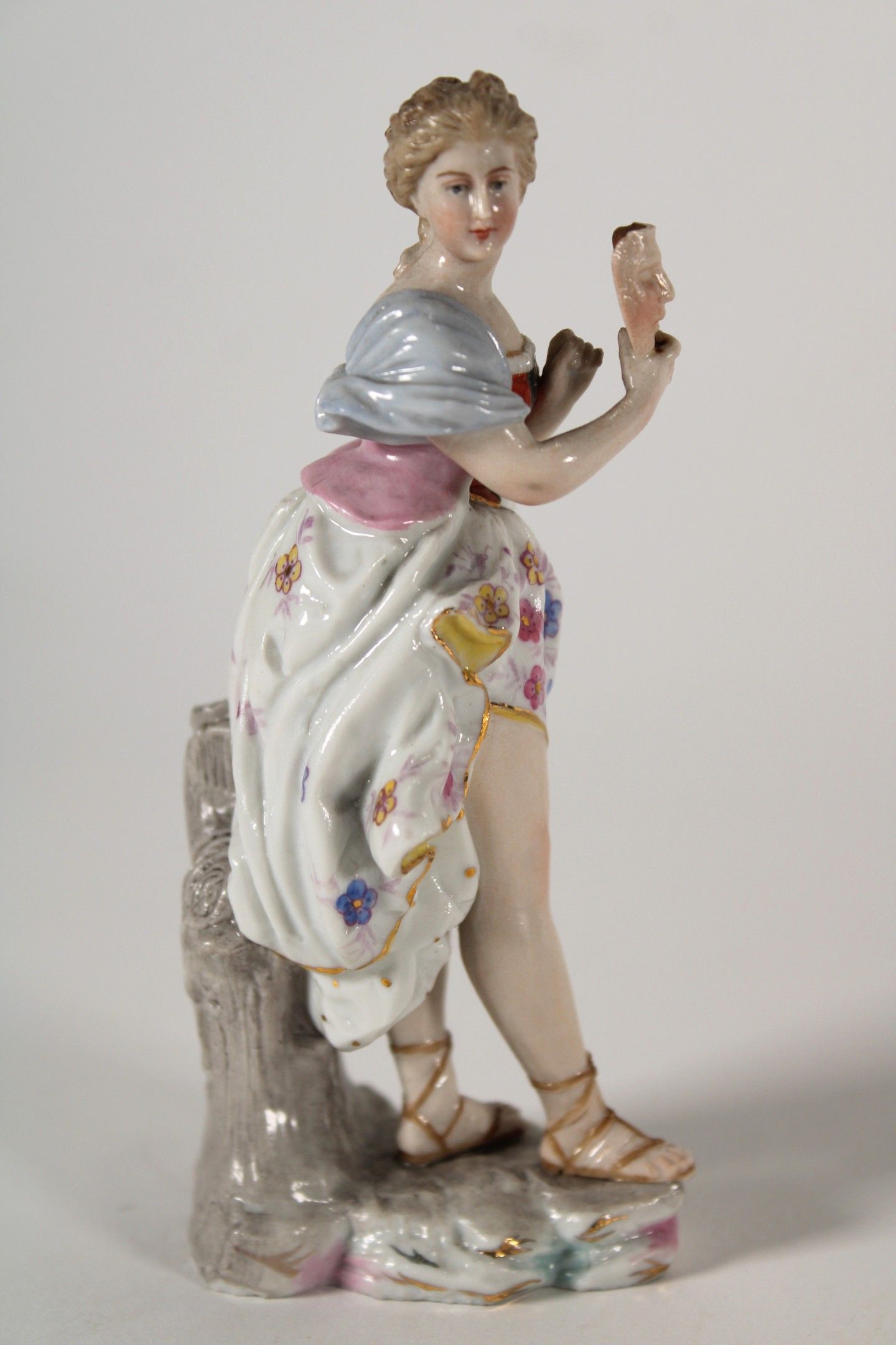 Four polychrome and gilt enamelled porcelain and biscuit subjects depicting four figures including a shepherdess, a young woman dancing, a young woman with a mask and a young boy holding a butterfly net.