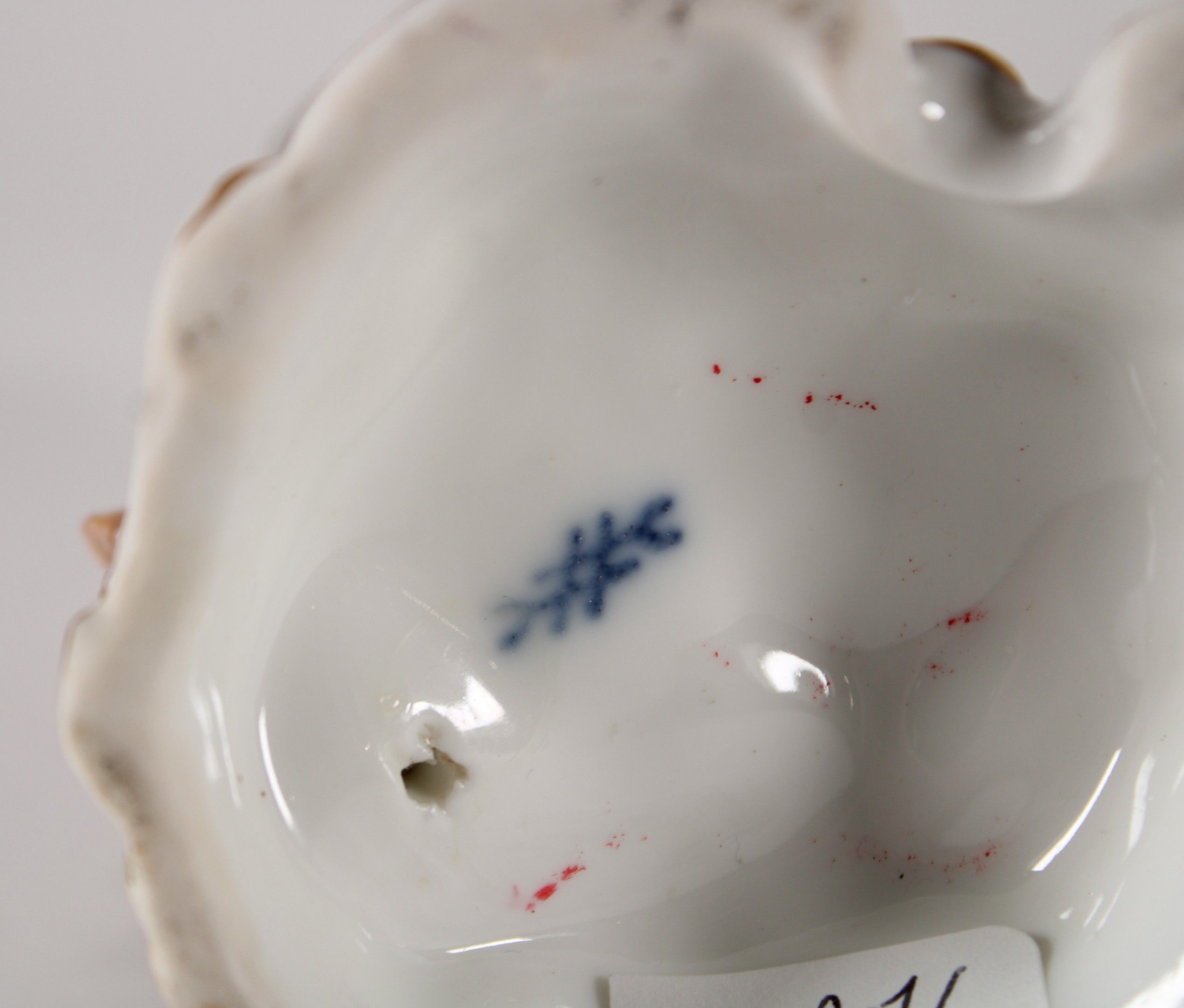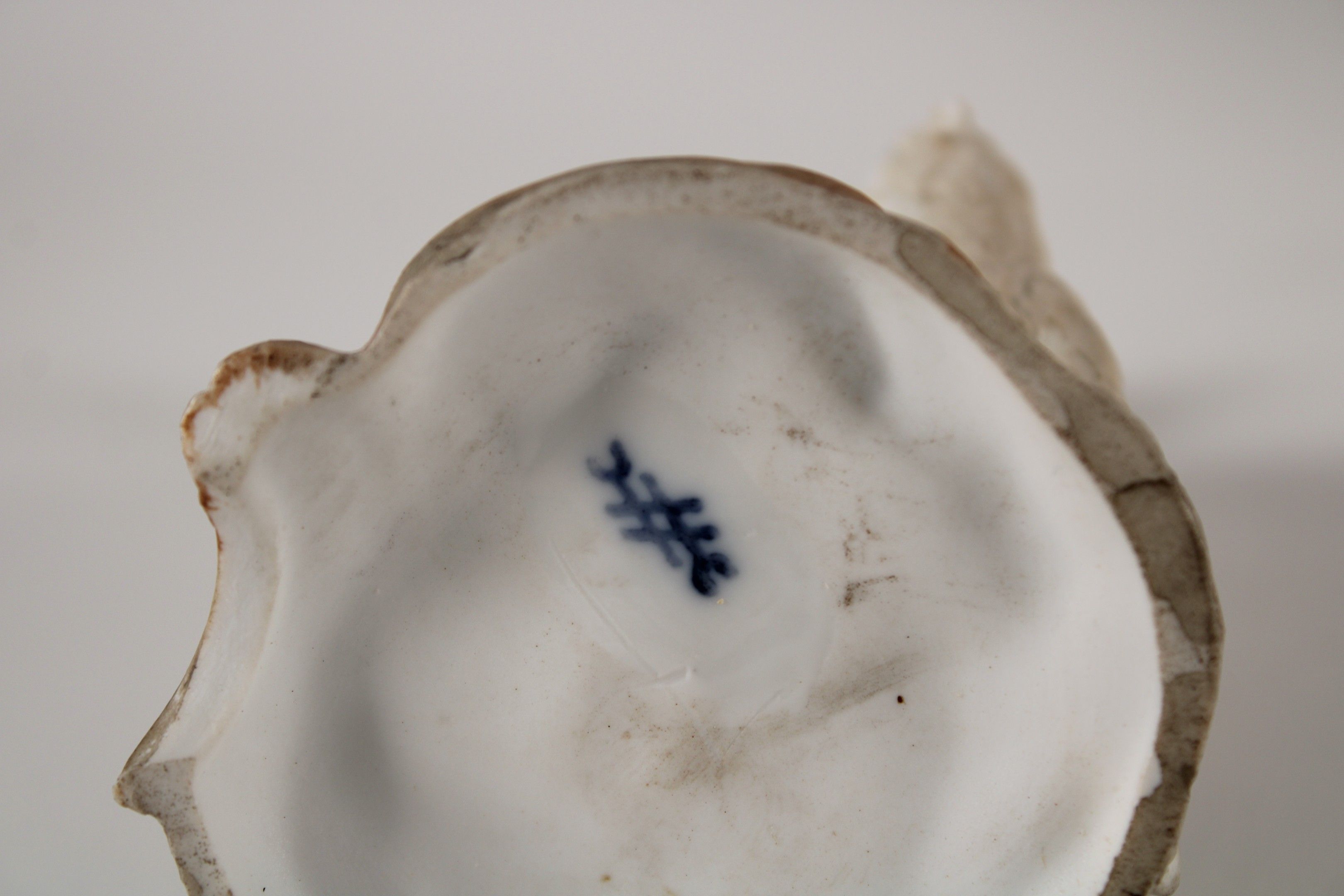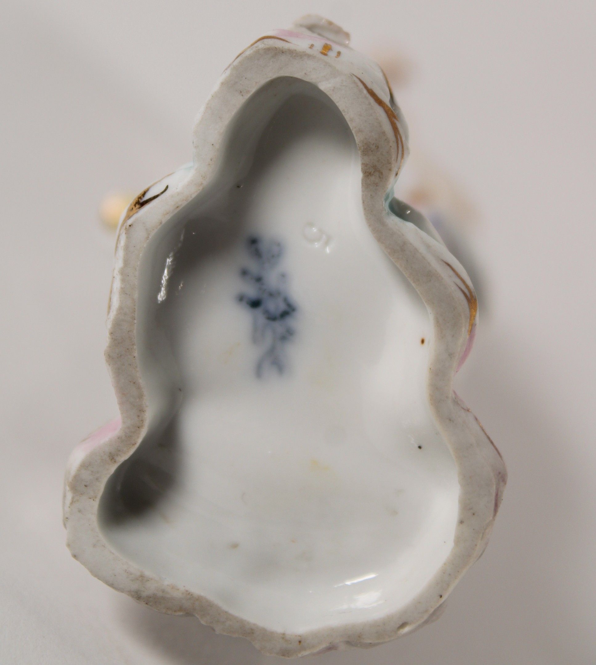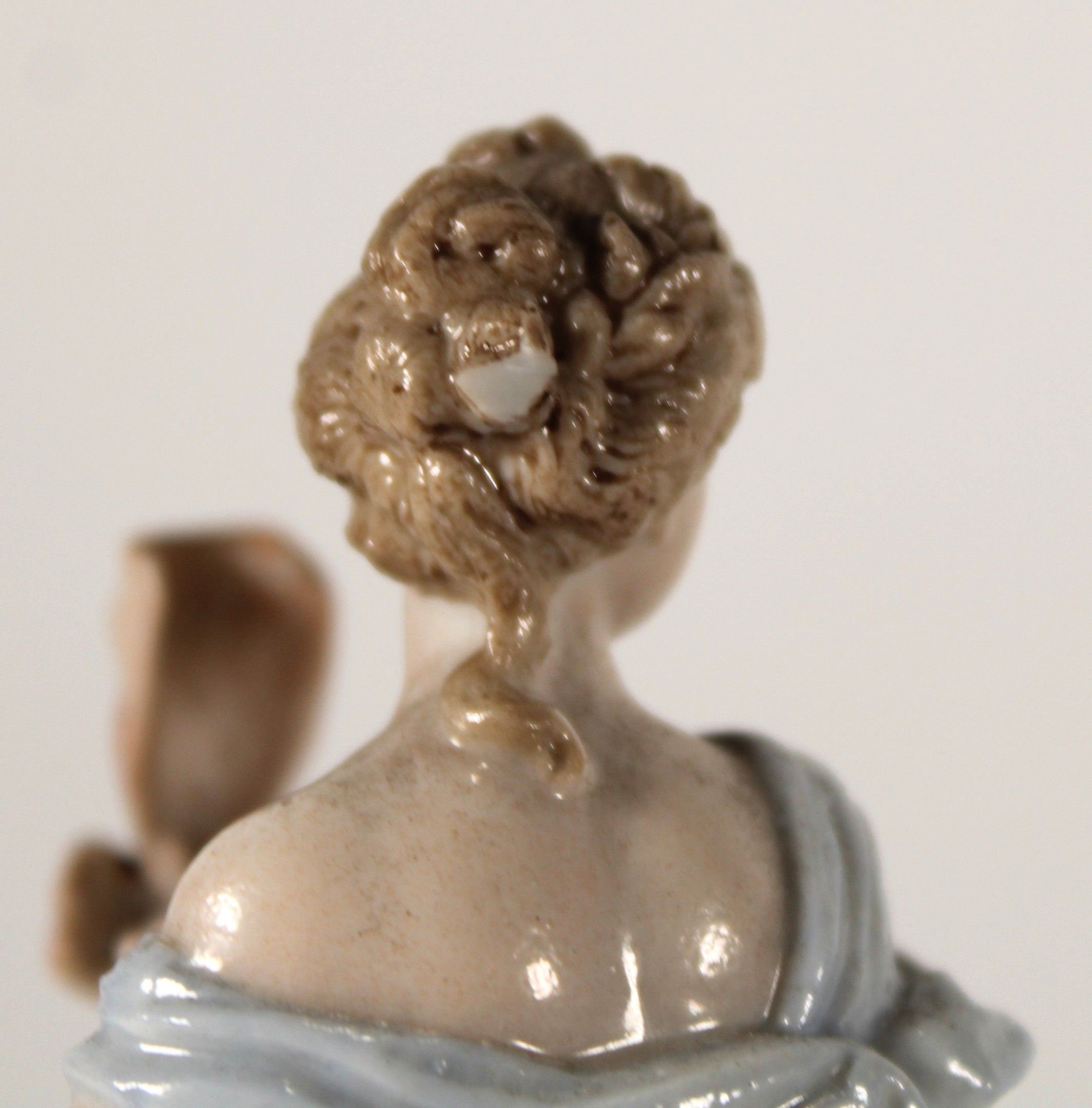 Four polychrome and gilt enamelled porcelain and biscuit subjects depicting four figures including a shepherdess, a young woman dancing, a young woman with a mask and a young boy holding a butterfly net.
