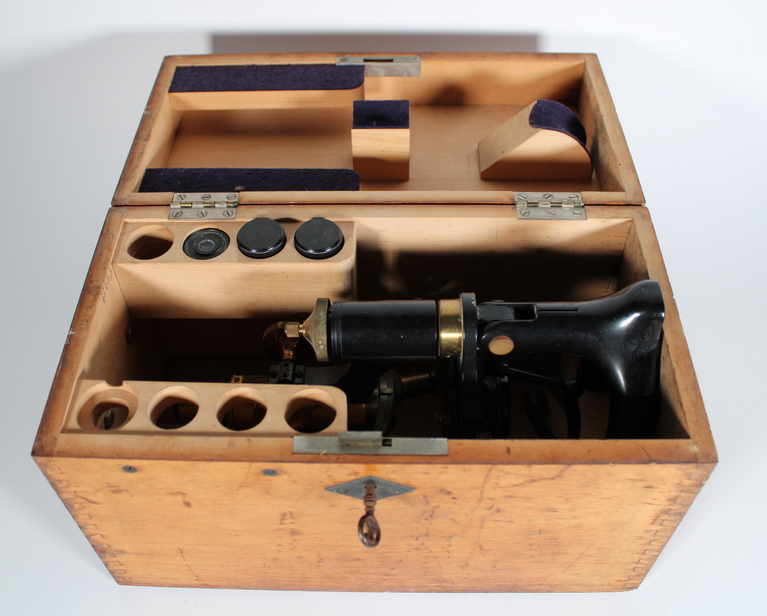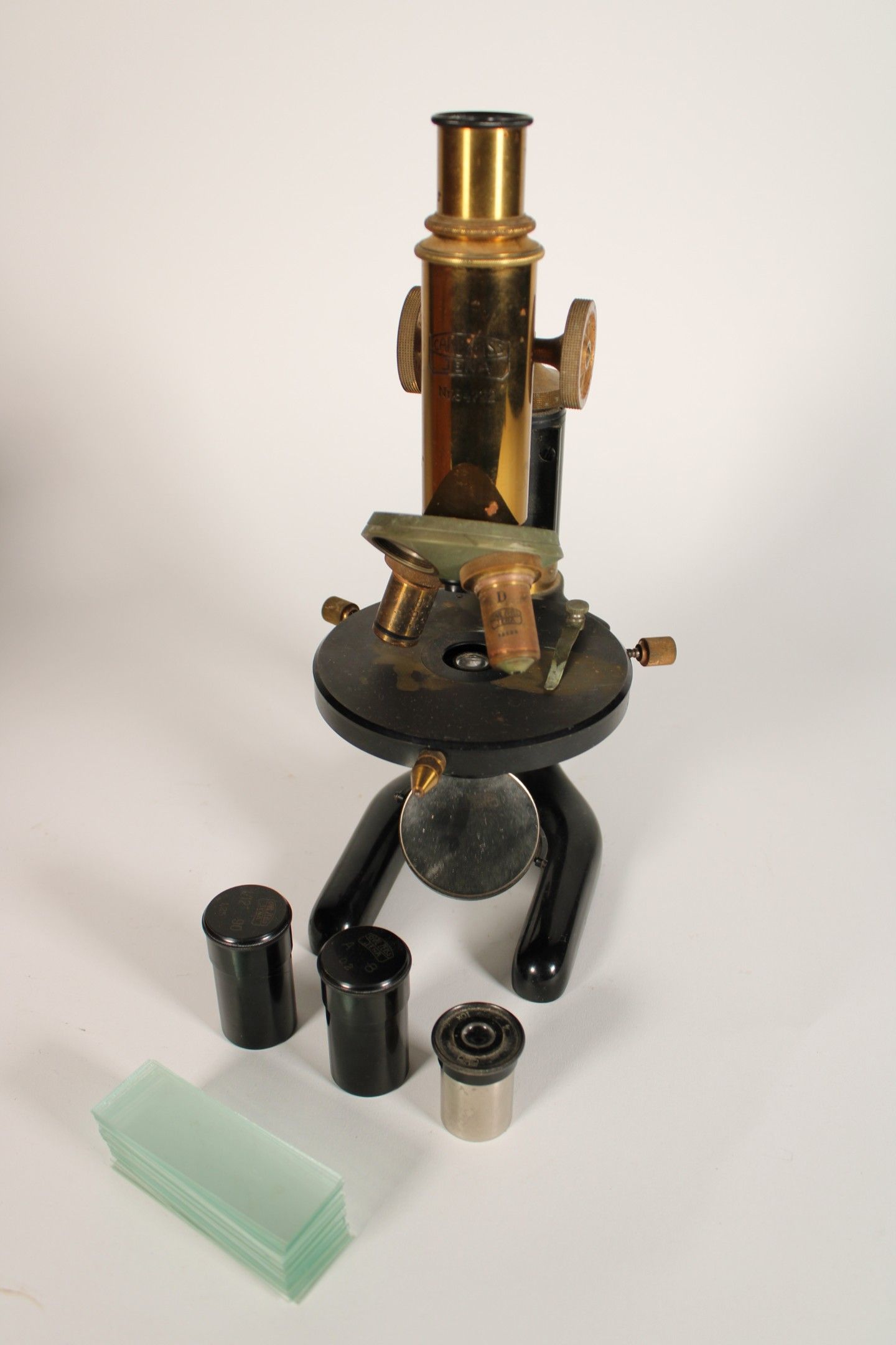 Copper monocular microscope, No. 84722. In original box with key, various accessories and a set of plates.