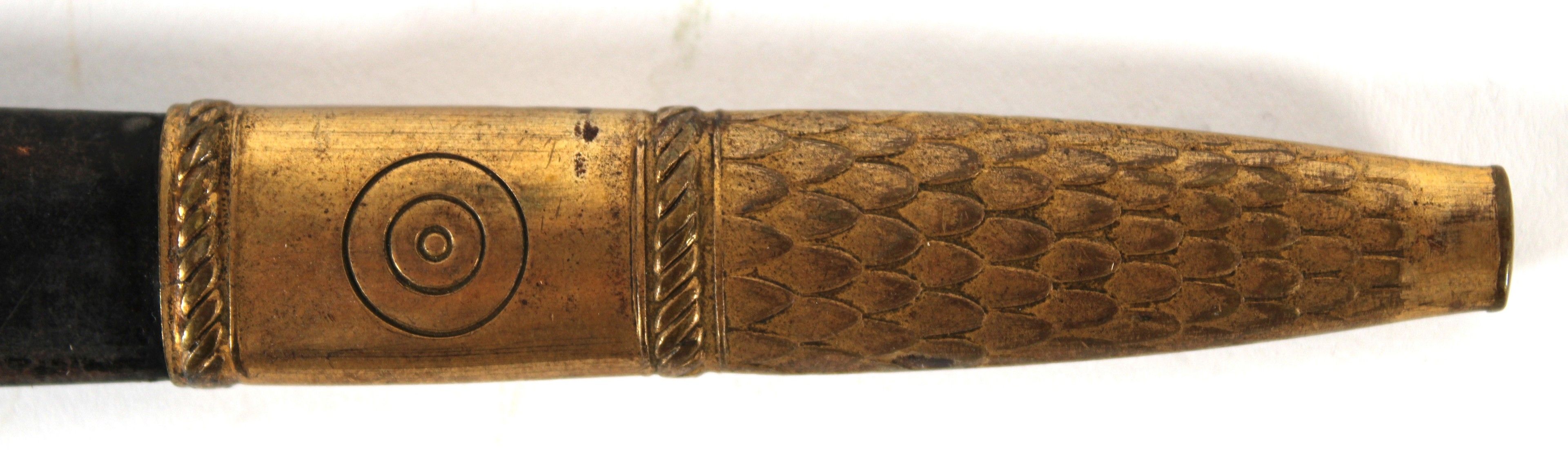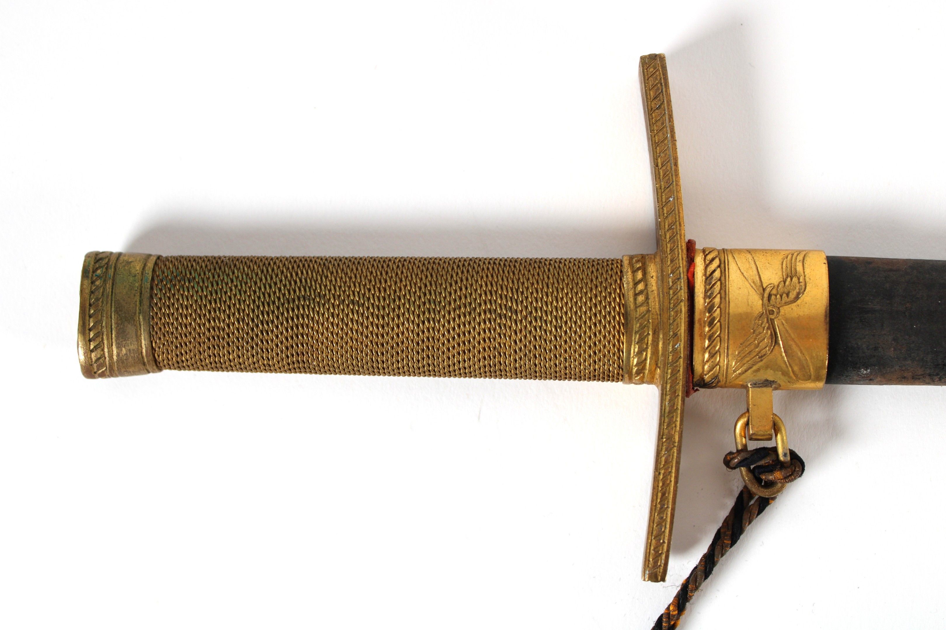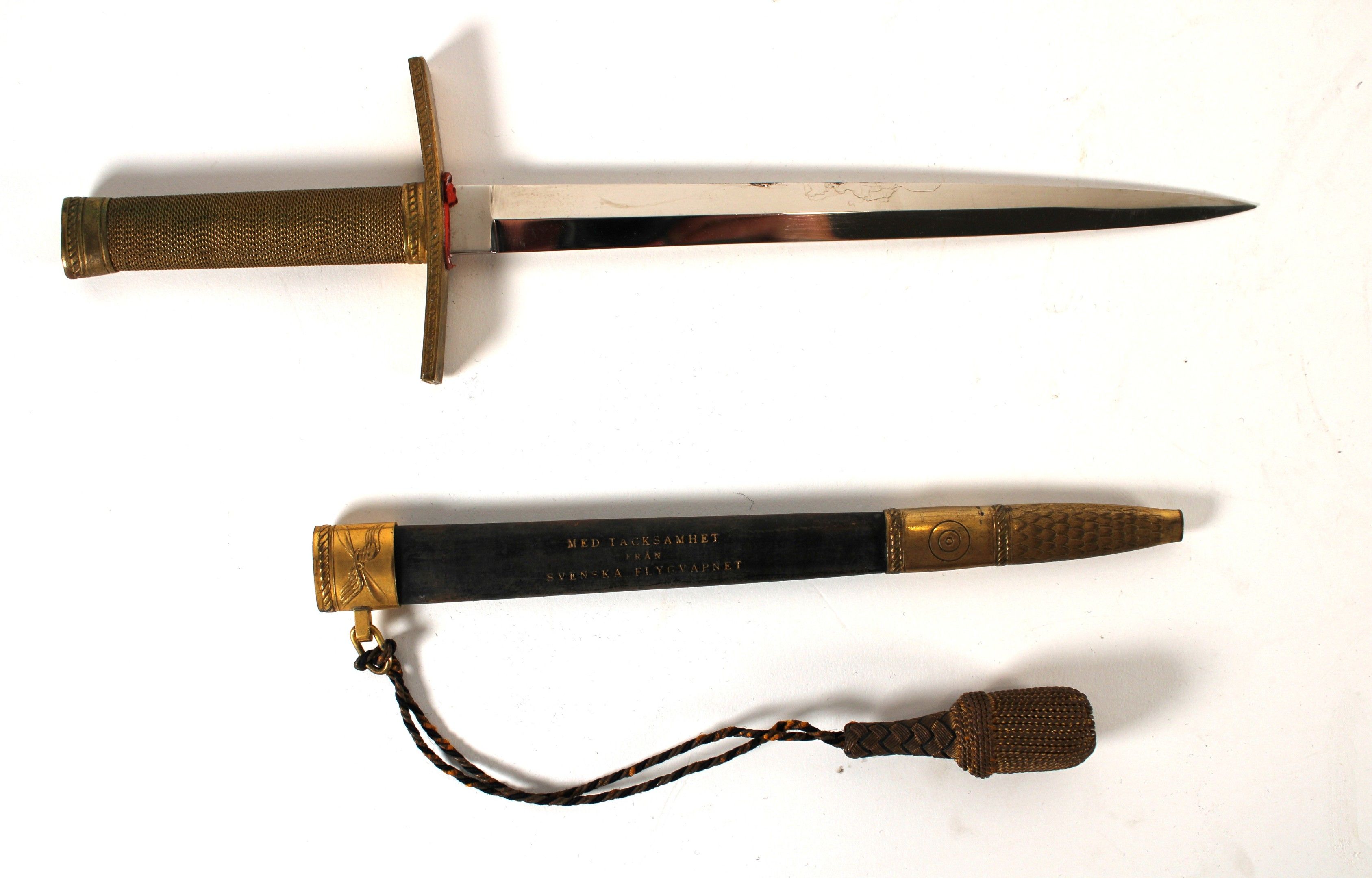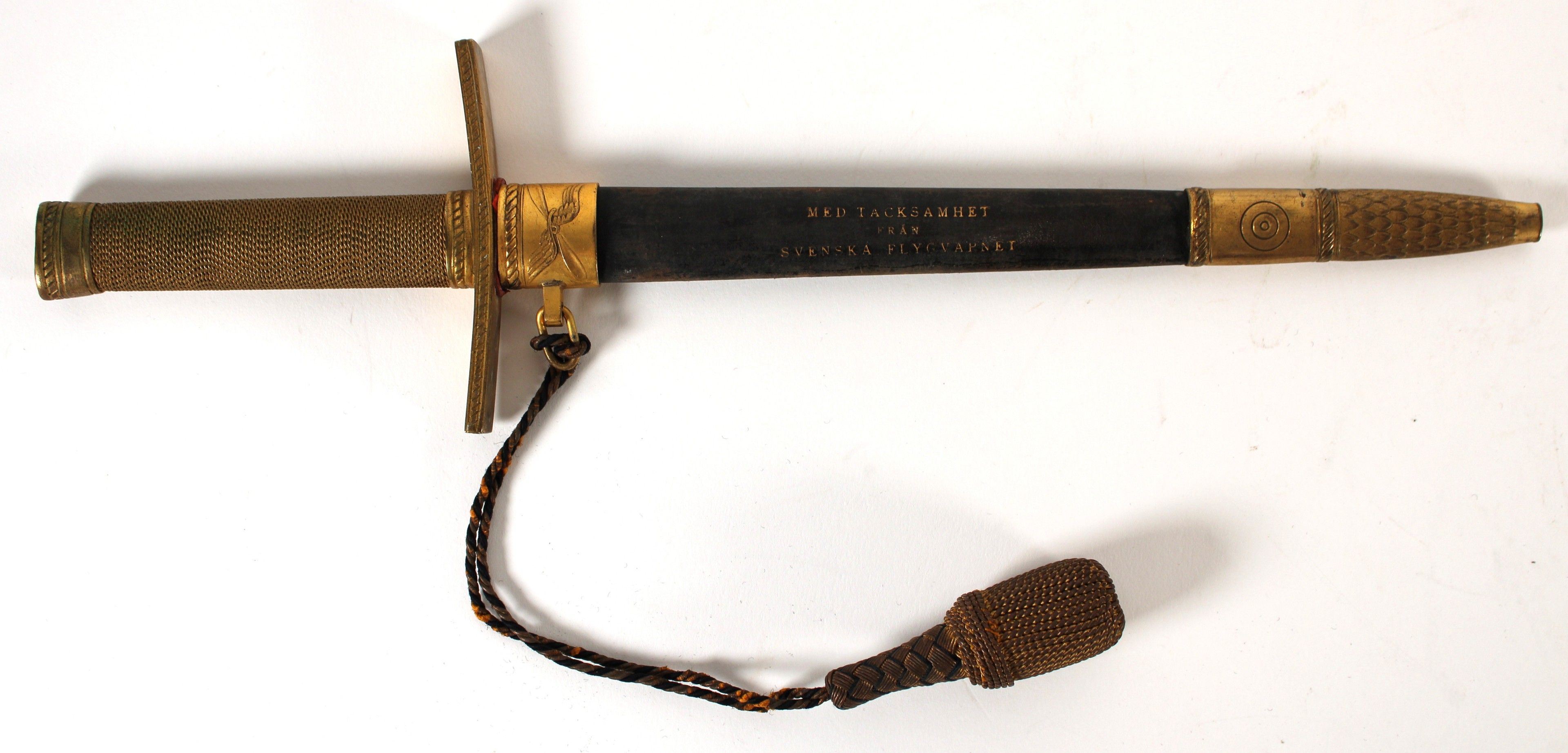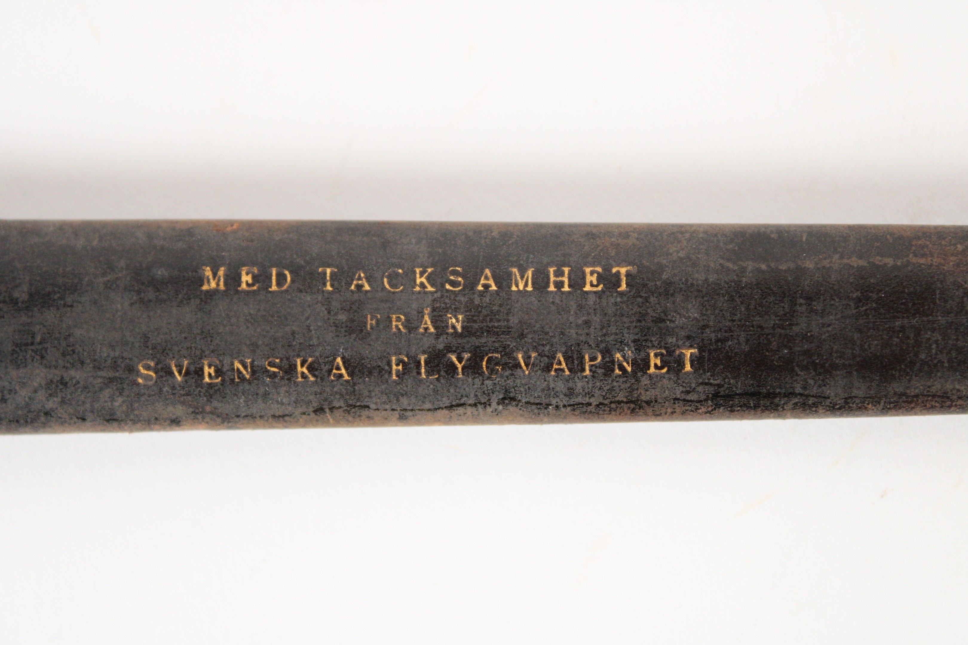 Scabbard marked in gold "MED TACKSAMHET FRÅN SVENSKA FLYGVAPNET" ("With gratitude on behalf of the Swedish Air Force") with two gilt brass fittings.