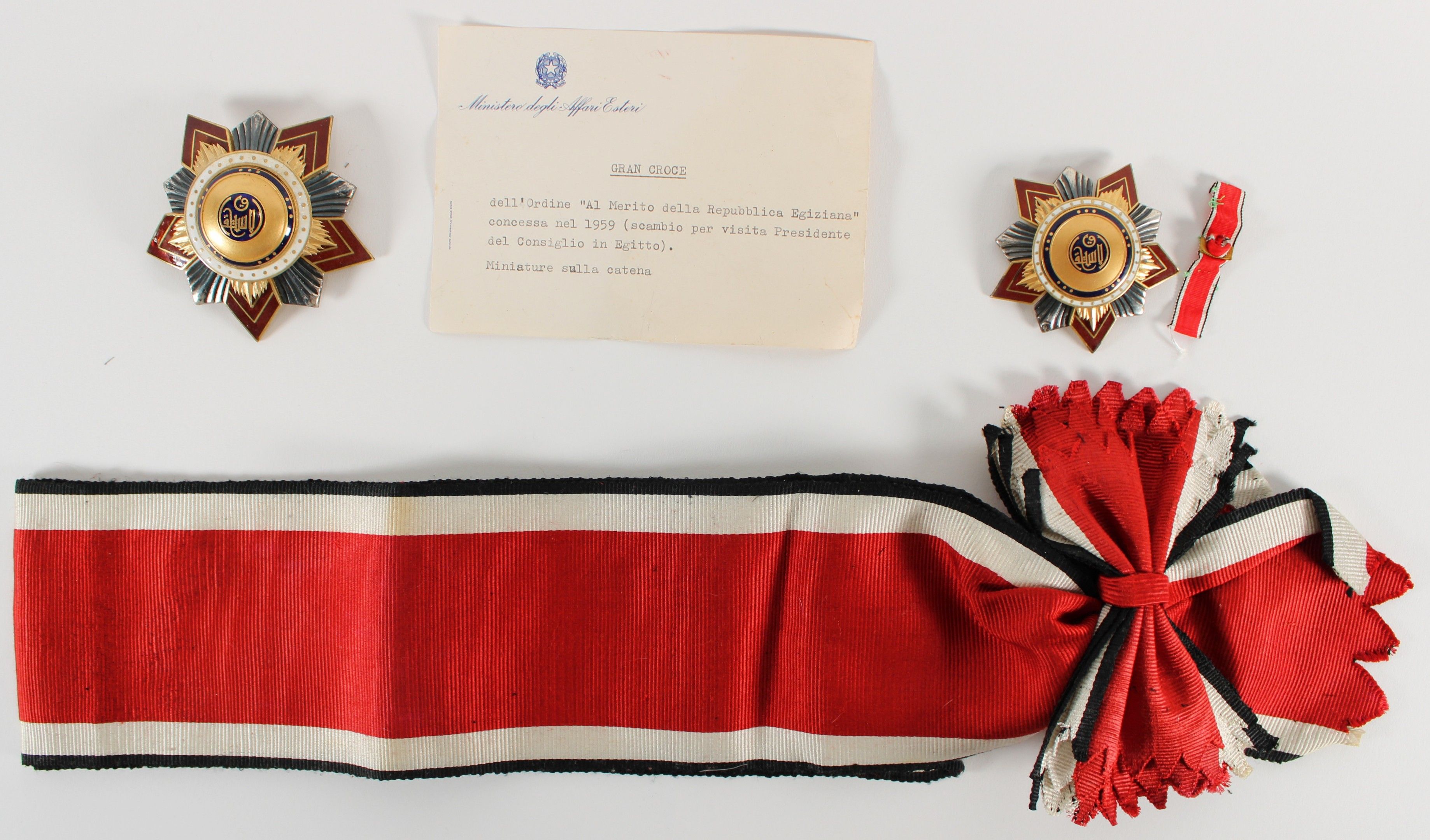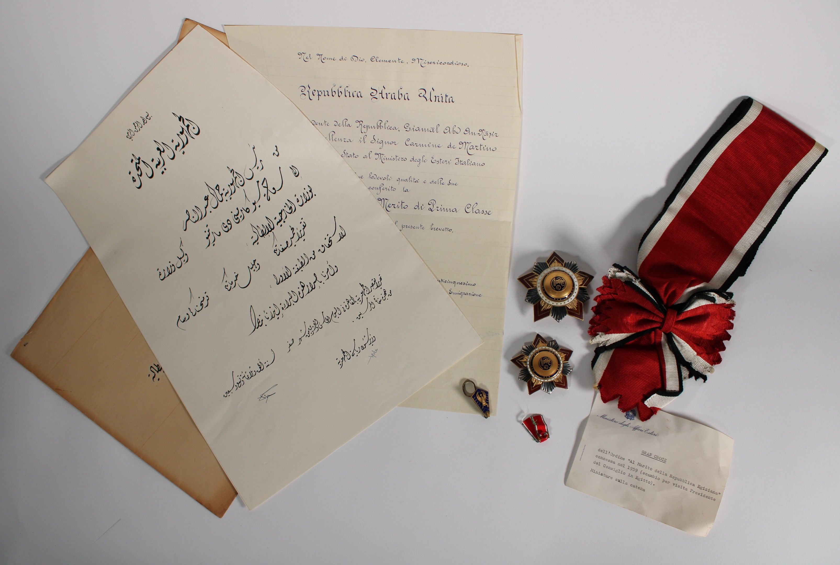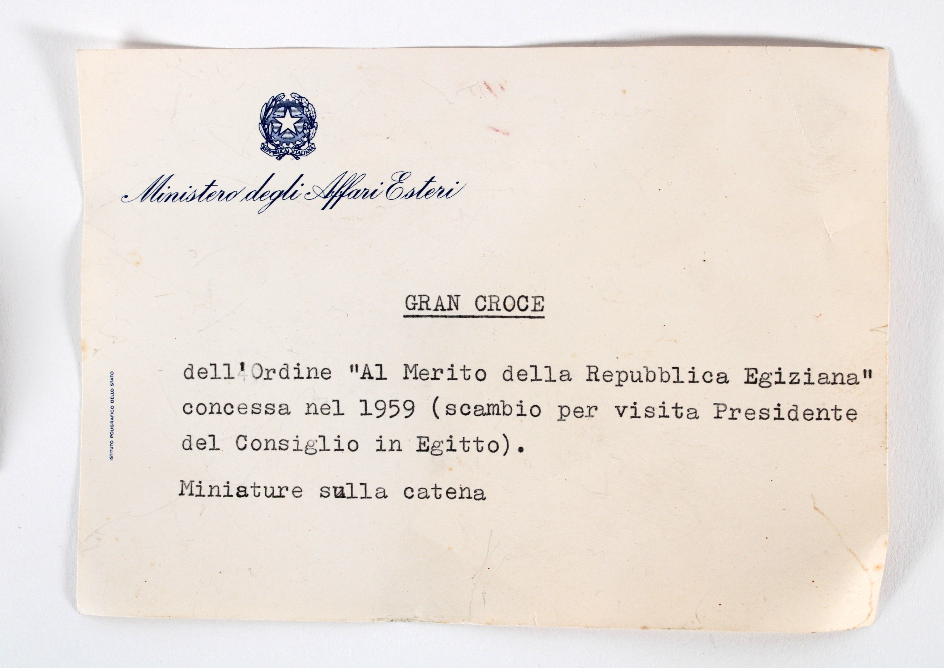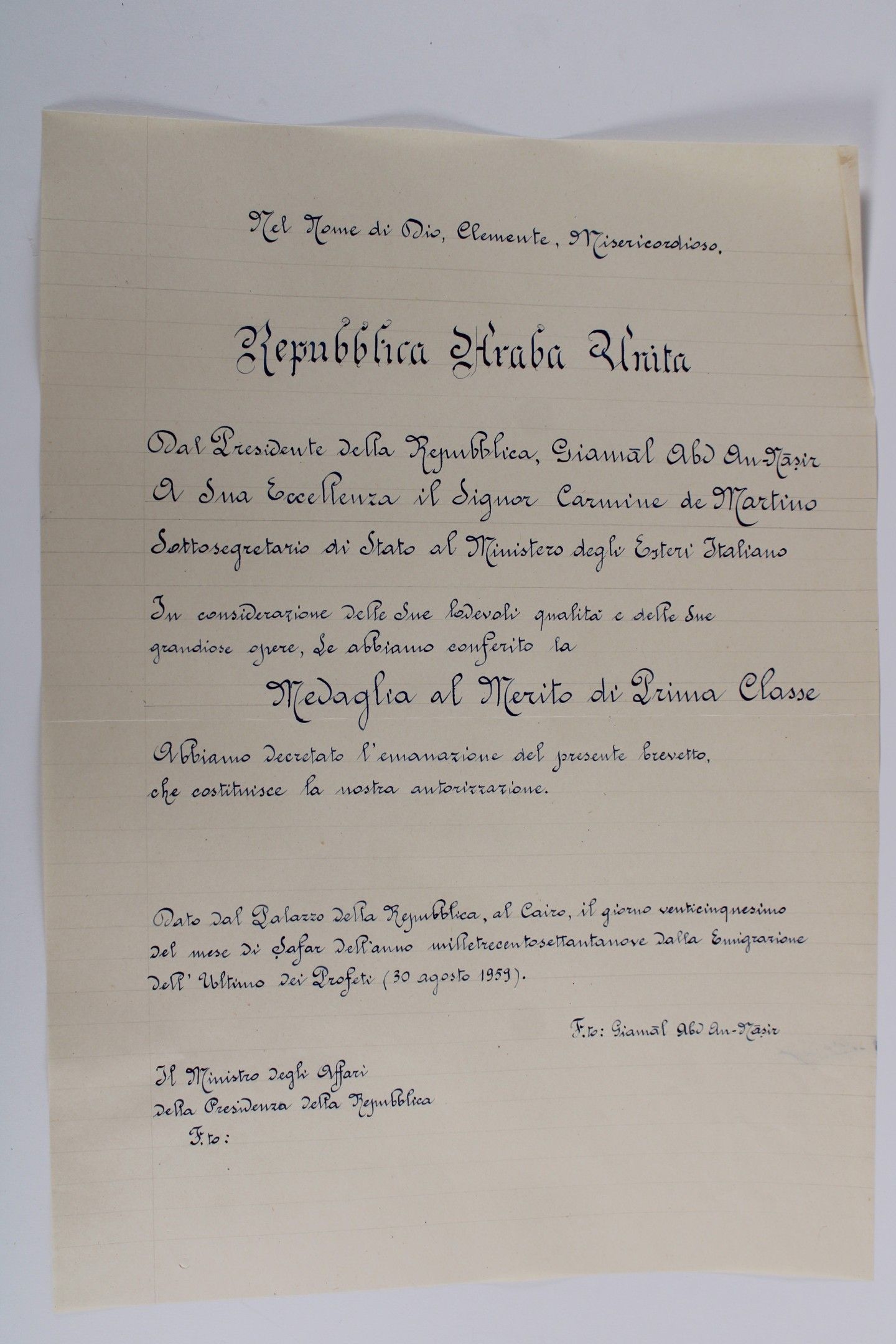 With its typed notice from the Ministry of Foreign Affairs, indicating the award in 1959 during the visit of the President of the Council to Egypt.