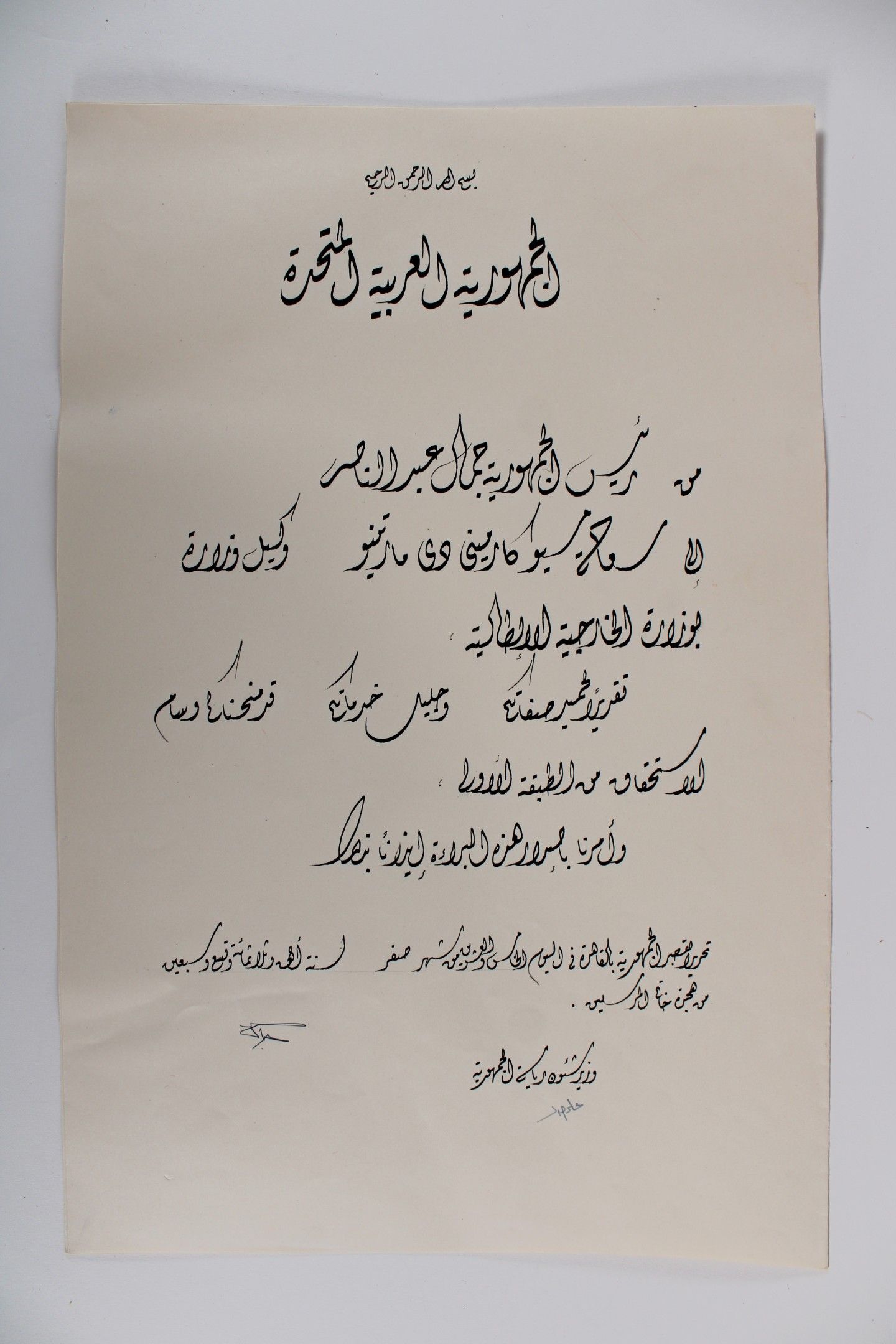 Enclosed is the patent on the letterhead of the United Arab Republic, its translation into Italian, an envelope written in Arabic and a miniature ribbon.