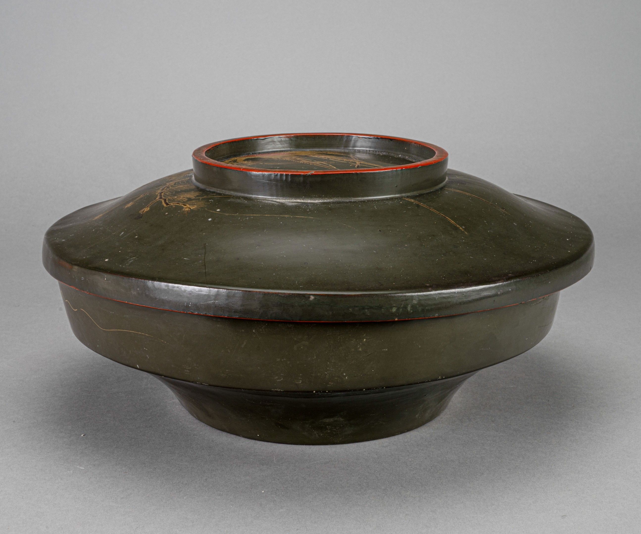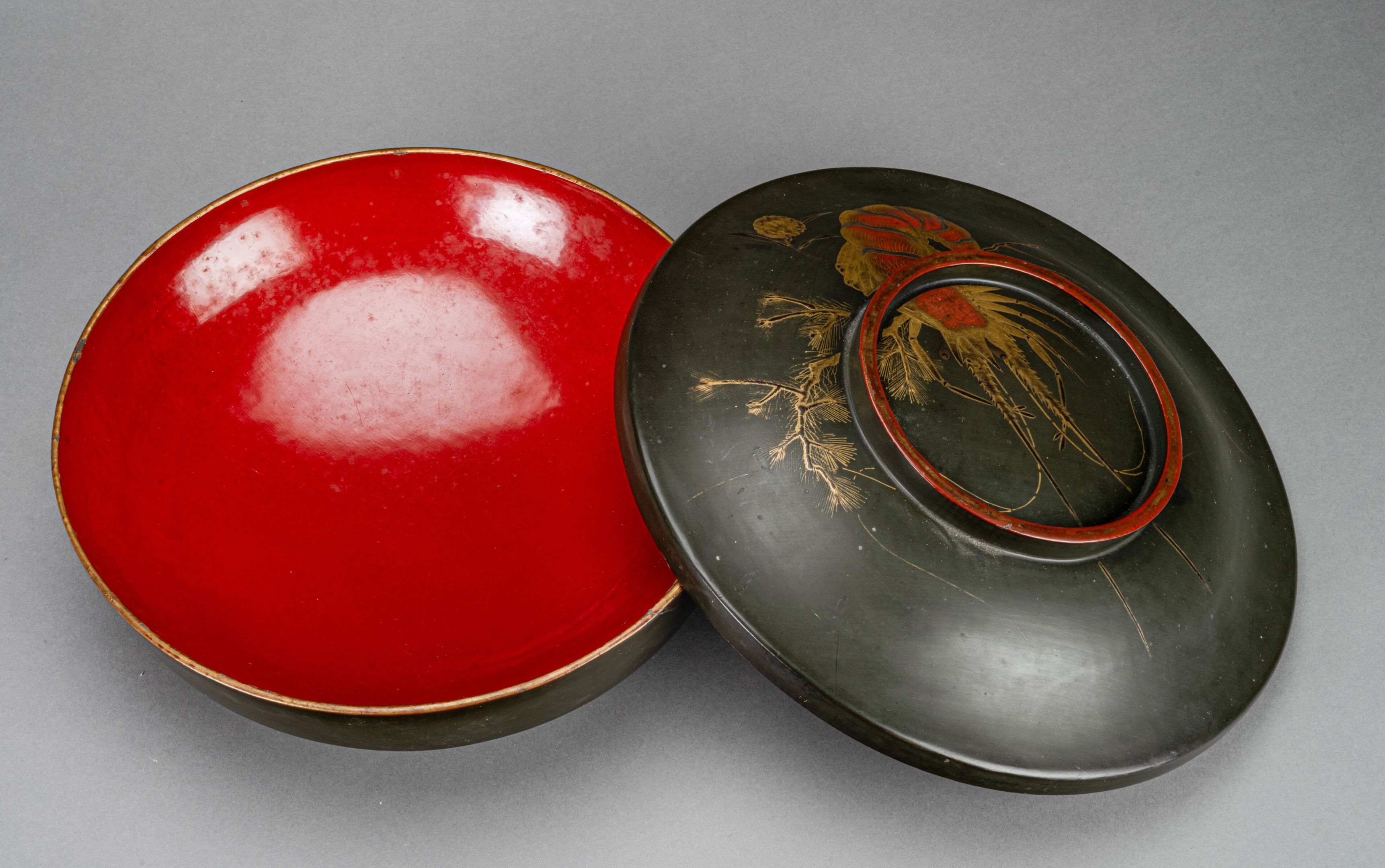 Japan, Round covered lacquer dish, the outside black lacquer…