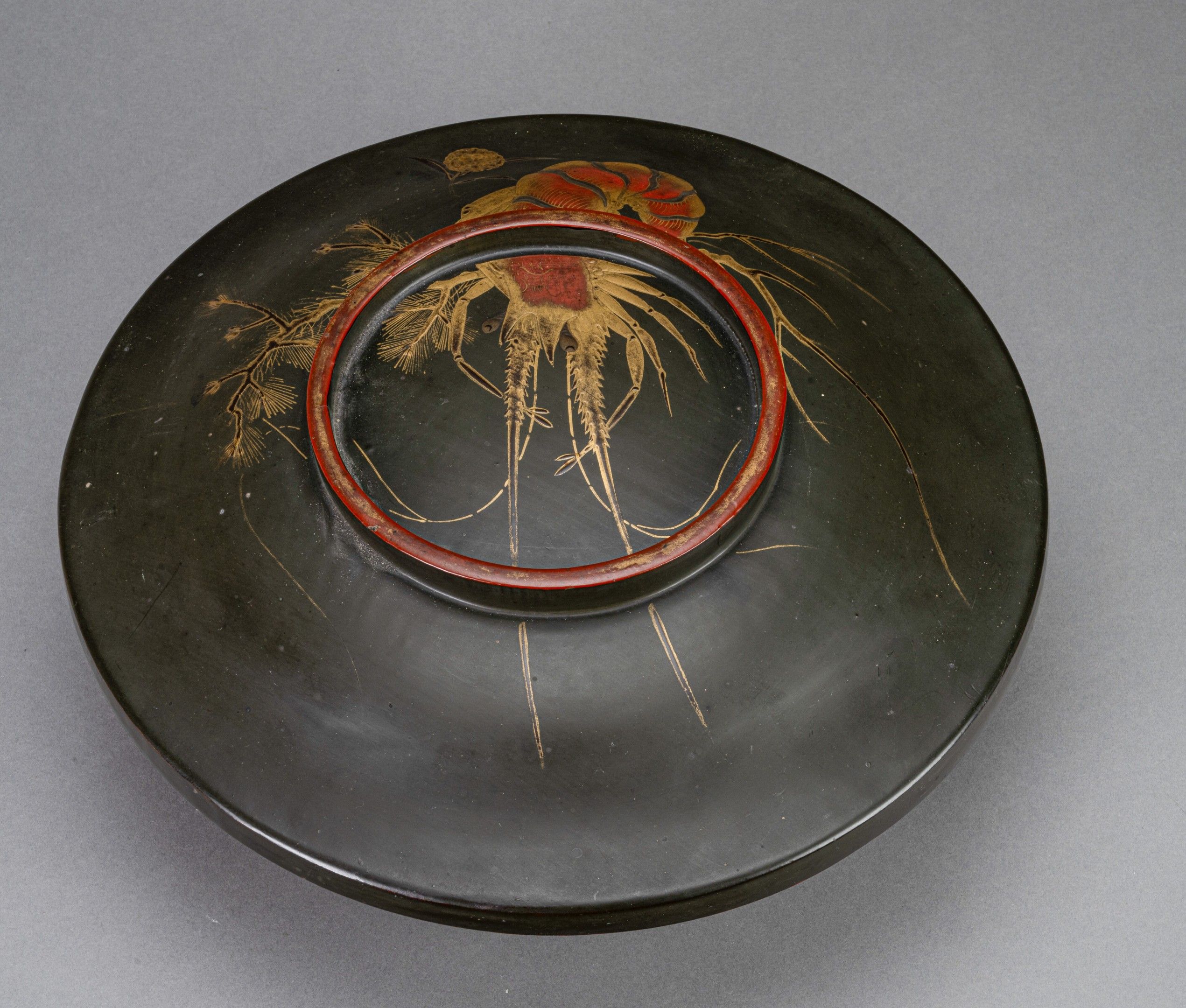 Round covered lacquer dish, the outside black lacquered with a gold and red maki-e lacquer decoration on the lid of a lobster and a pine branch (New Year motif), the inside red lacquered.