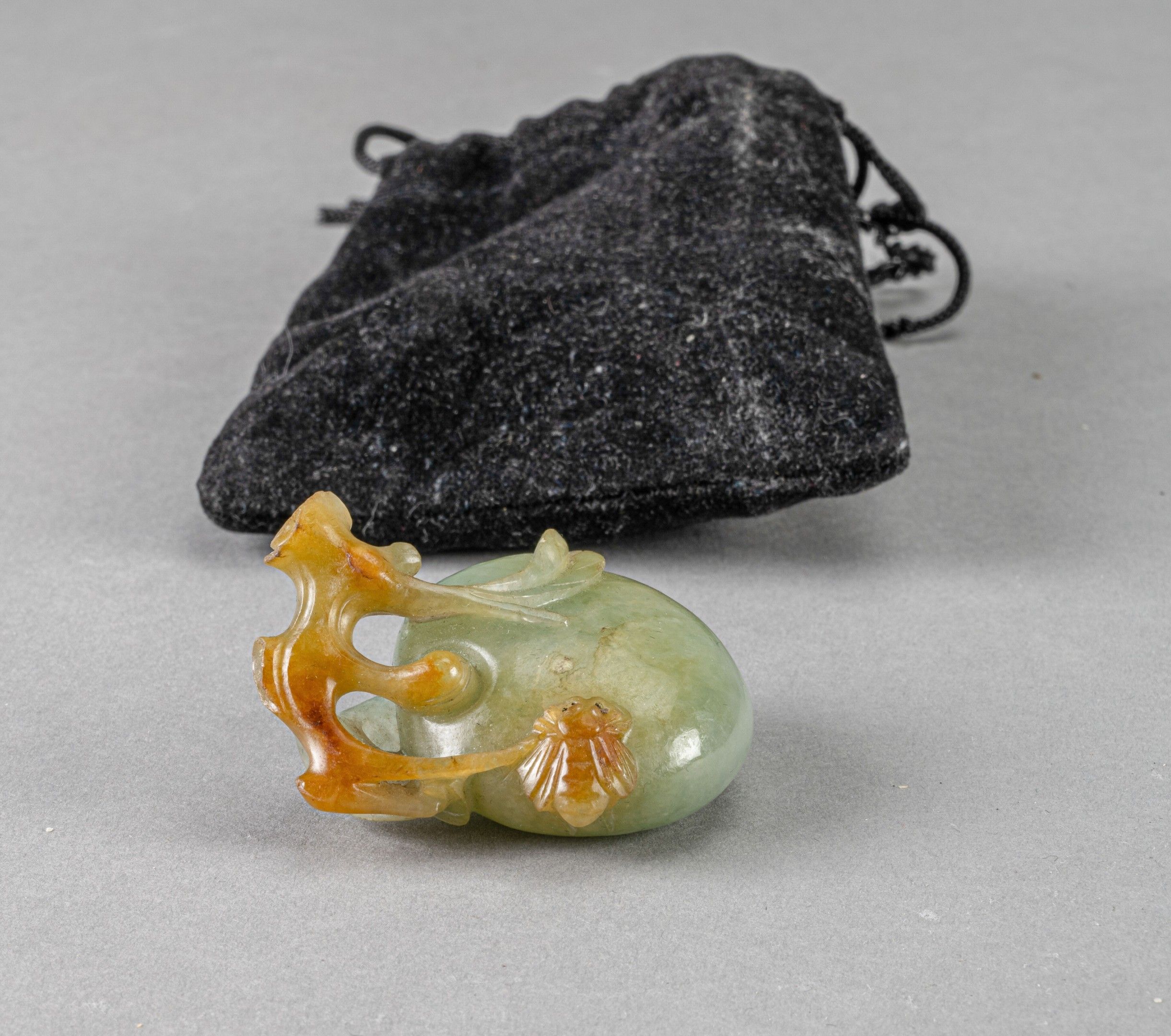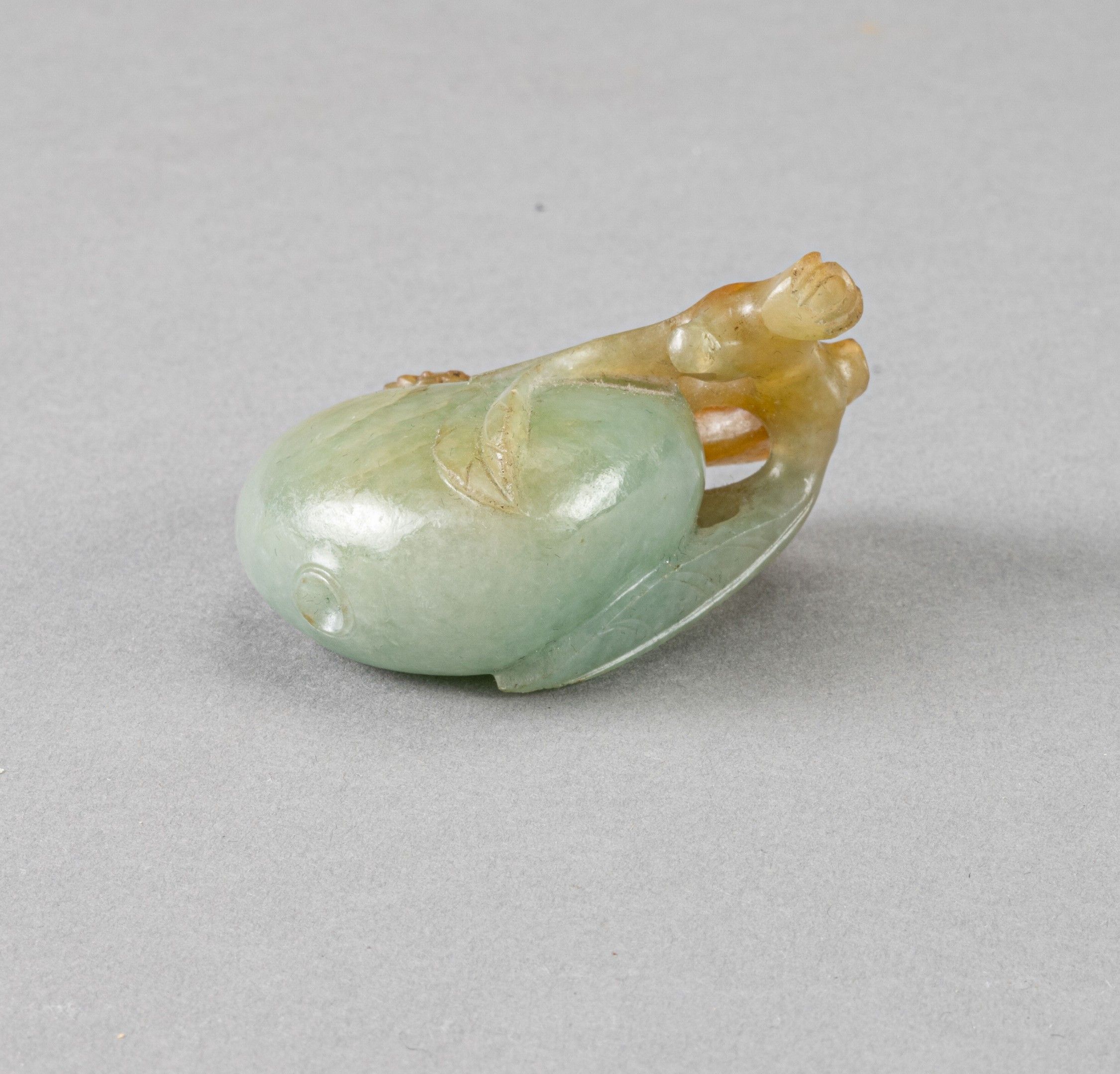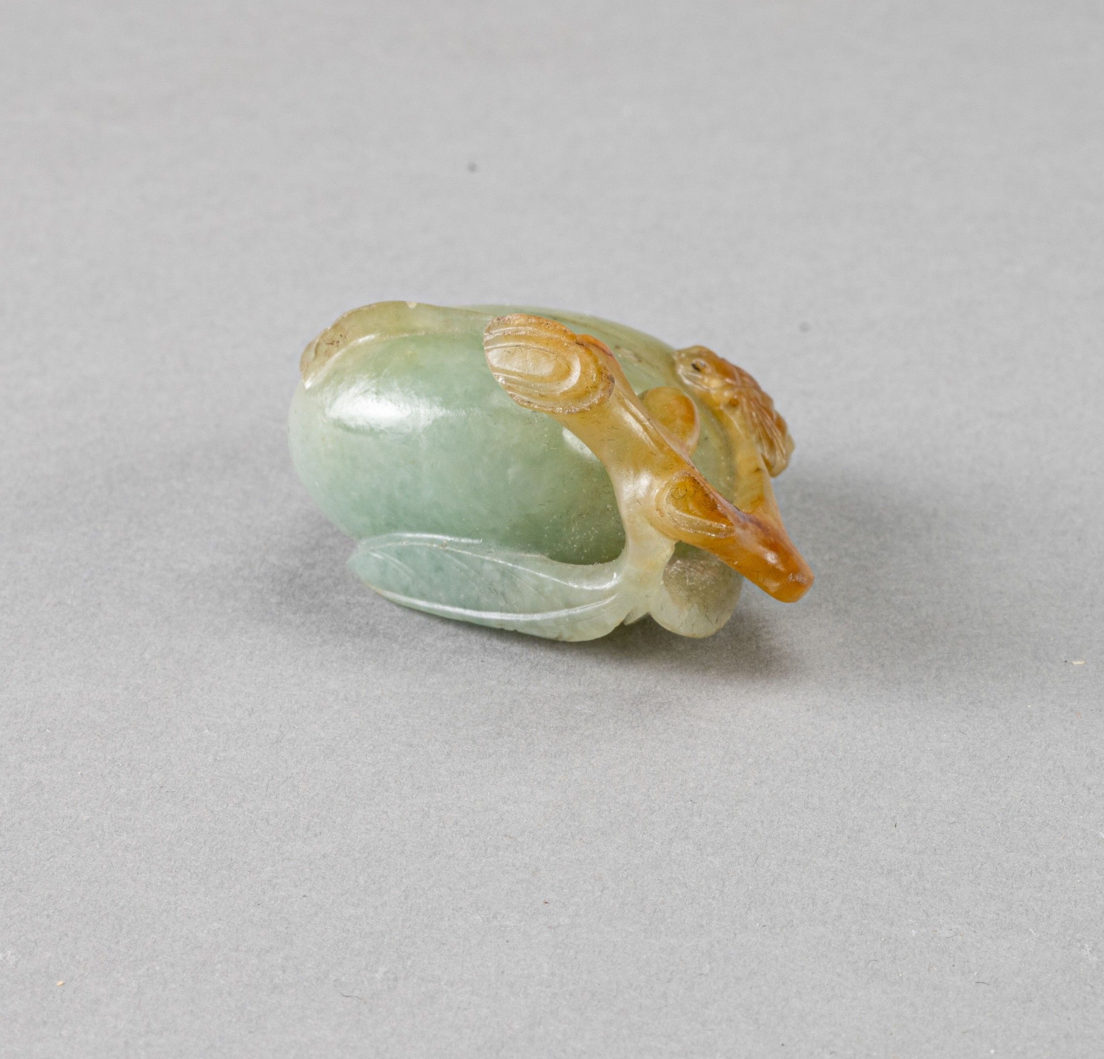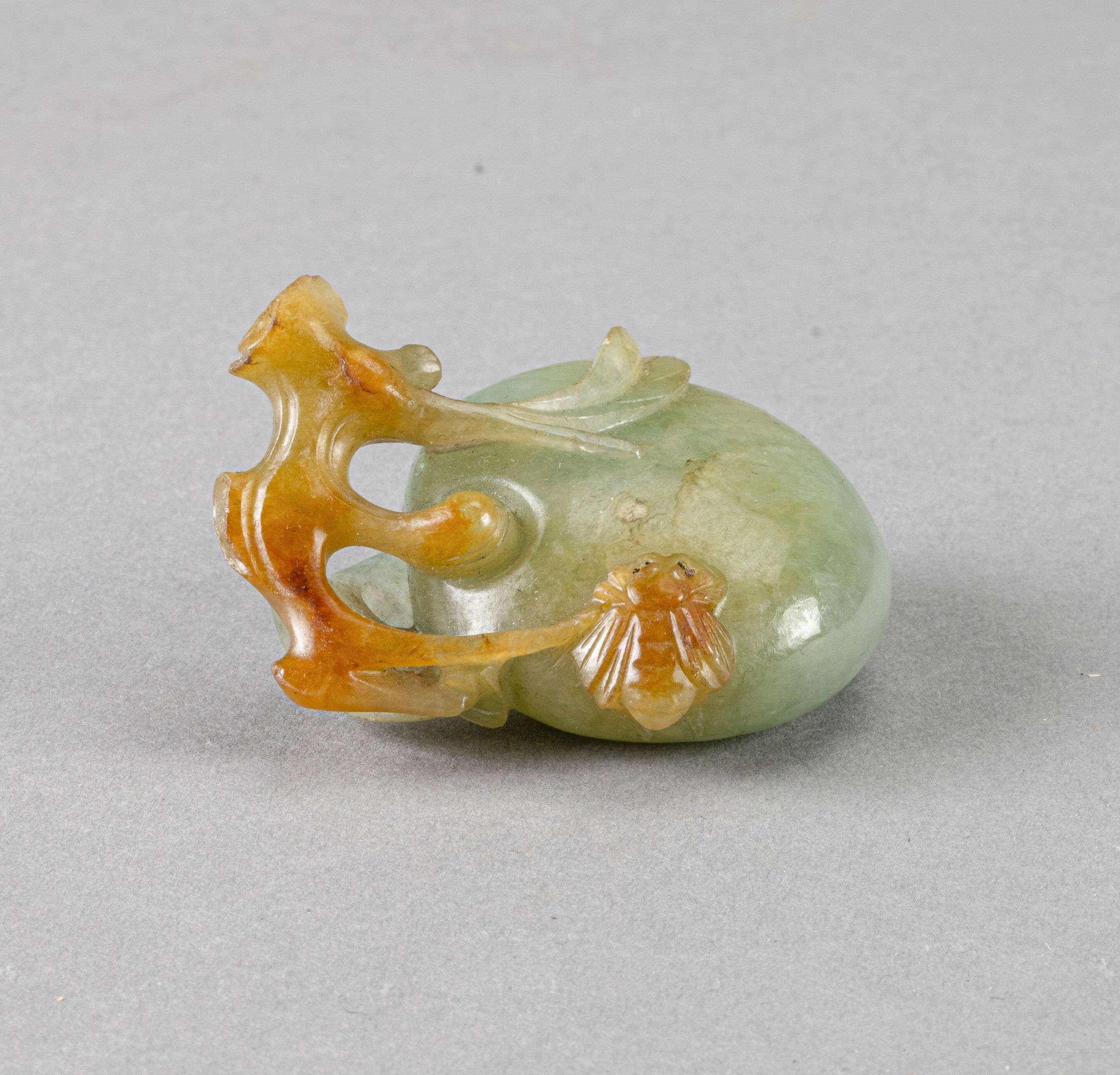 Small group in green and orange jadeite, representing a peach on its leafy stem, a bee resting on the fruit, the stone pale green for the peach and the leaves, yellow to rust for the bee and the branch, the insect's eyes blackened.