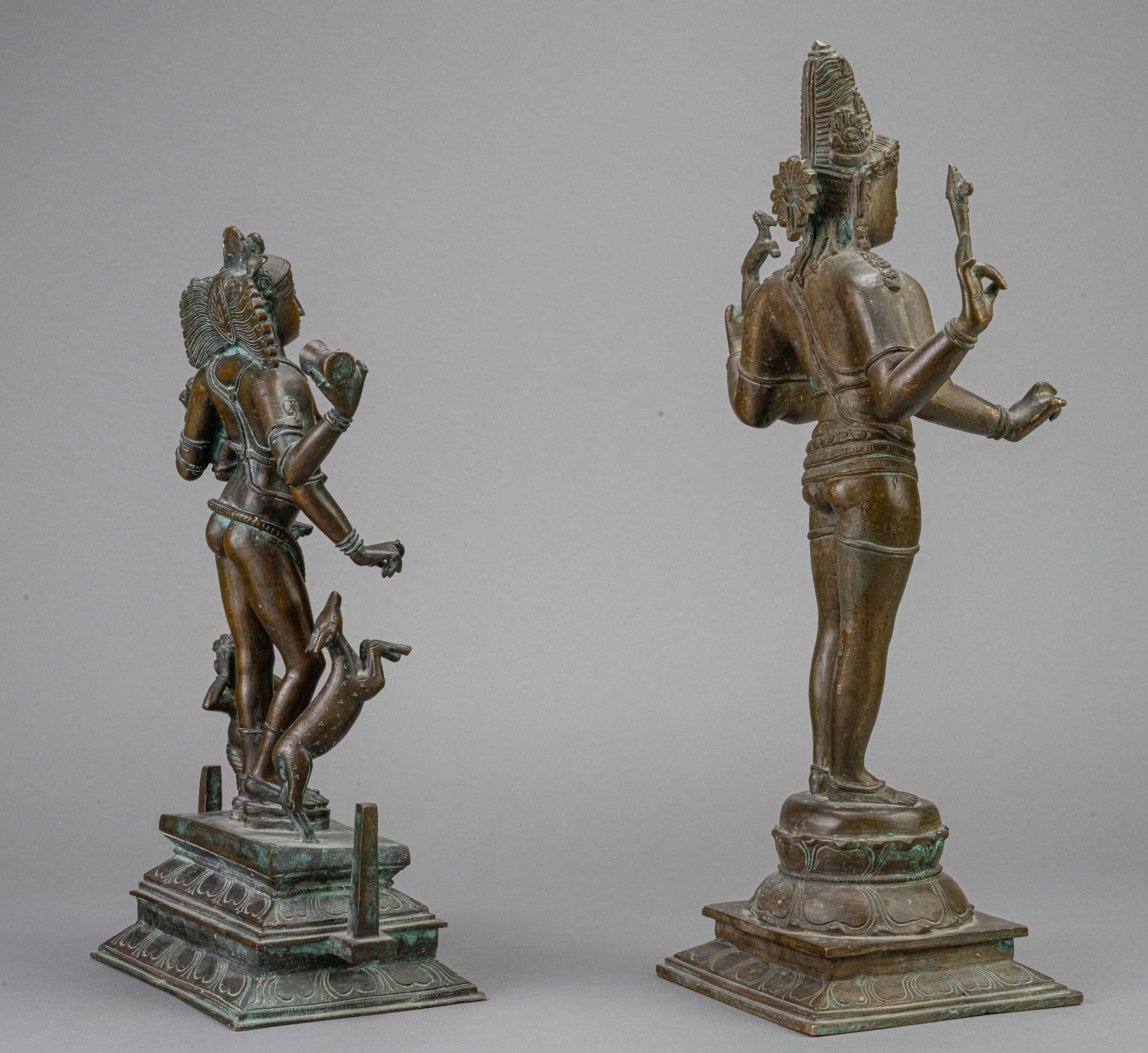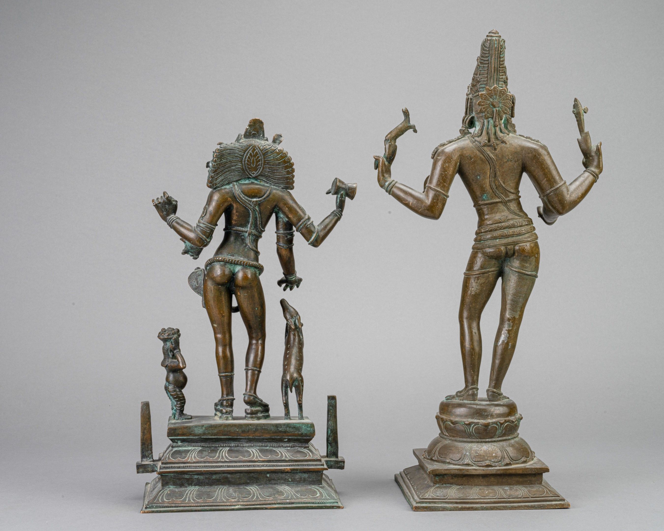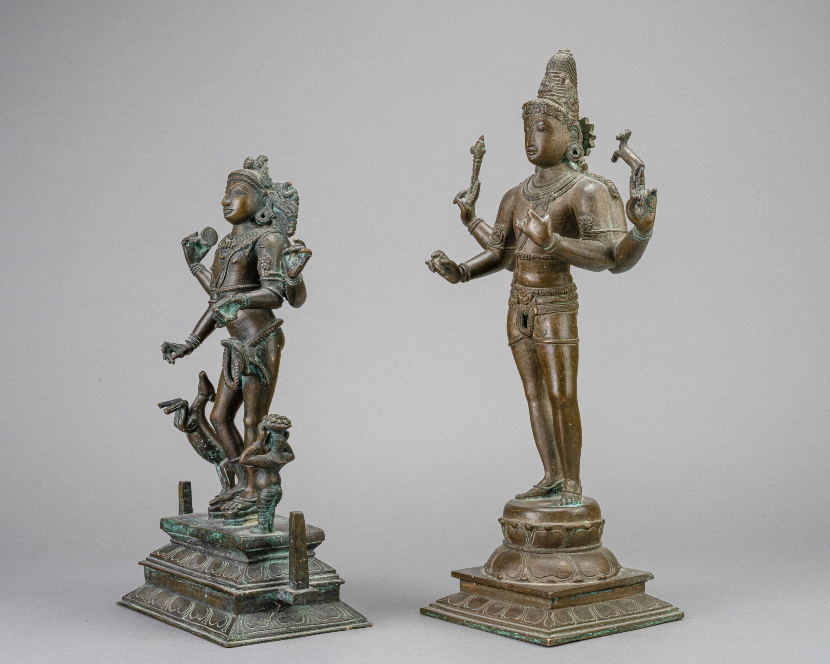 Two bronze statuettes: one representing Bhairava standing, with four arms holding kapala and damaru, snakes surrounding his head and waist, his dog at his side, the other representing Shiva standing, with four arms including two holding an axe (parashu) and a deer, both on stepped lotus bases