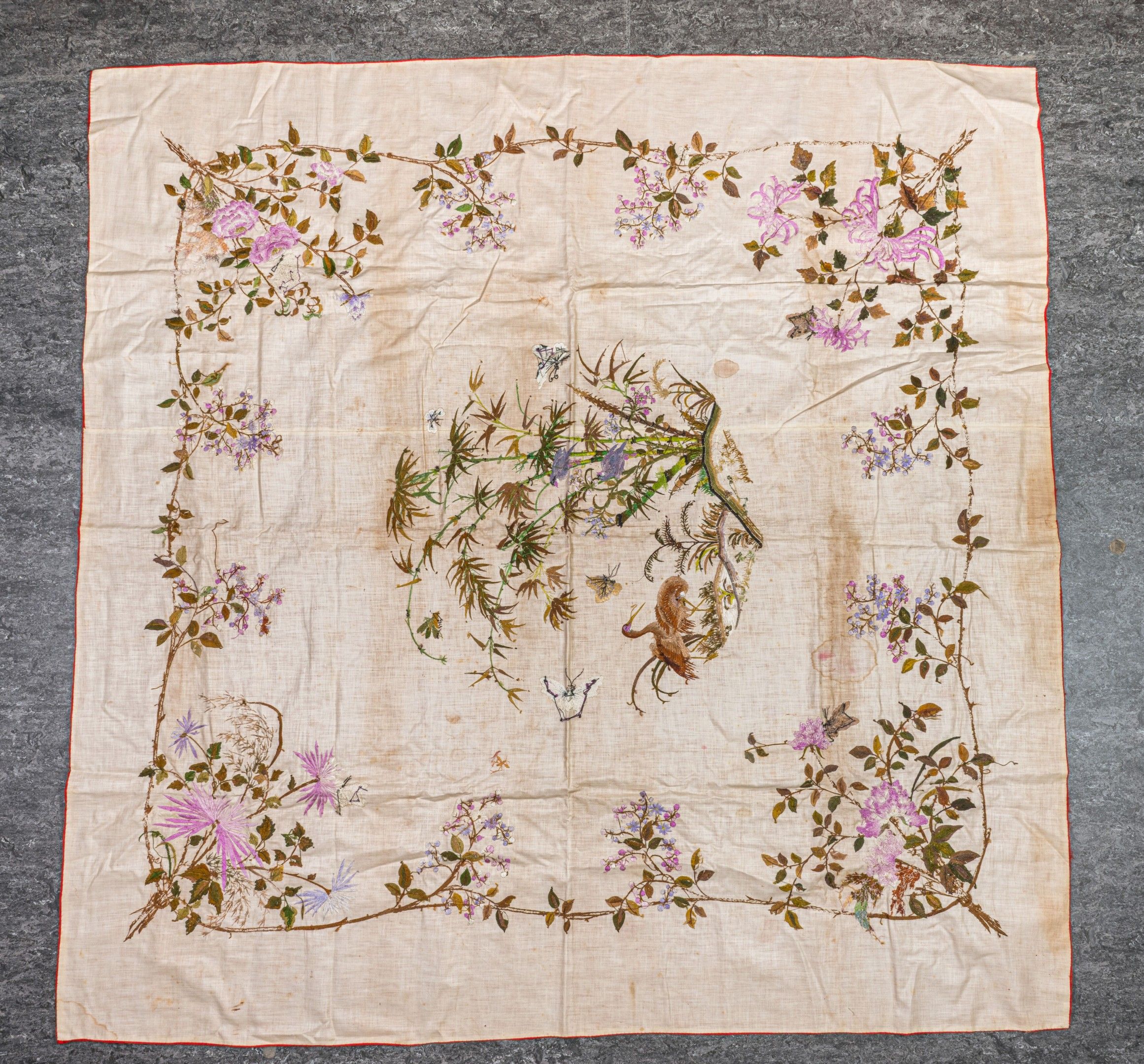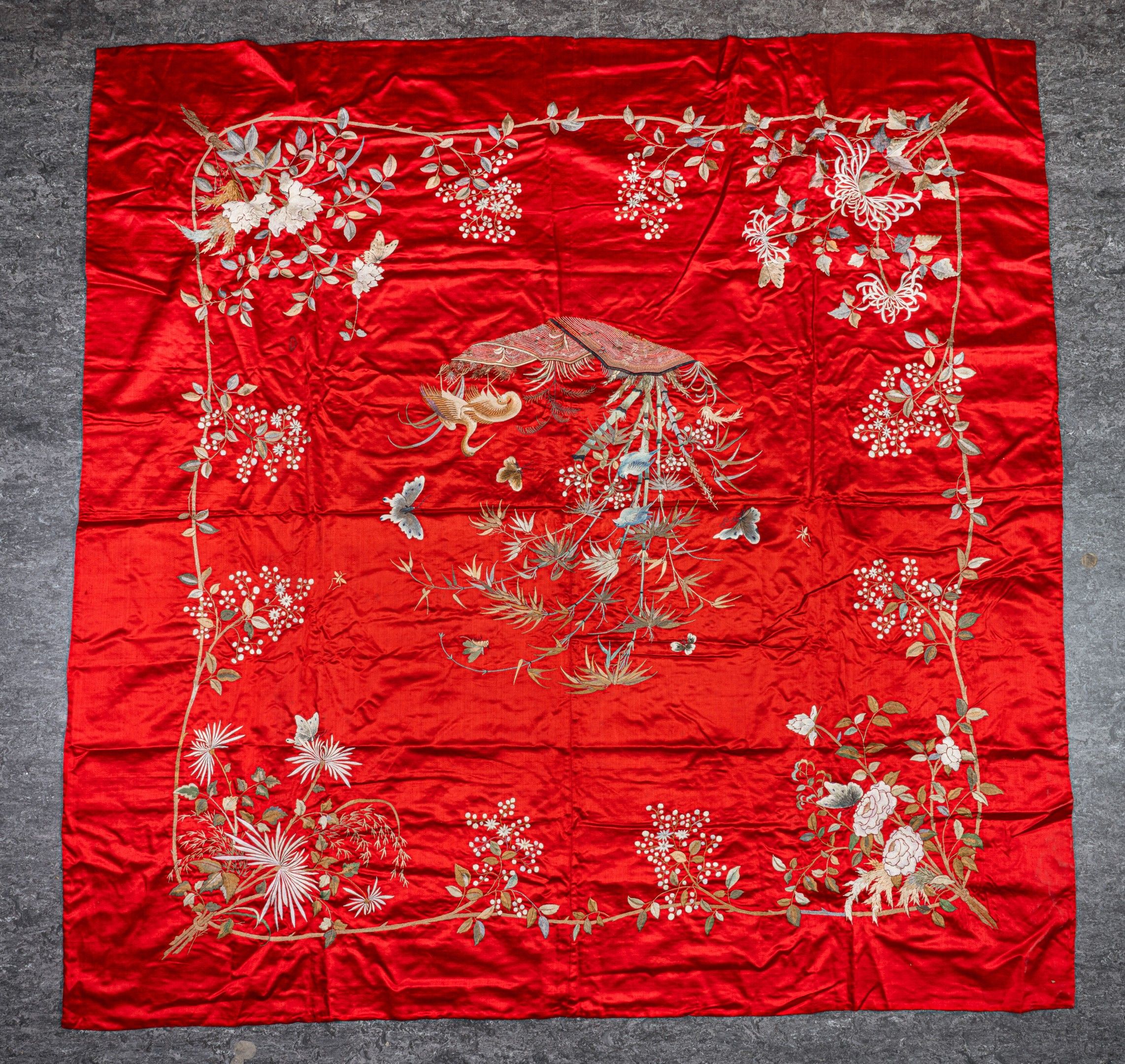 Red silk hanging embroidered with birds (including two cranes) and insects in a bamboo grove forming a central medallion, framed by chrysanthemums, peonies and other white flowers on a stem, lined with white fabric.
