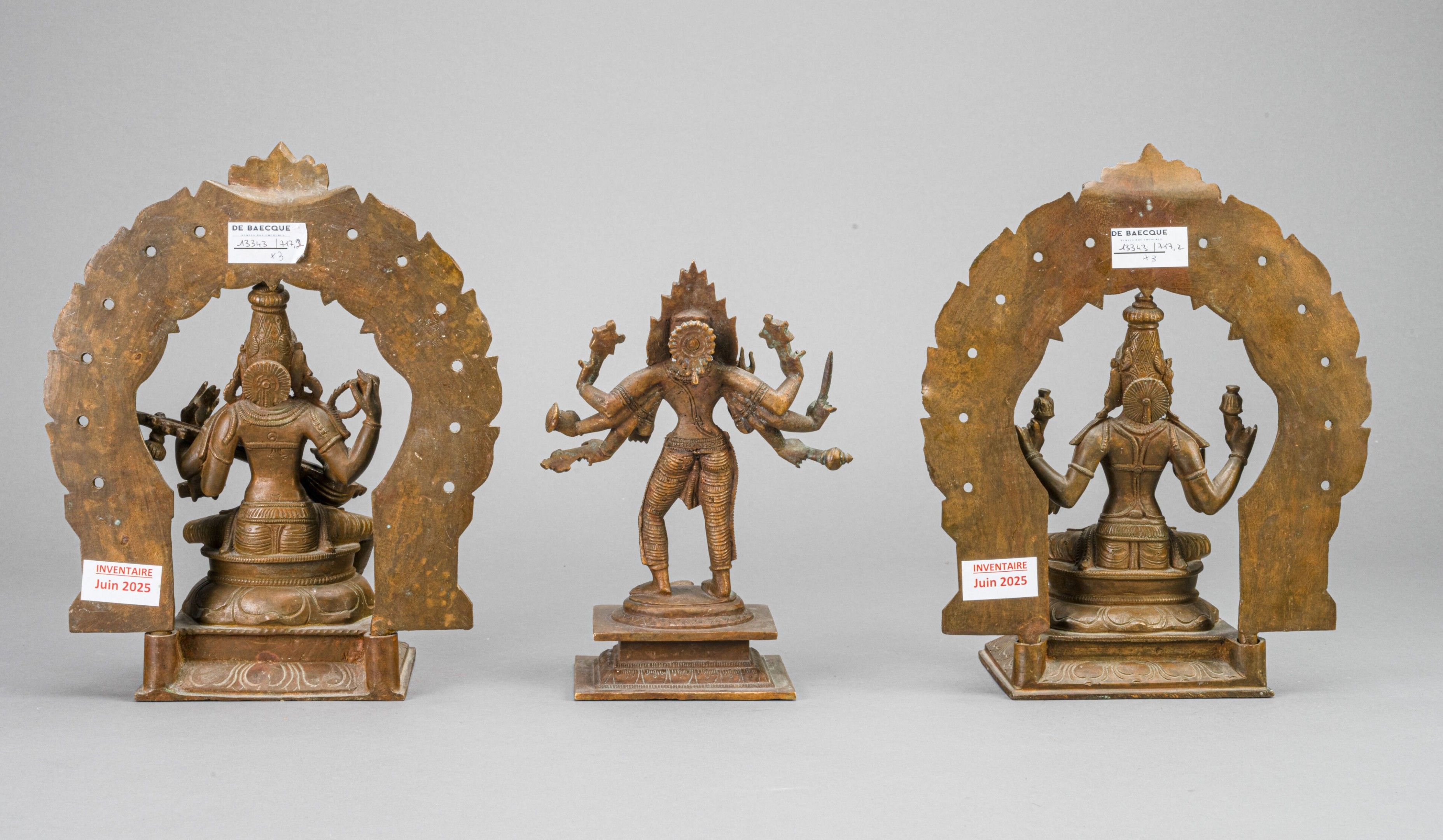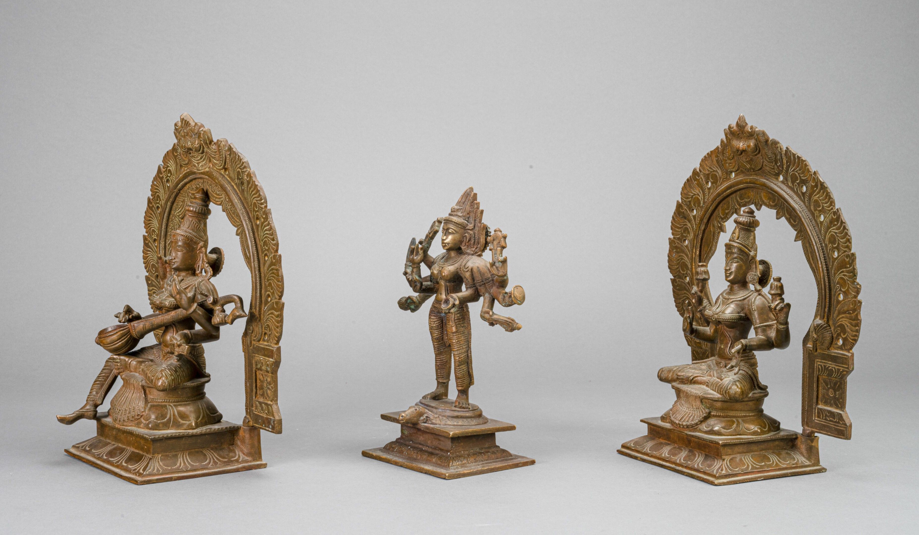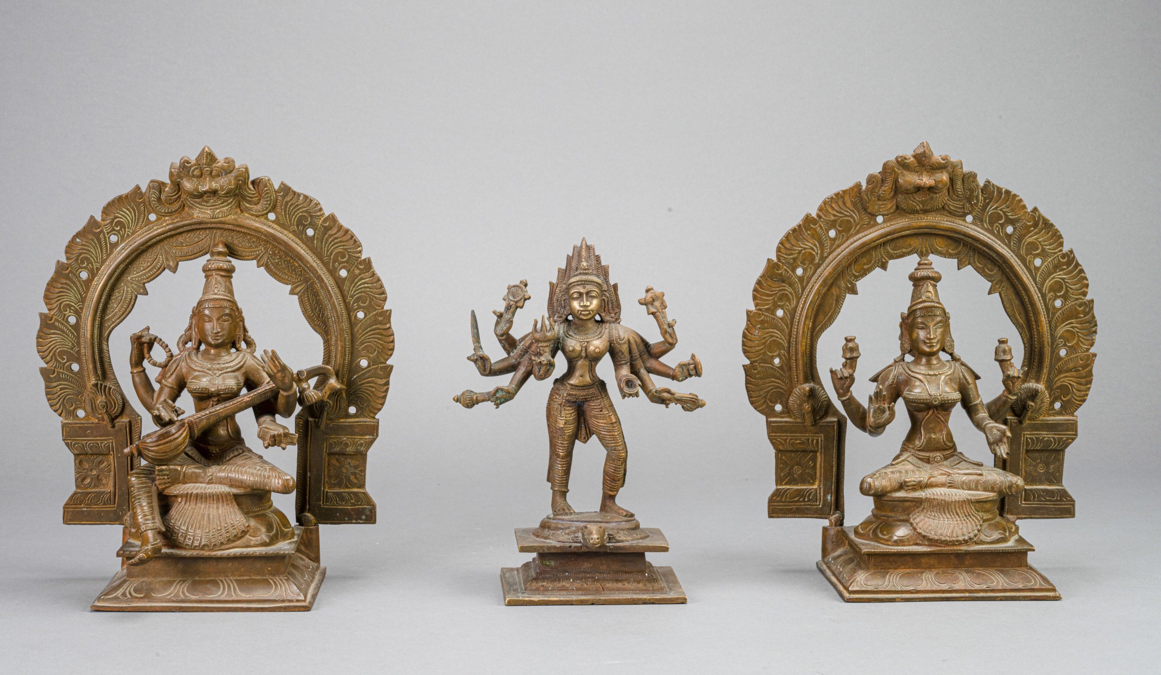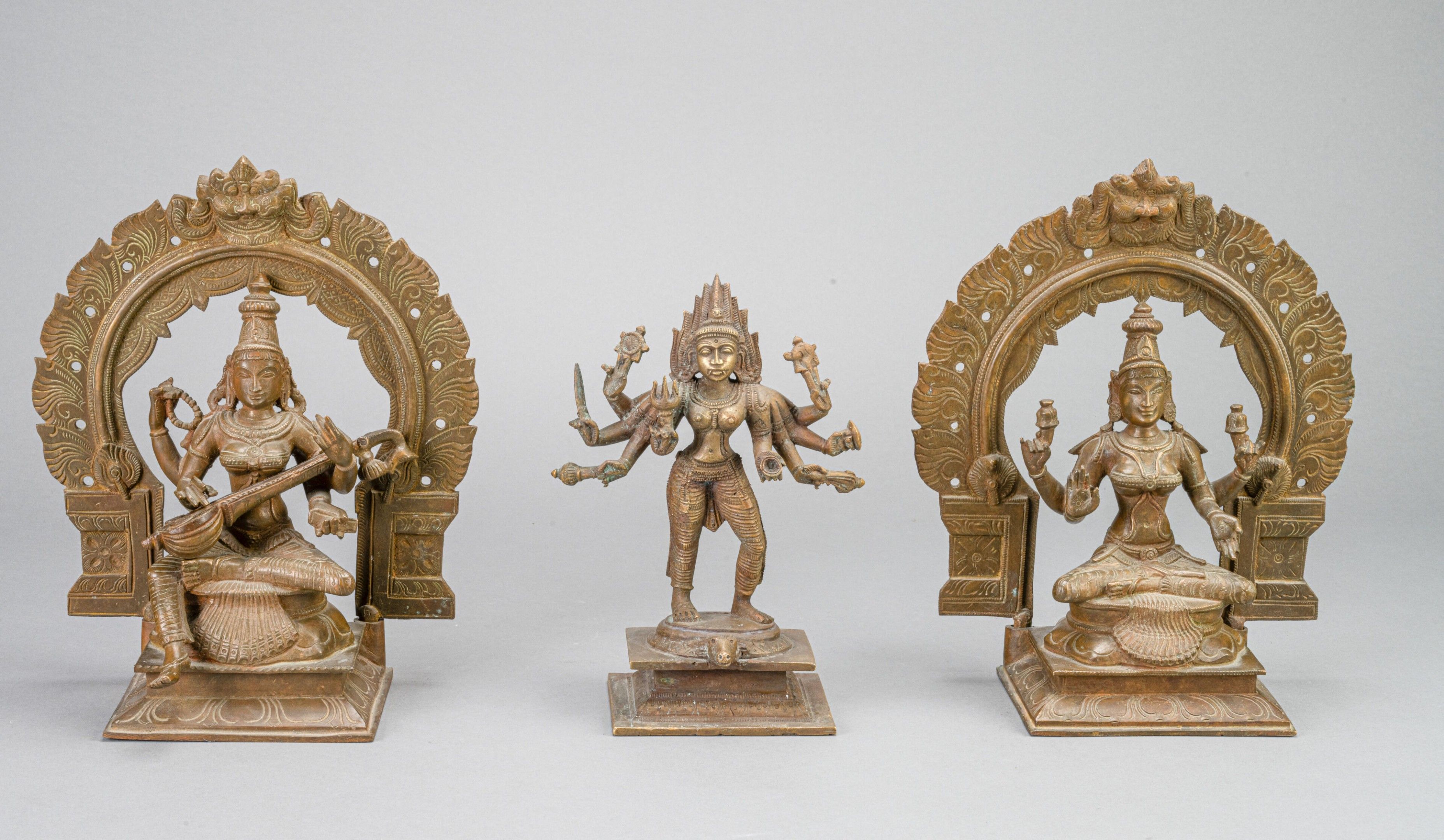 Two bronze statuettes: one representing Sarasvati with four arms, two holding a vîna, and the other Lakshmi with four arms, two holding lotuses, each seated on a lotus base and in front of an openwork mandorla crowned with a kirtimukha, the lute and mandorles removable.