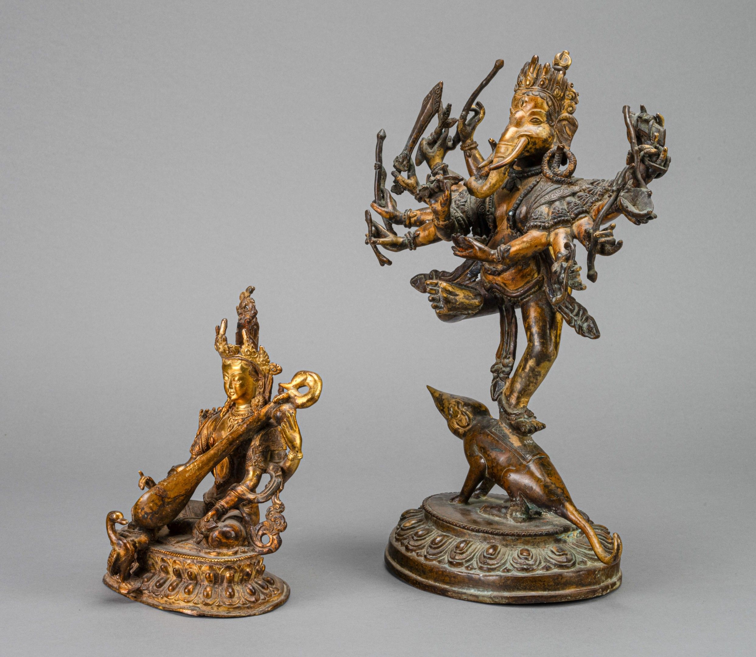 Two partially gilded copper alloy statuettes: one depicting Ganesha with twelve arms, each holding an attribute, dancing on his mount, the rat, on an oval lotus base, the other depicting the goddess Sarasvati with four arms, two of which play the vîna, seated on a lotus base, one foot resting on her mount, the swan.