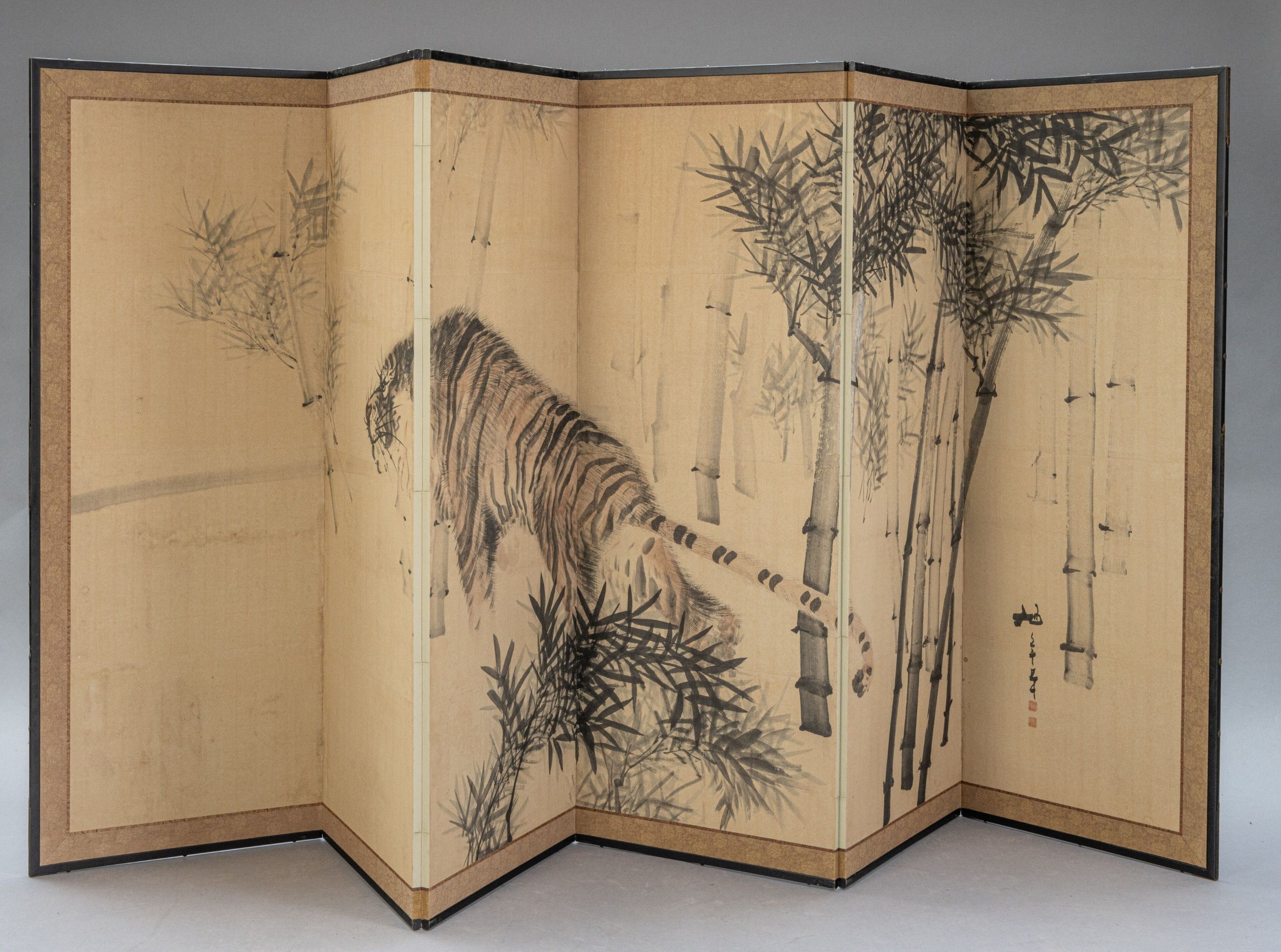 Six-leaf screen, painted in ink and colours on paper, showing a tiger on the prowl, emerging from a bamboo grove in the mist, a signature and two seals at the bottom of the rightmost leaf, mounted in silk and black lacquered wood, with chased bronze fittings, and printed paper covering the rear.