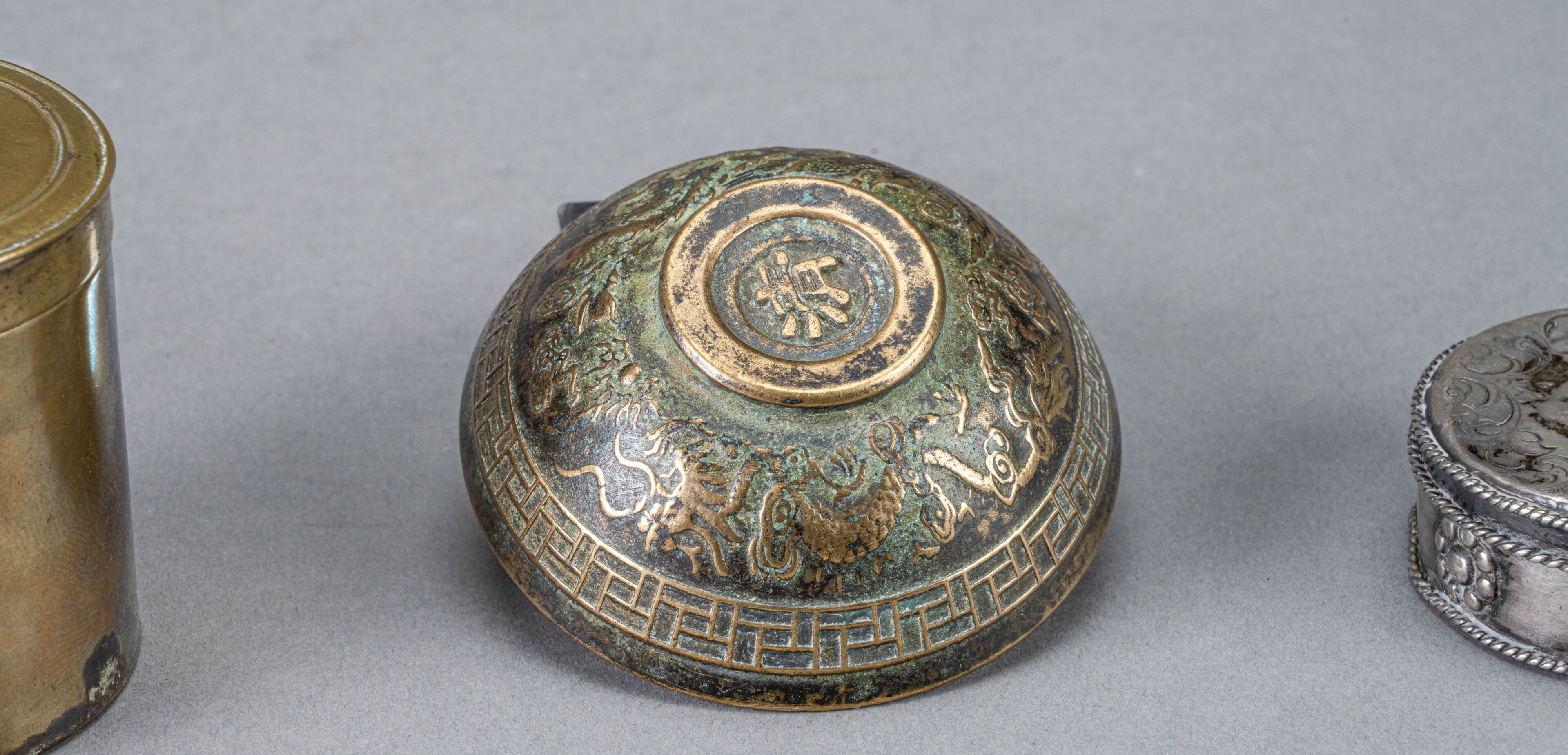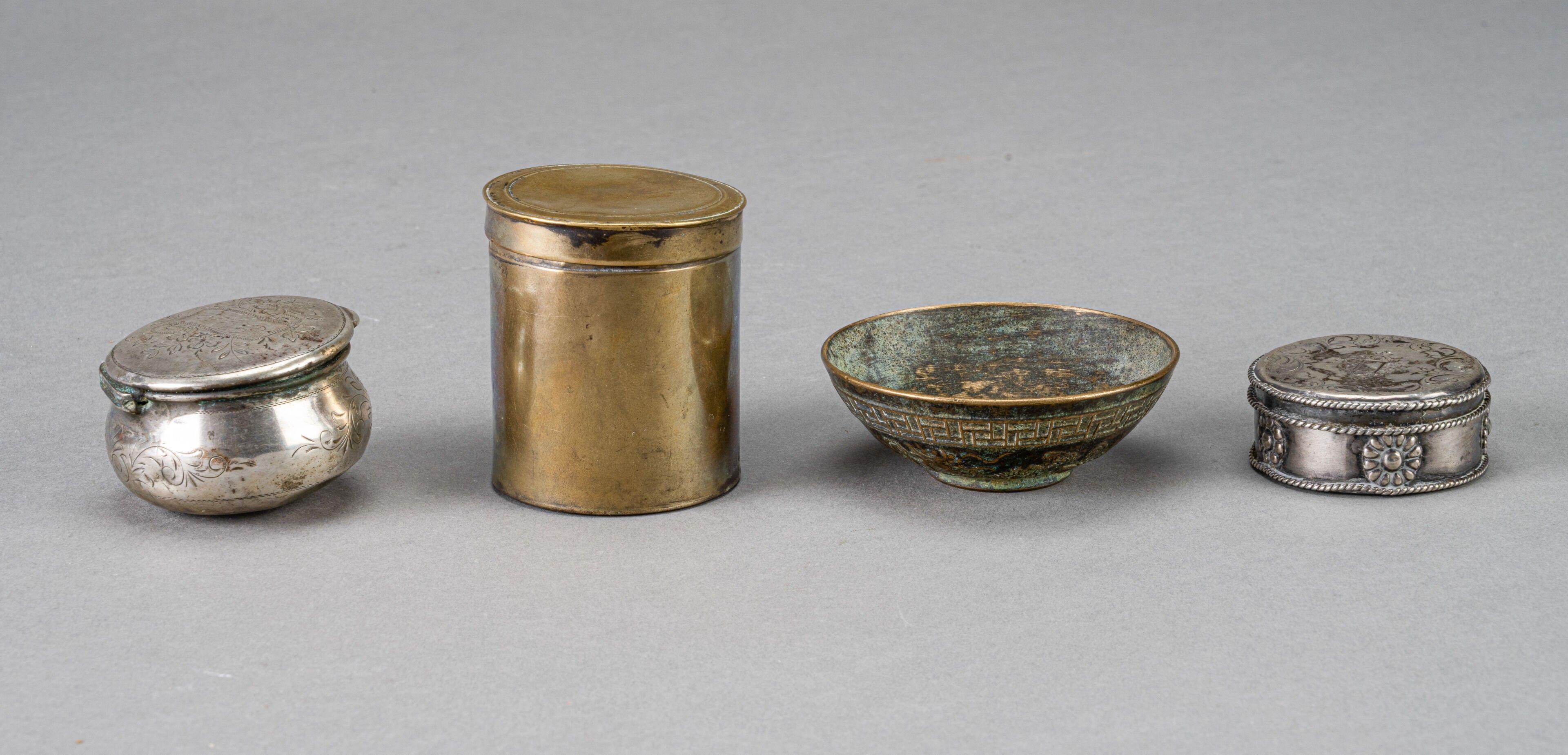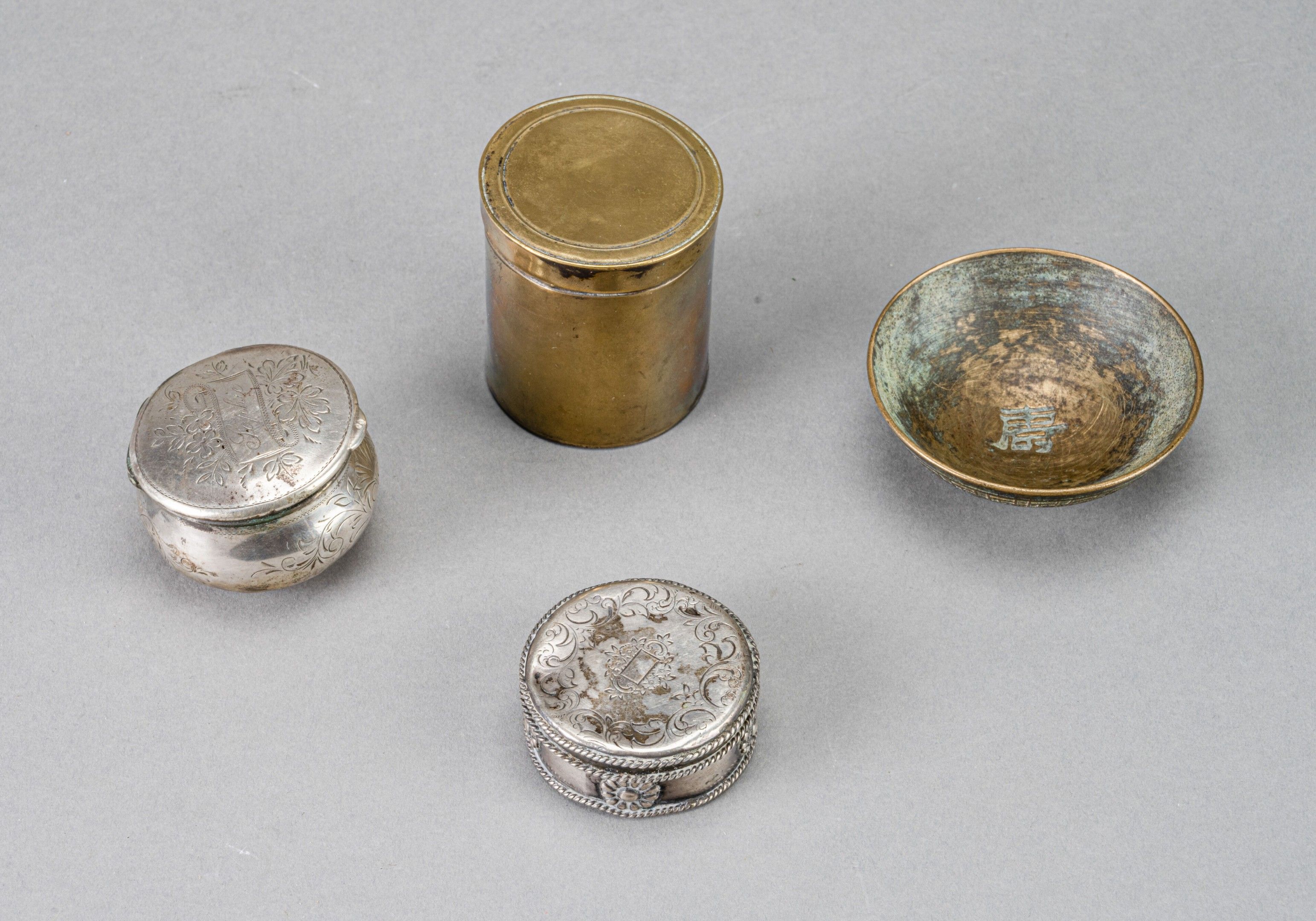19th-20th century, Miscellaneous set consisting of a silver-plated pill box bearing the name Sophie (Western work - Diam. 4 cm), a small round silver box decorated with foliage (South-East Asia - Diam. 4 cm), a cylindrical brass box (Diam. 4.4 cm) and a bronze bowl decorated with a dragon (China - Diam. 6 cm).