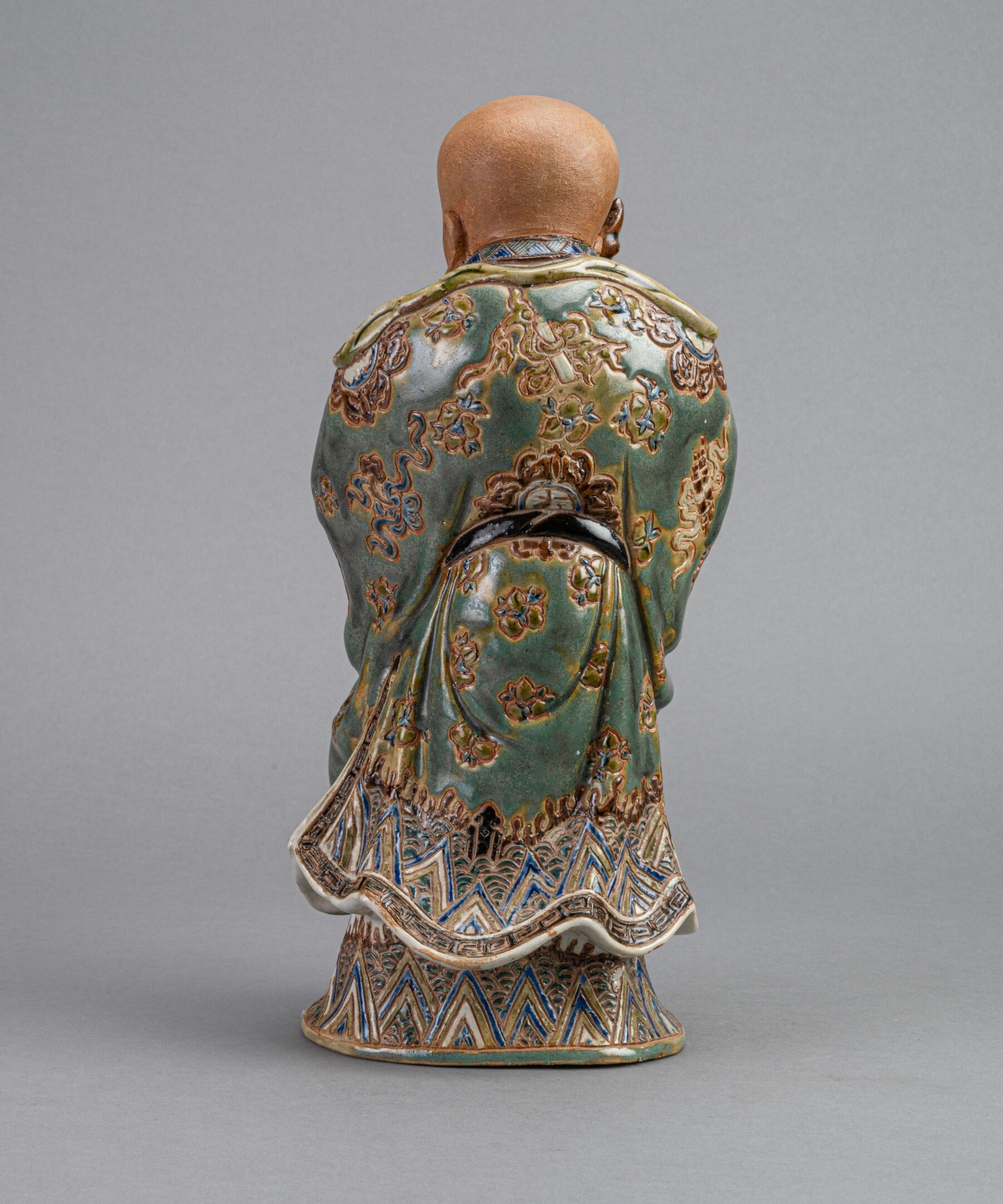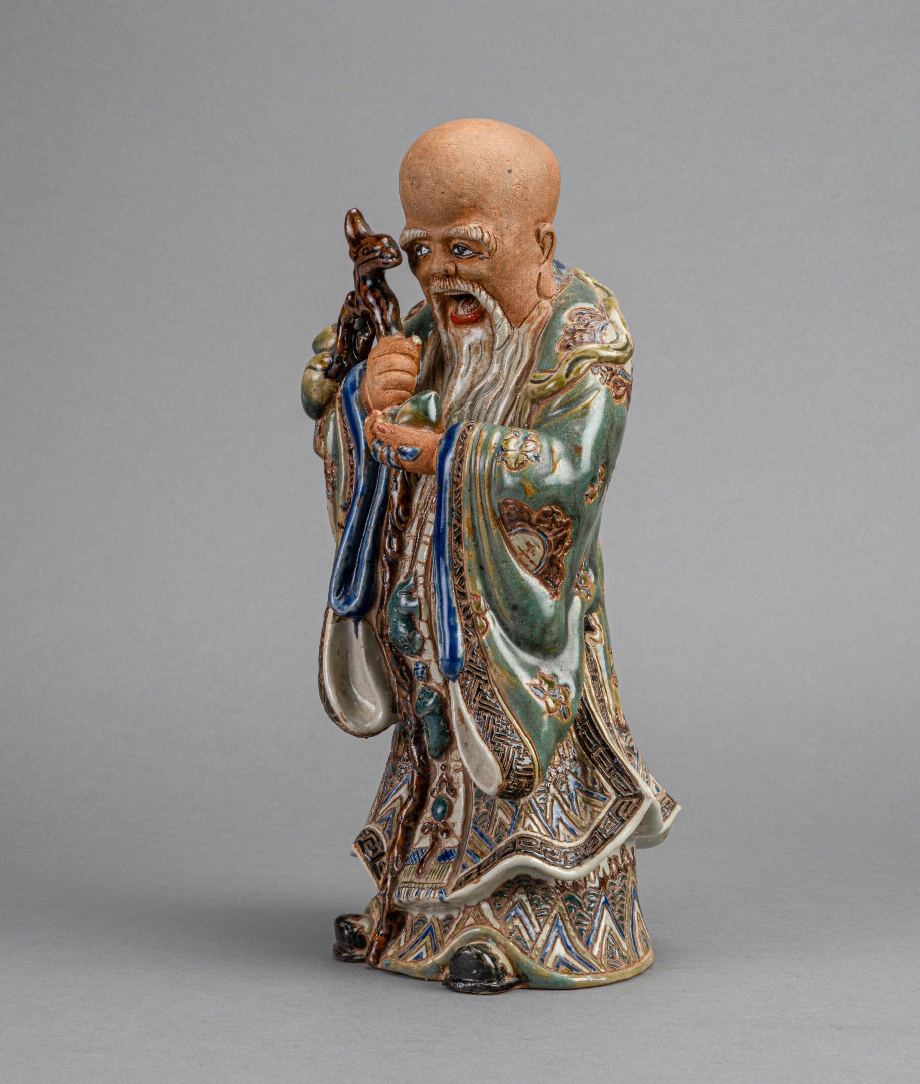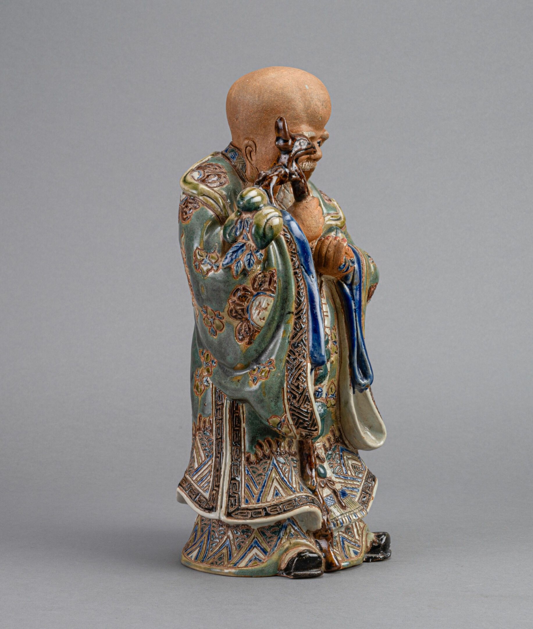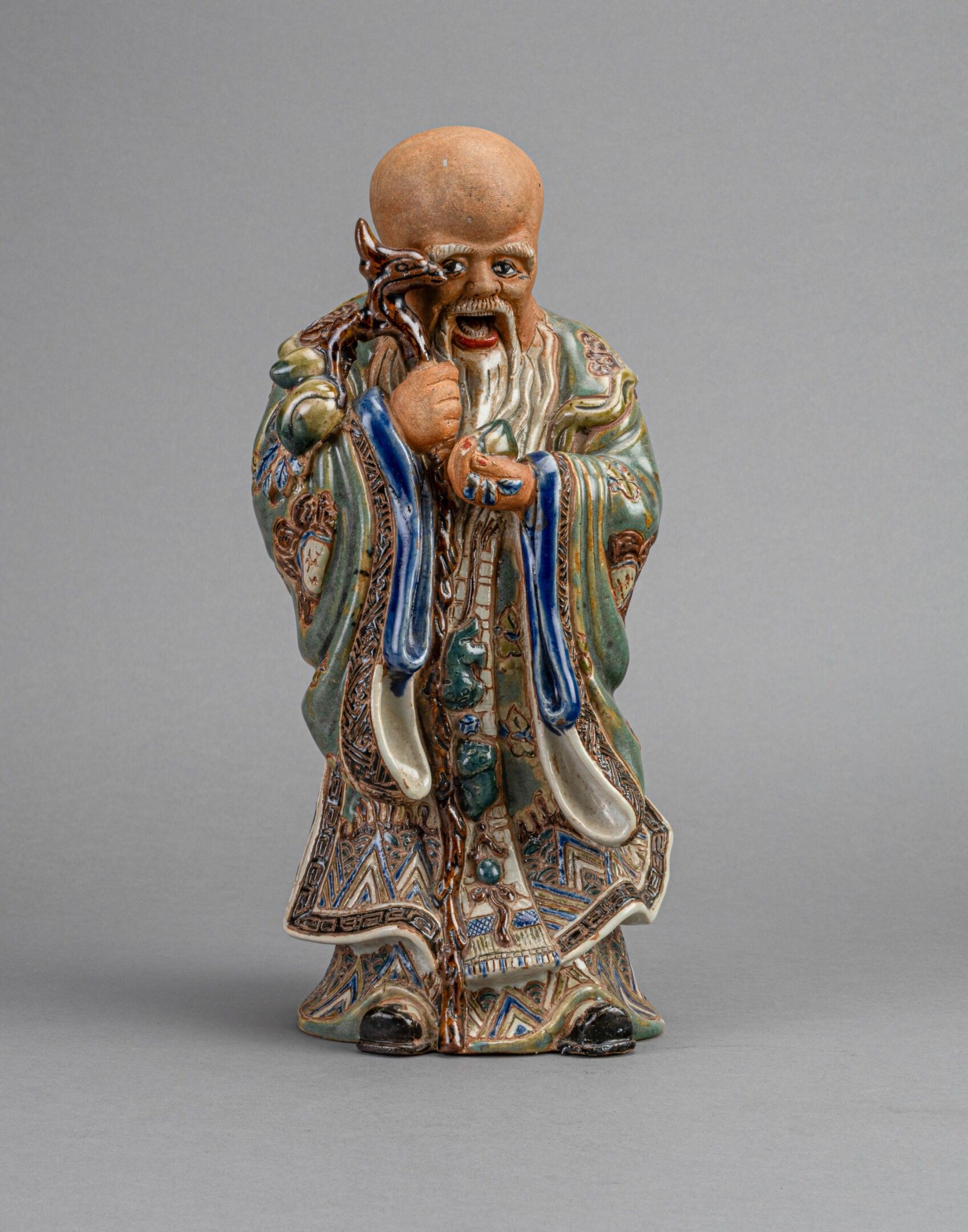 Enamelled stoneware statuette in shades of green, brown and blue representing the god of longevity, Shoulao, standing with his mouth wide open, holding his staff and peaches of longevity, his robe with peach motifs and Taoist symbols.