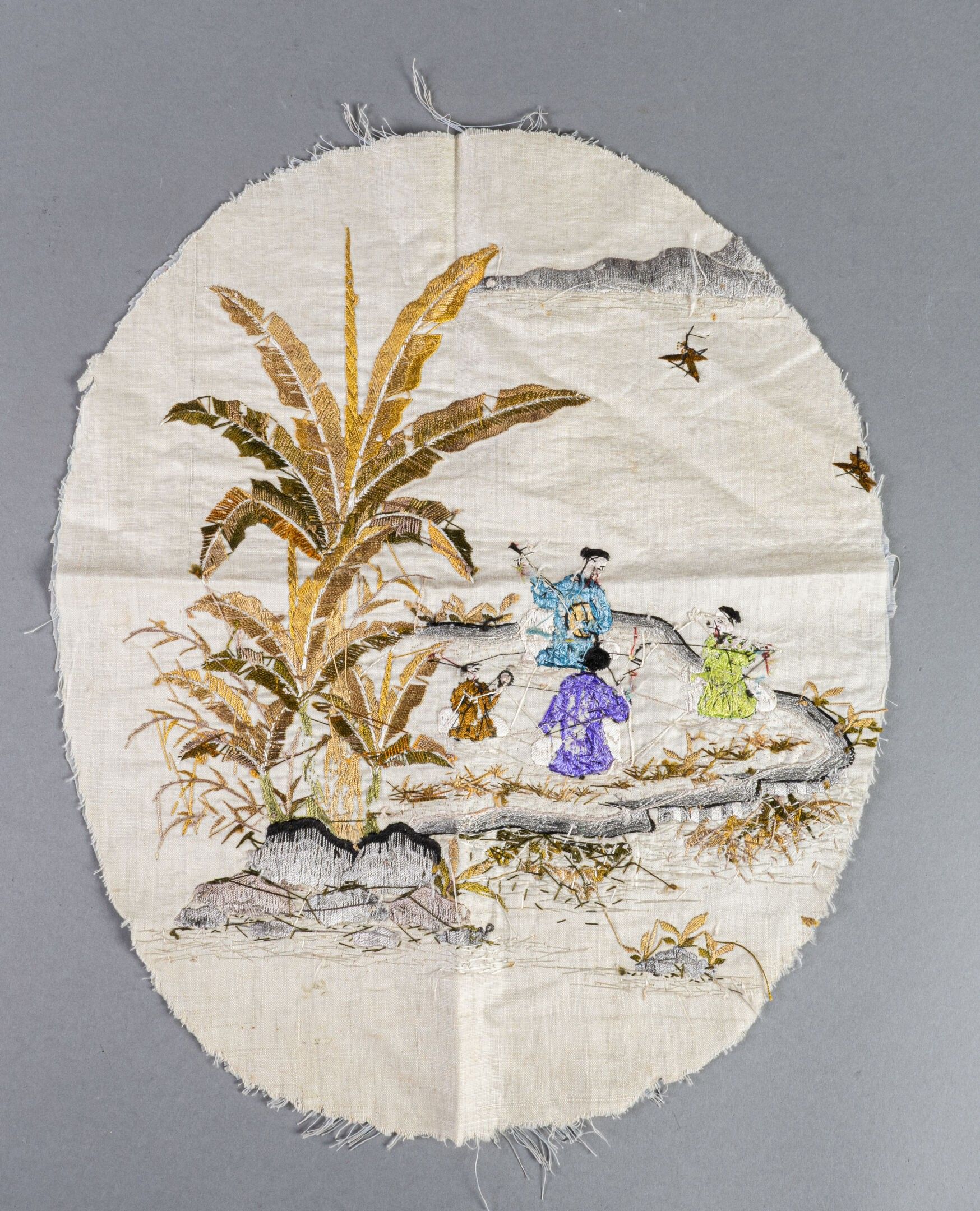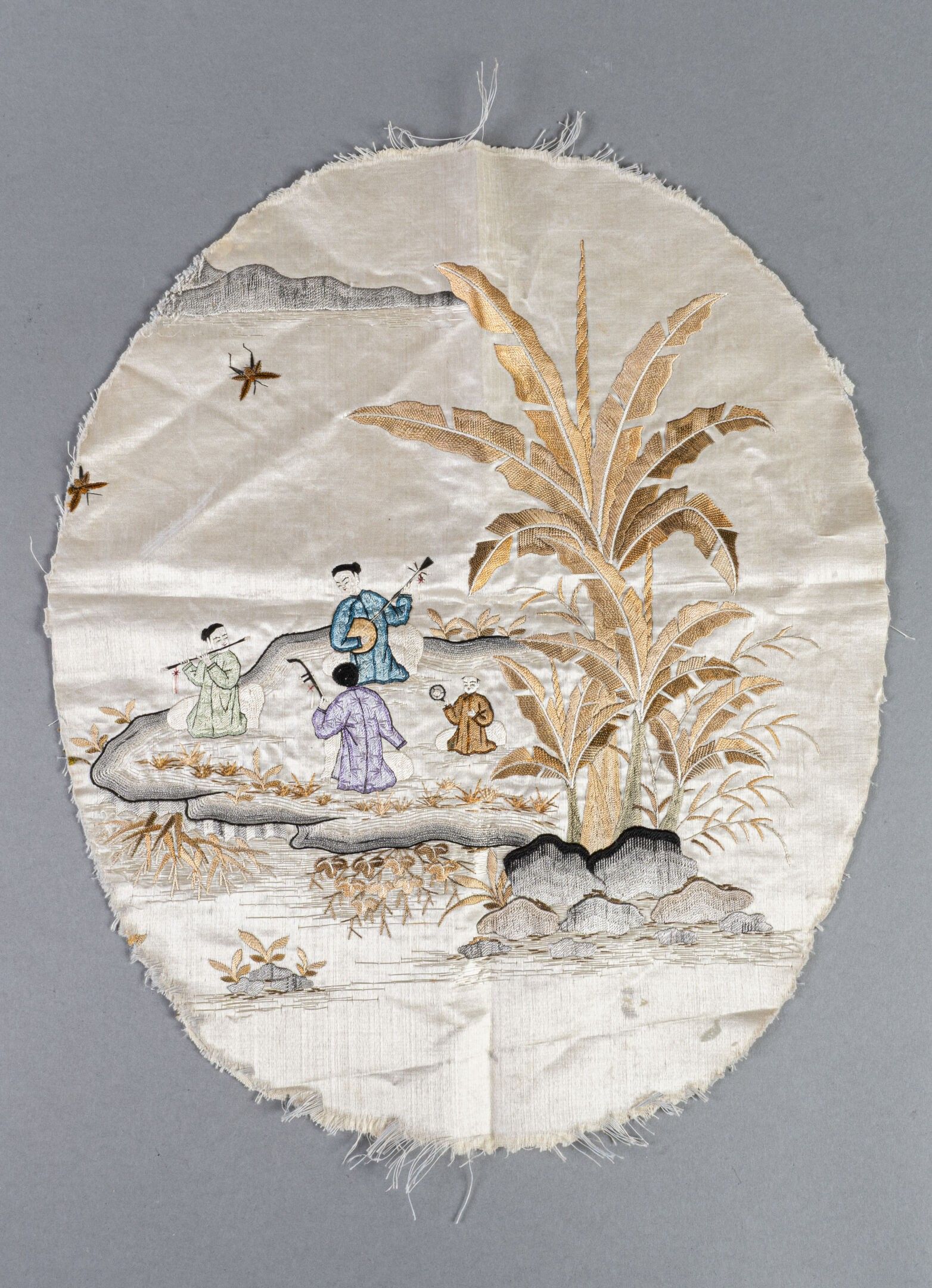 Small oval panel (armchair back) in pearl silk embroidered with seated musicians (three female musicians and a child) beside rocks and banana trees on the banks of a river.