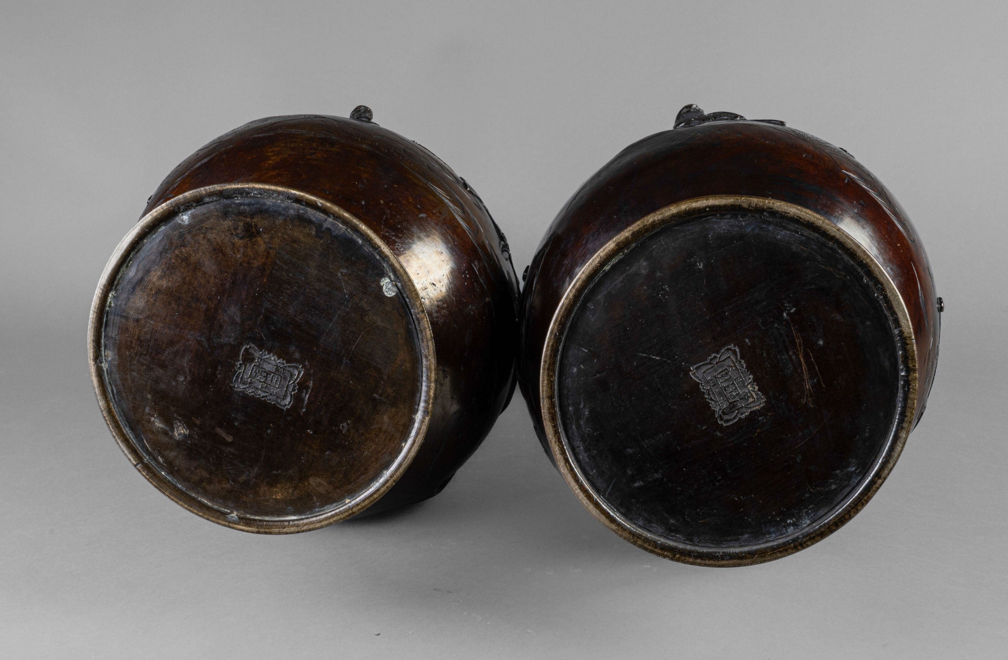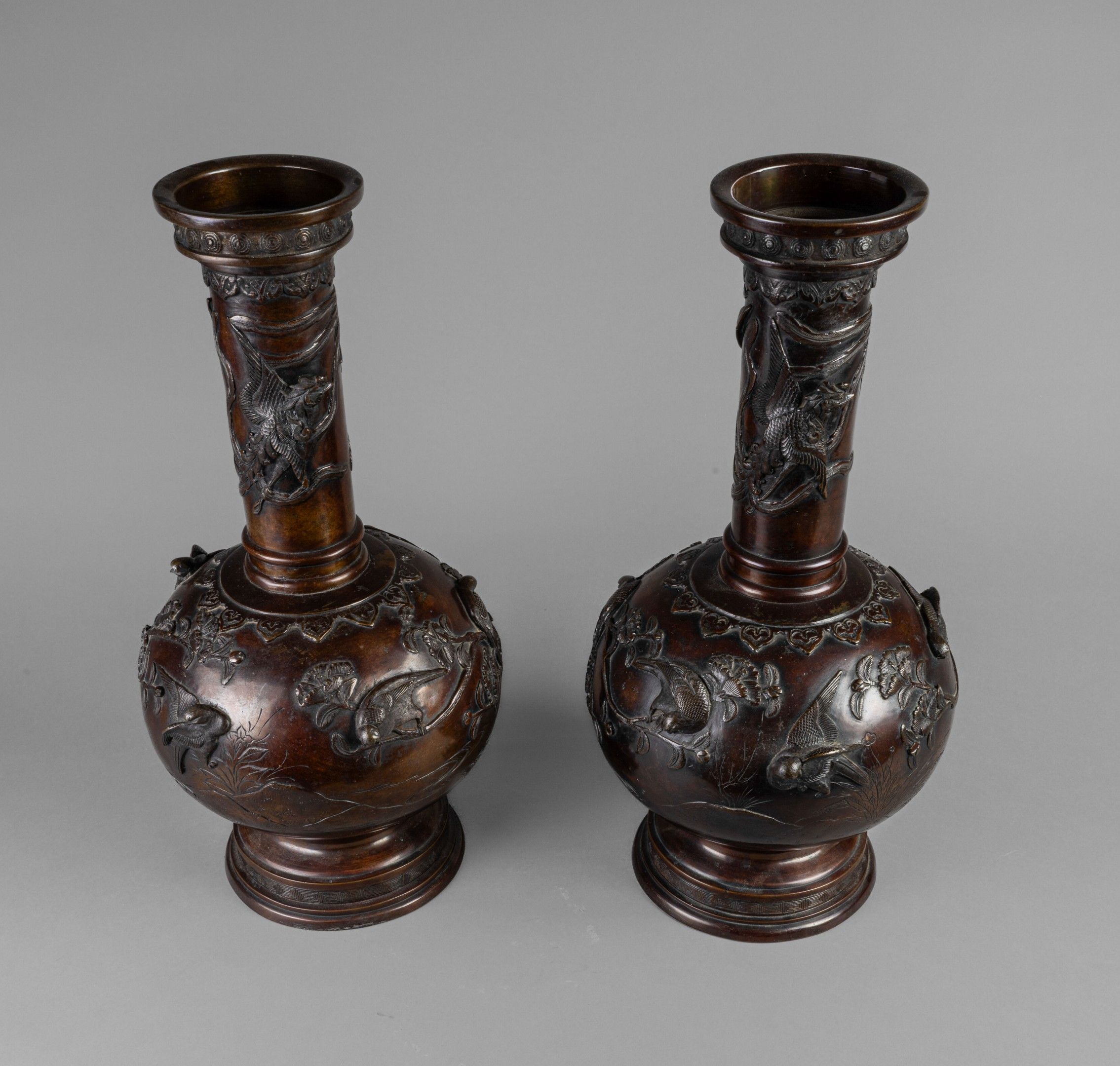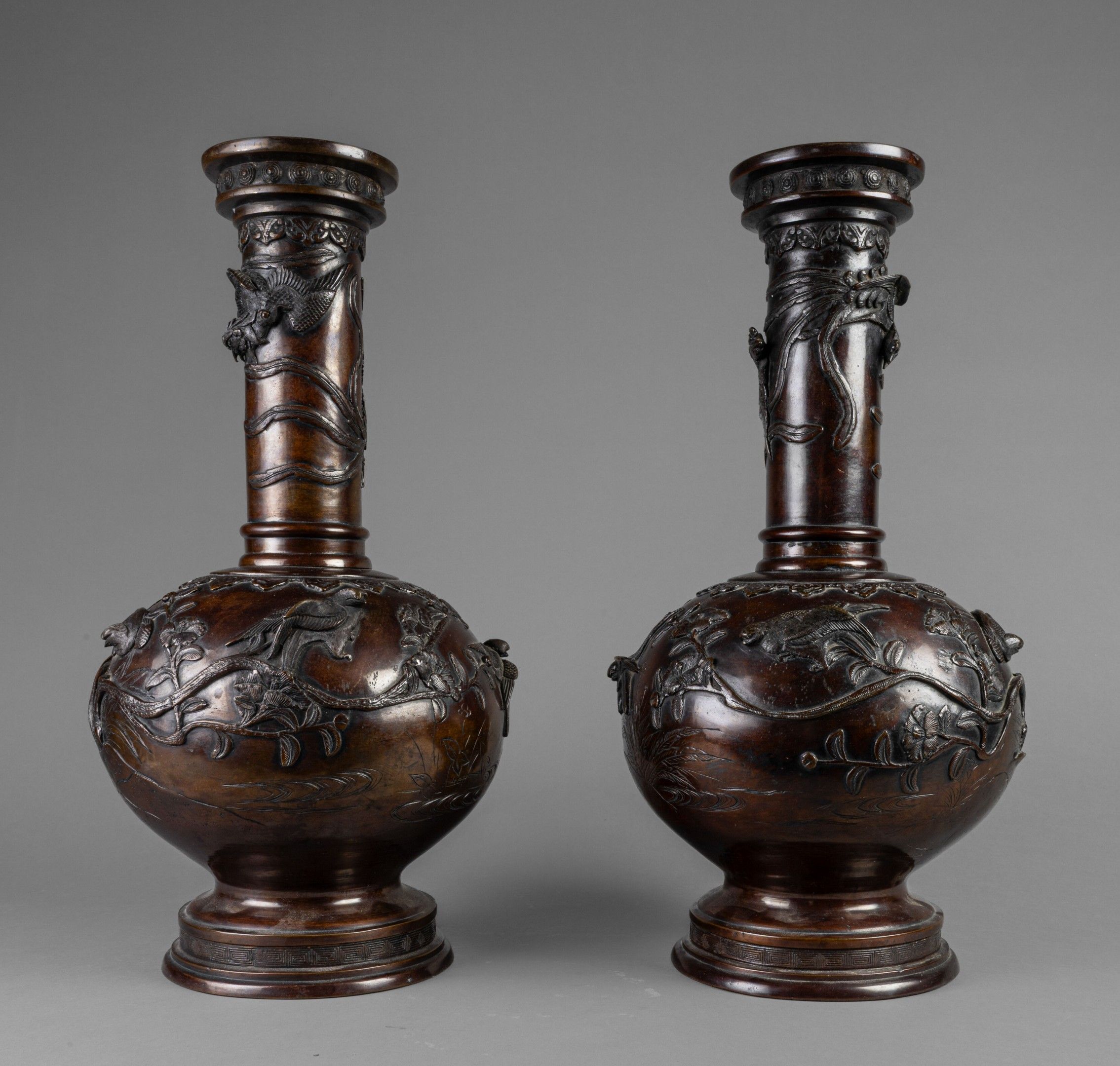 Pair of bronze vases with relief decoration of a phoenix in flight on the long neck, and birds around flowering shrubs on the globular body, copper patina, marked on the bases "Dai Nippon Nishikyo Murakami zo" (Made by Murakami of Kyoto, Japan)