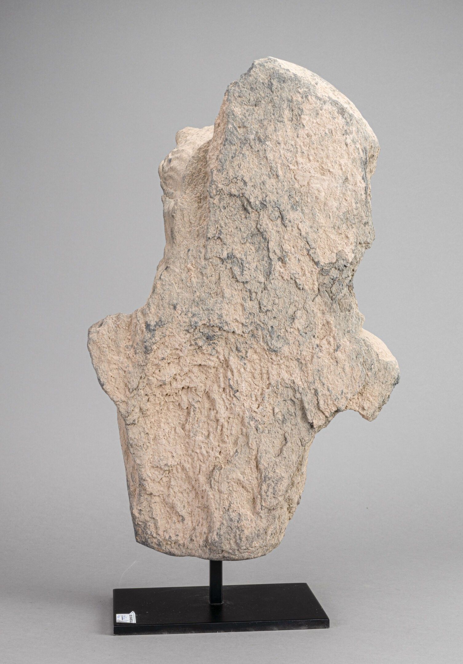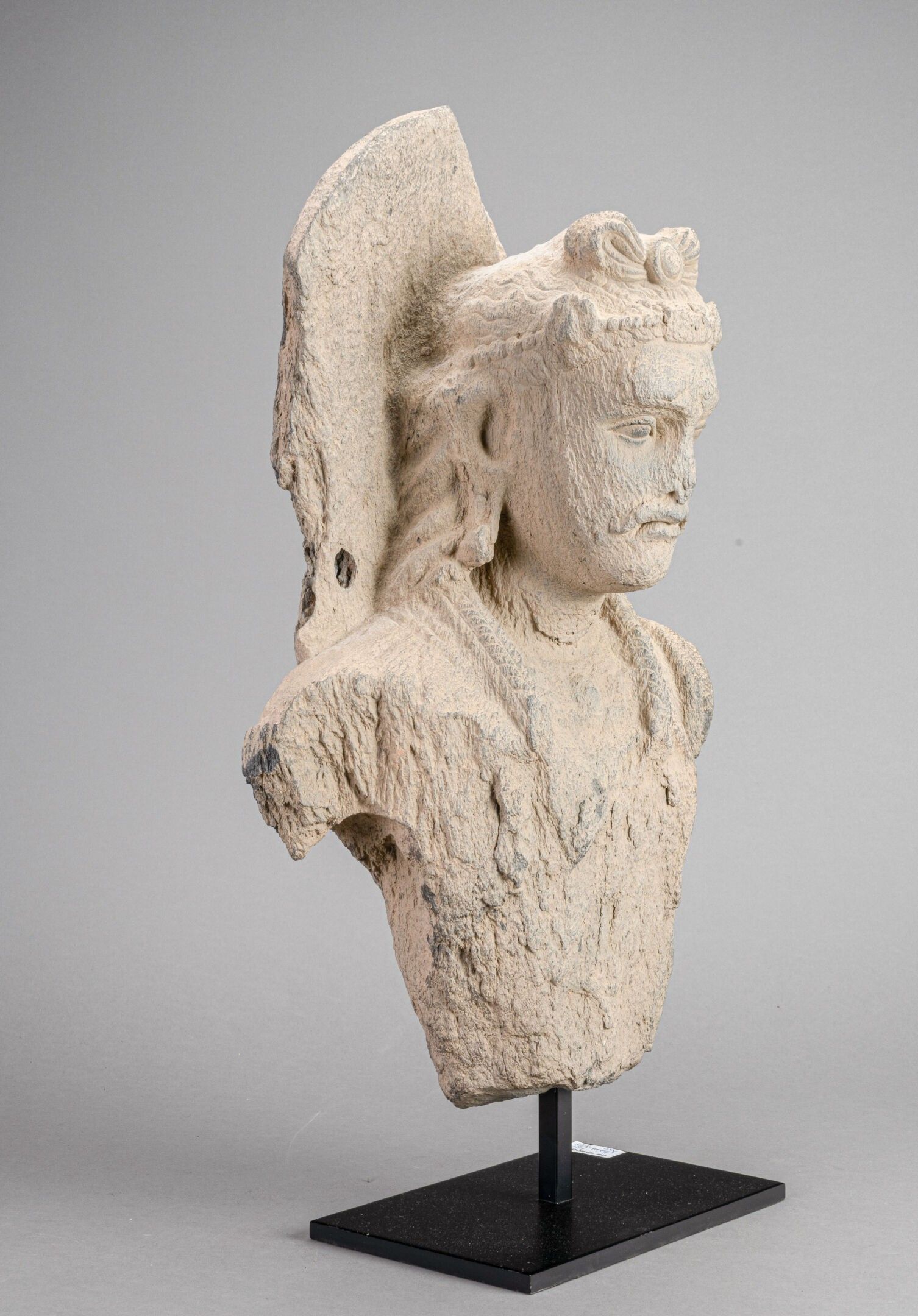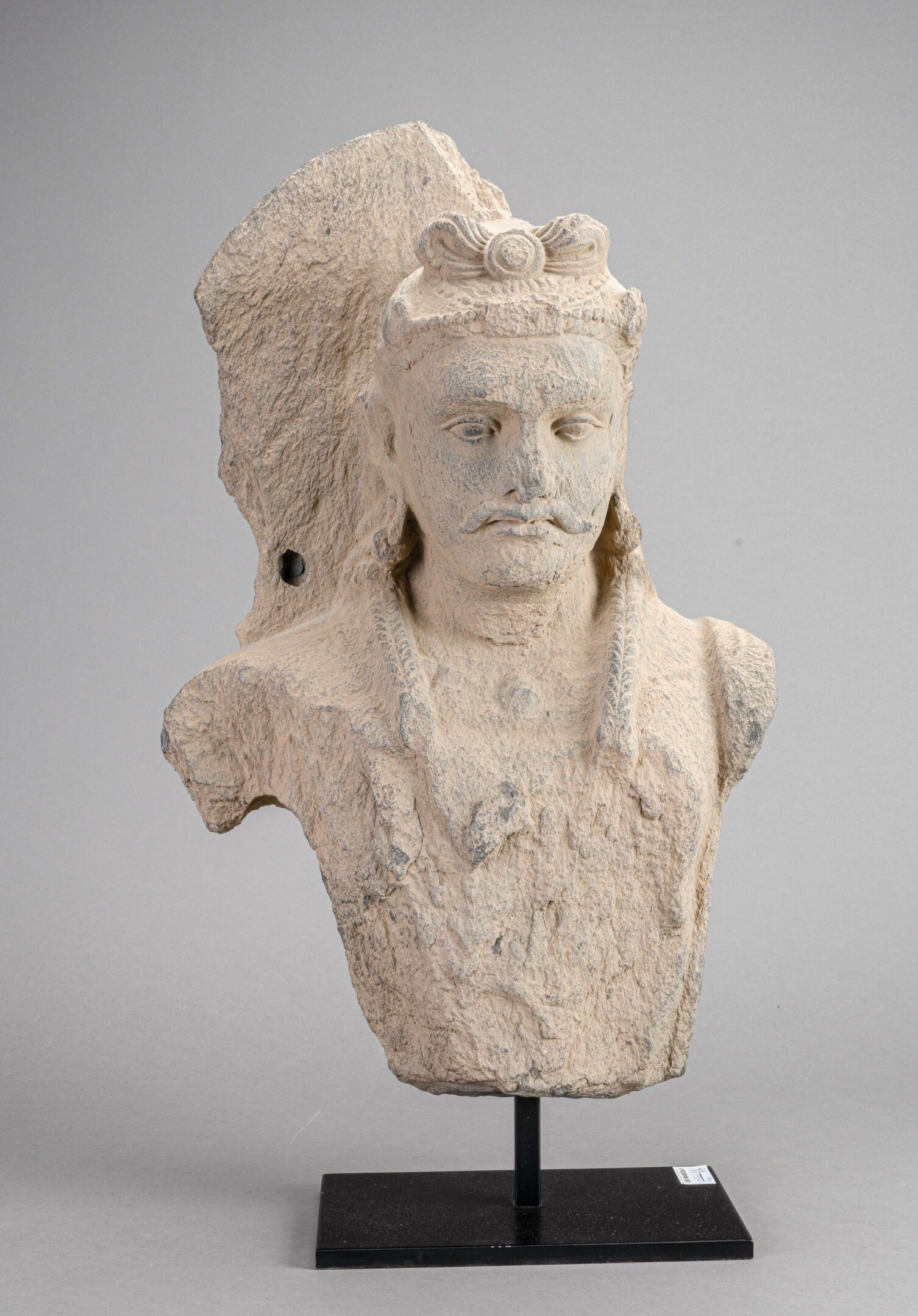 Gandhara, Greco-Buddhist art, 3rd century approx. Bust of a Bodhisattva in schist, head surrounded by a halo, wearing a moustache, long hair topped by a knot, a necklace on the torso. On a metal base H. 49 cm Provenance: Collection of M. C., Grenoble