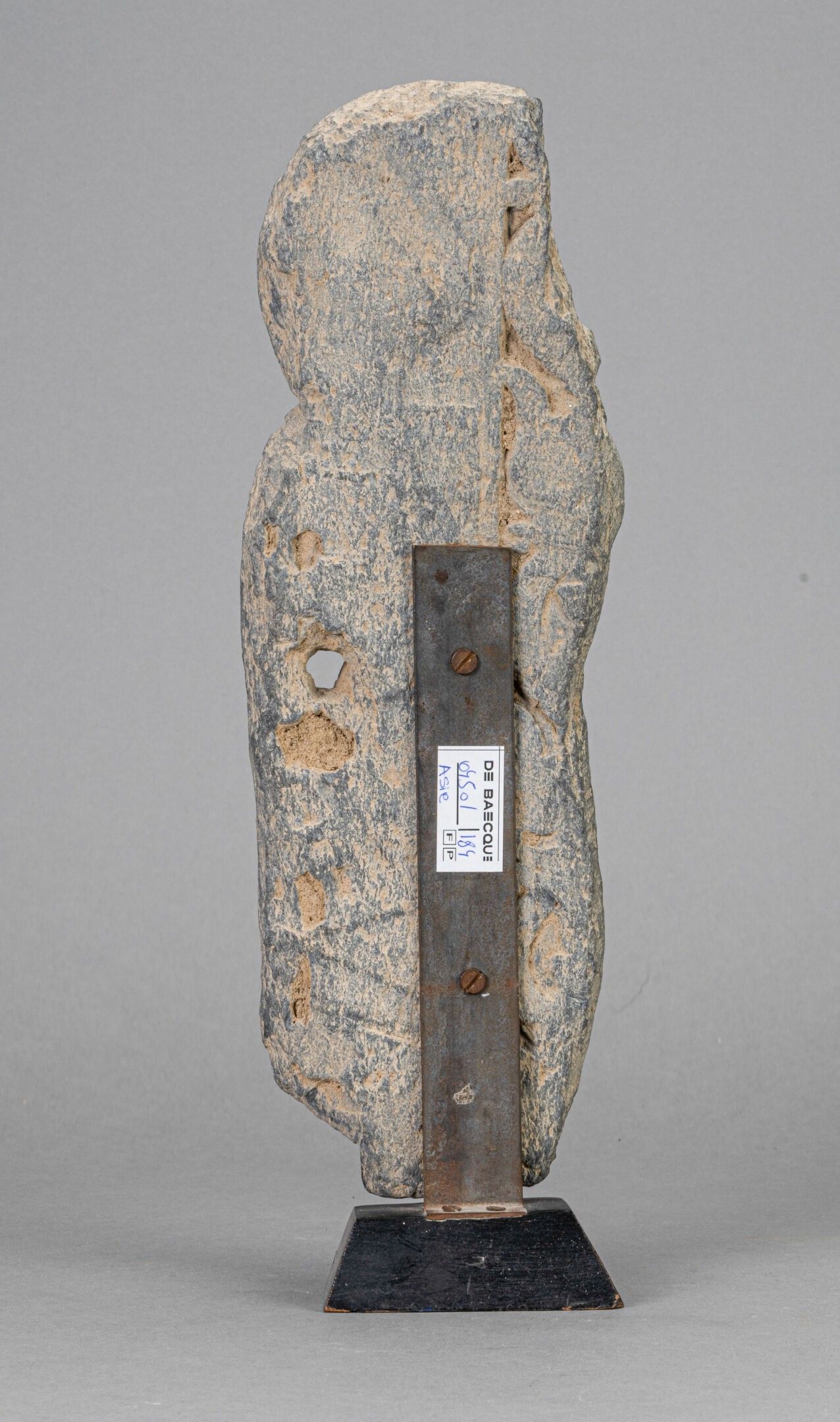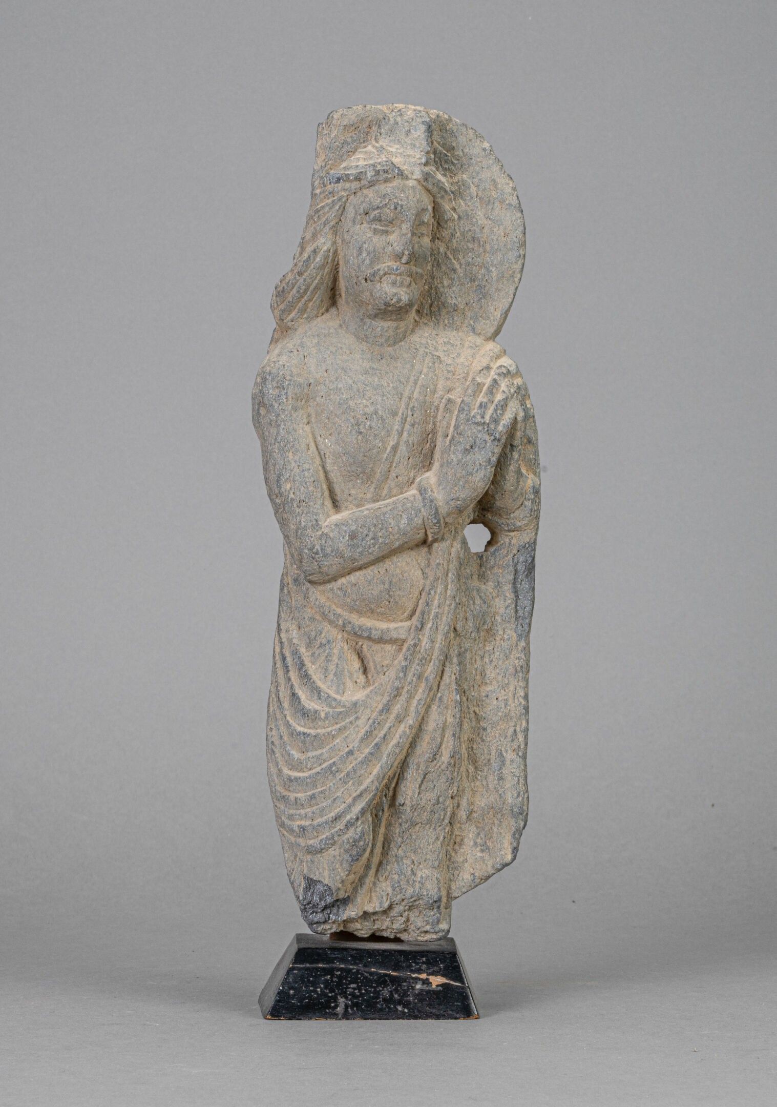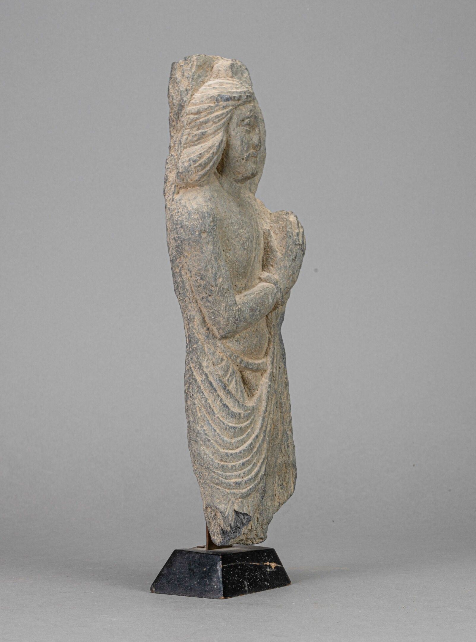 Gandhara, Greco-Buddhist art, 3rd century approx. Statuette of an orant in grey schist, depicted standing, head surrounded by a nimbus, hands in anjali mudra, his robe covering his left shoulder, face serene (with detached wooden base) H. 29.5 cm Provenance: Collection of M. C., Grenoble Collection of a French diplomat, established in Asia in the 1960s