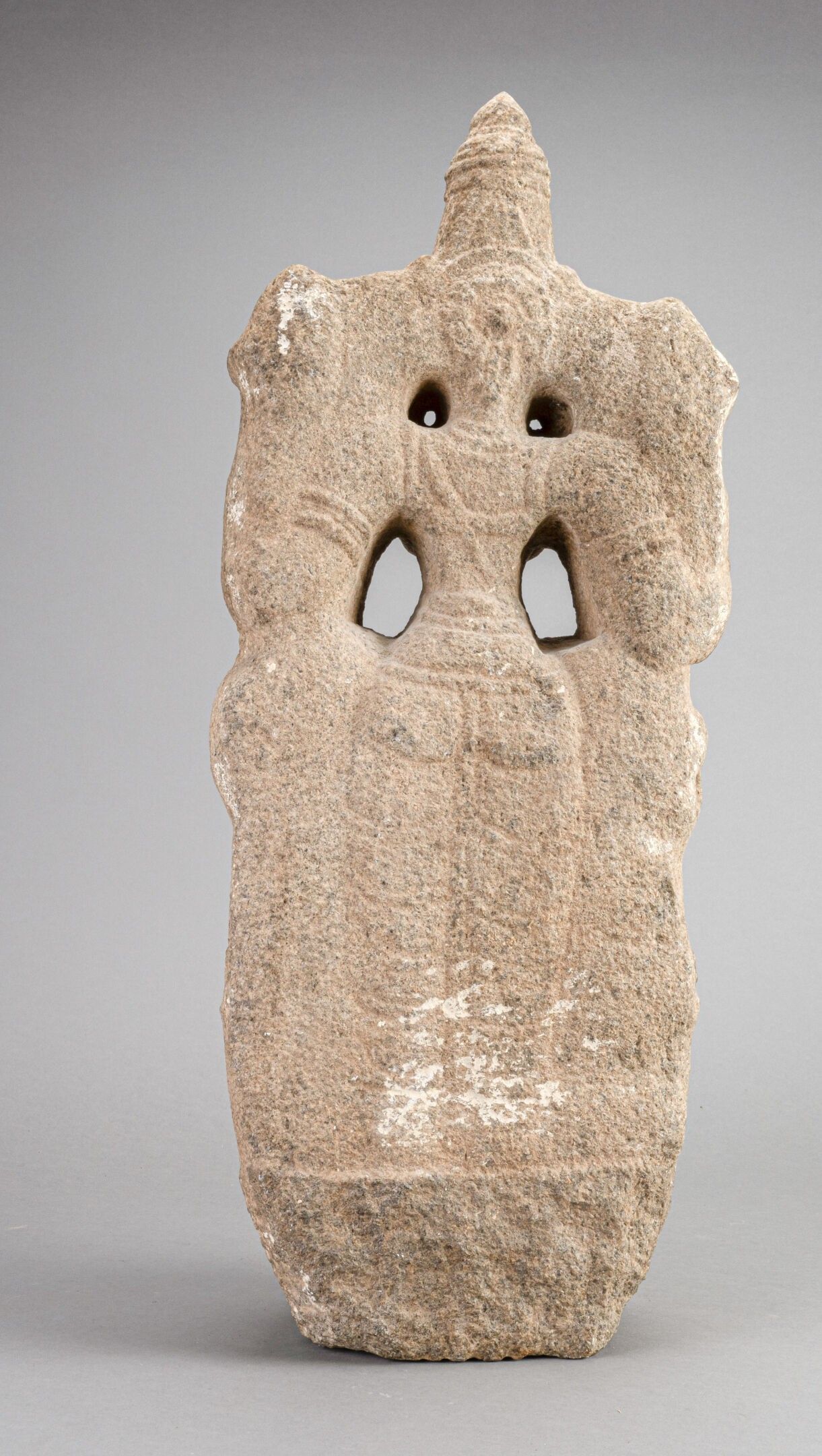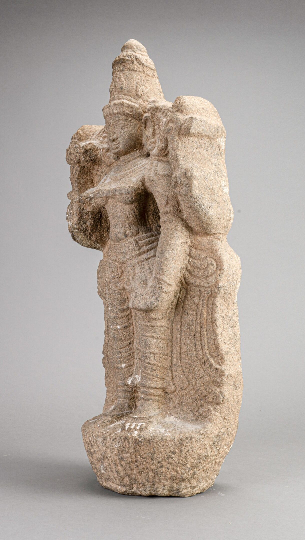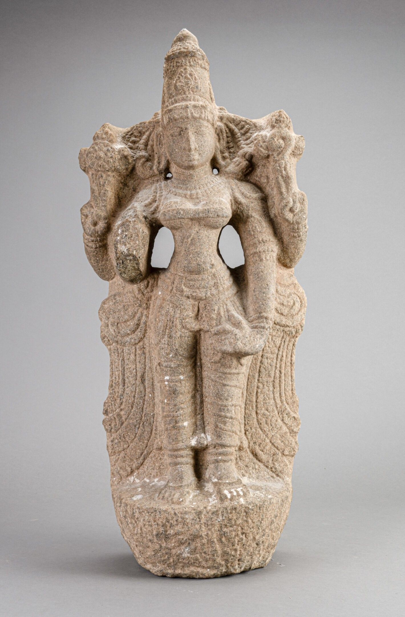 South India, Tamil Nadu, late Chola period, 12th / 13th century, Granite statue of the goddess Lakshmi, depicted standing, taking on the features of Vishnu, her lower right hand in abhaya-mudra, the upper holding the wheel, the upper left the conch, and the lower right holding the club. H. 67 cm Provenance: M. C. Collection, Grenoble Collection of a Belgian amateur