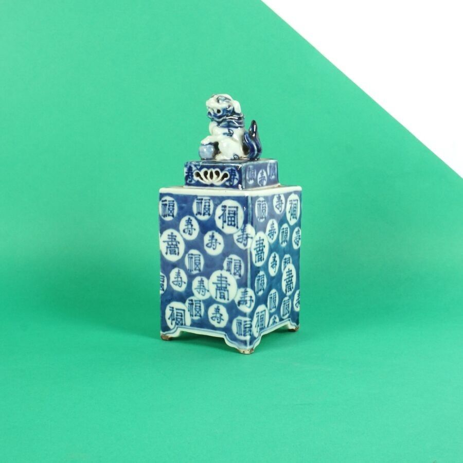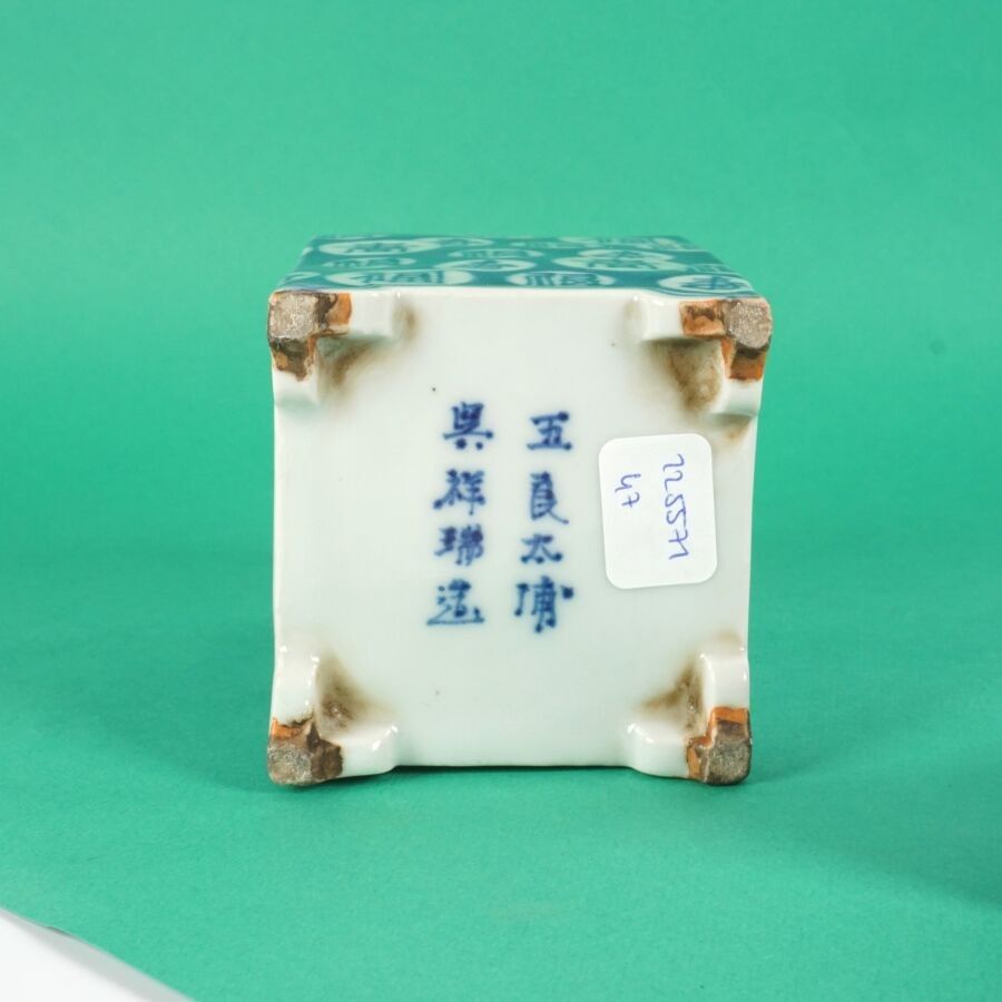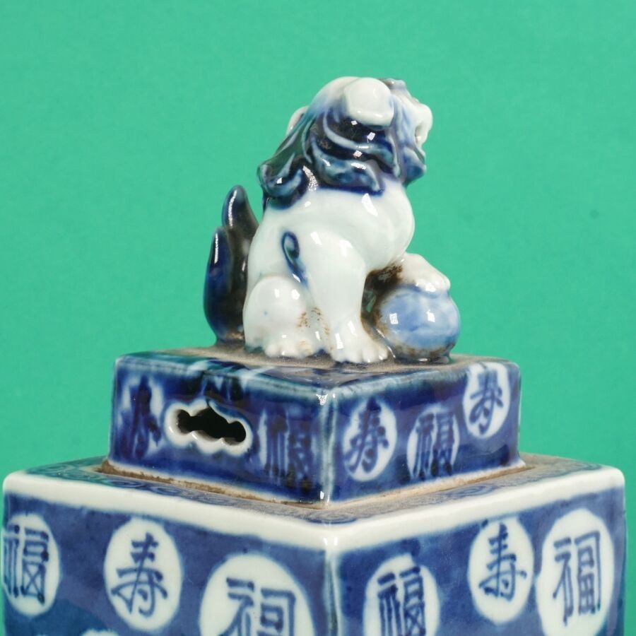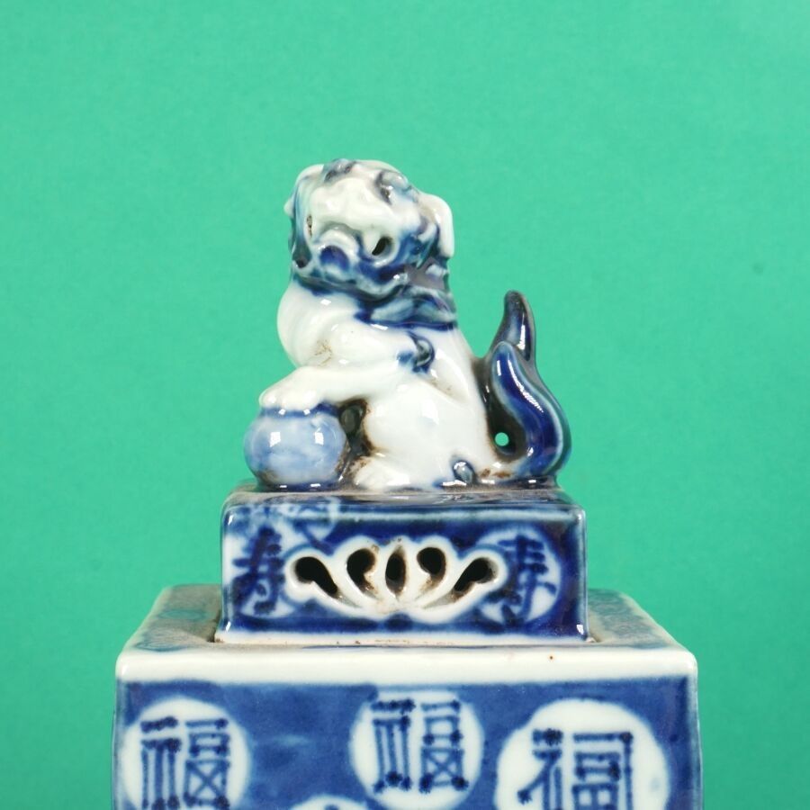 A blue-white porcelain quadrangular incense burner decorated with calligraphy in medallions, the handle surmounted by a shishi, calligraphy on the reverse Gorodaiyu go Shonzui (Chinese name "Wu Xiangrui"), Japan, 19th century H. 16.5 x 6.9 x 6.9 cm.