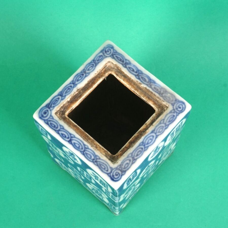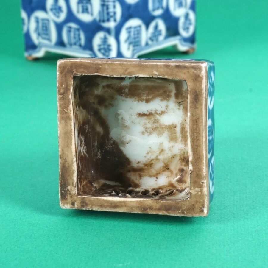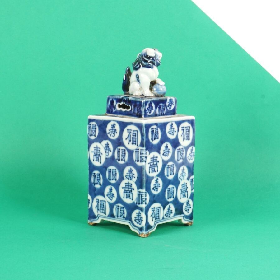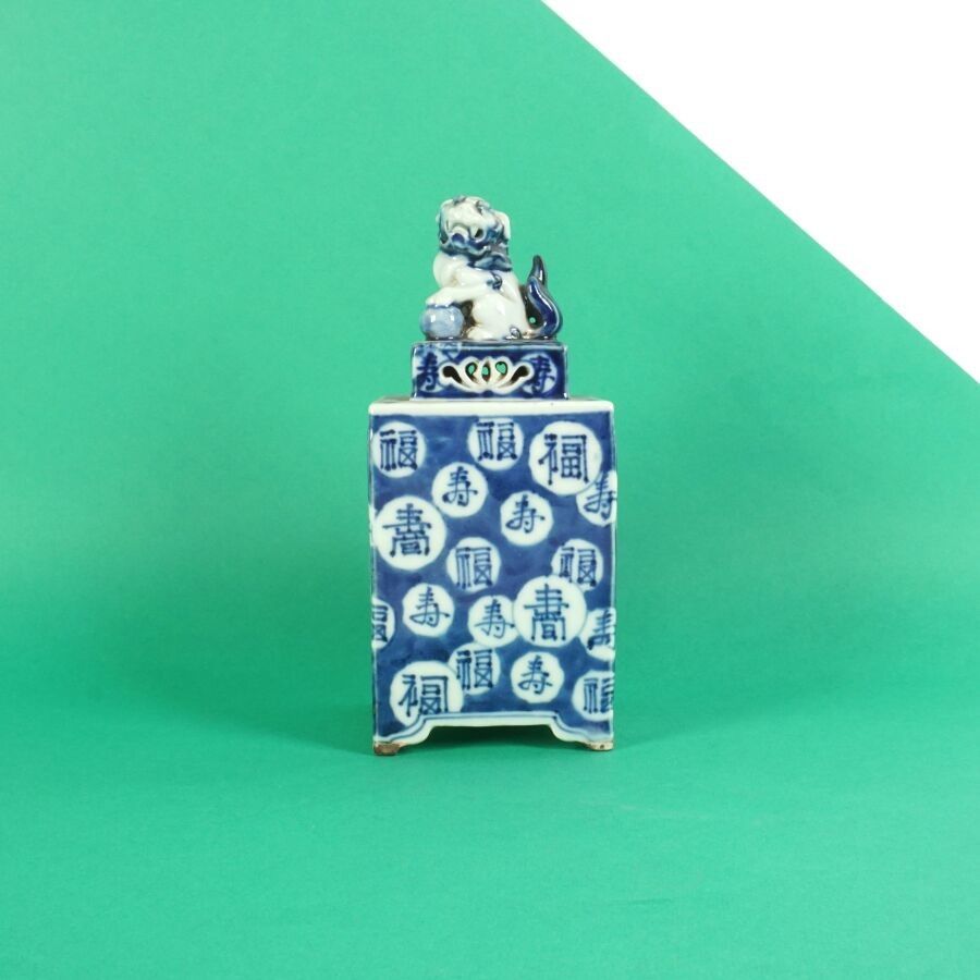A blue-white porcelain quadrangular incense burner decorated with calligraphy in medallions, the handle surmounted by a shishi, calligraphy on the reverse Gorodaiyu go Shonzui (Chinese name "Wu Xiangrui"), Japan, 19th century H. 16.5 x 6.9 x 6.9 cm.