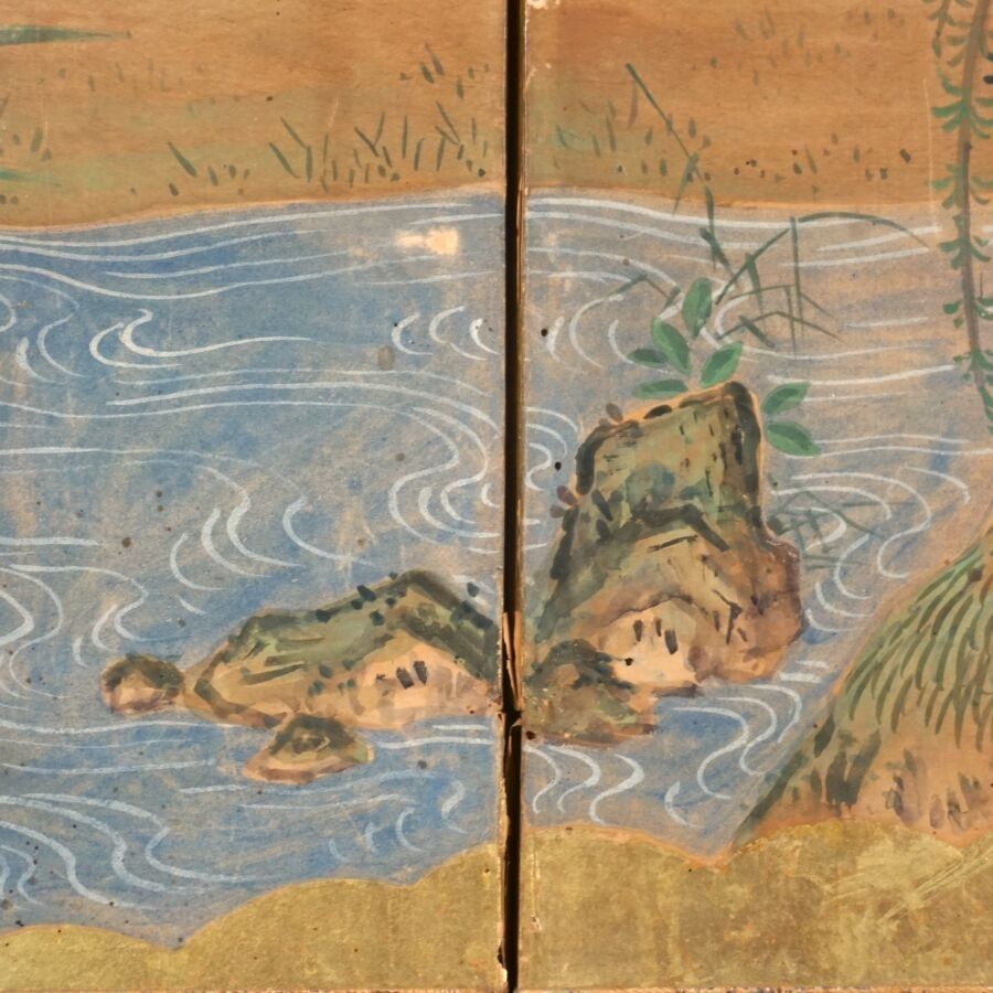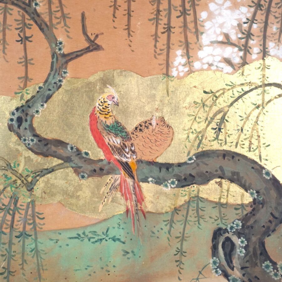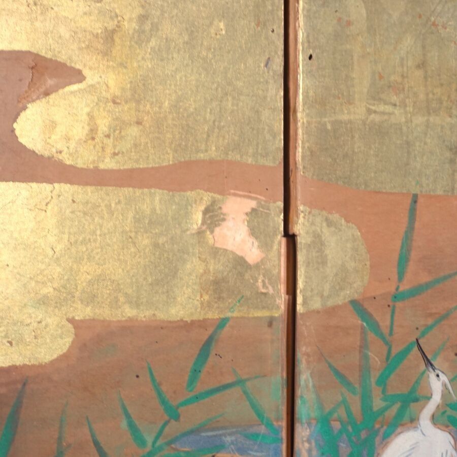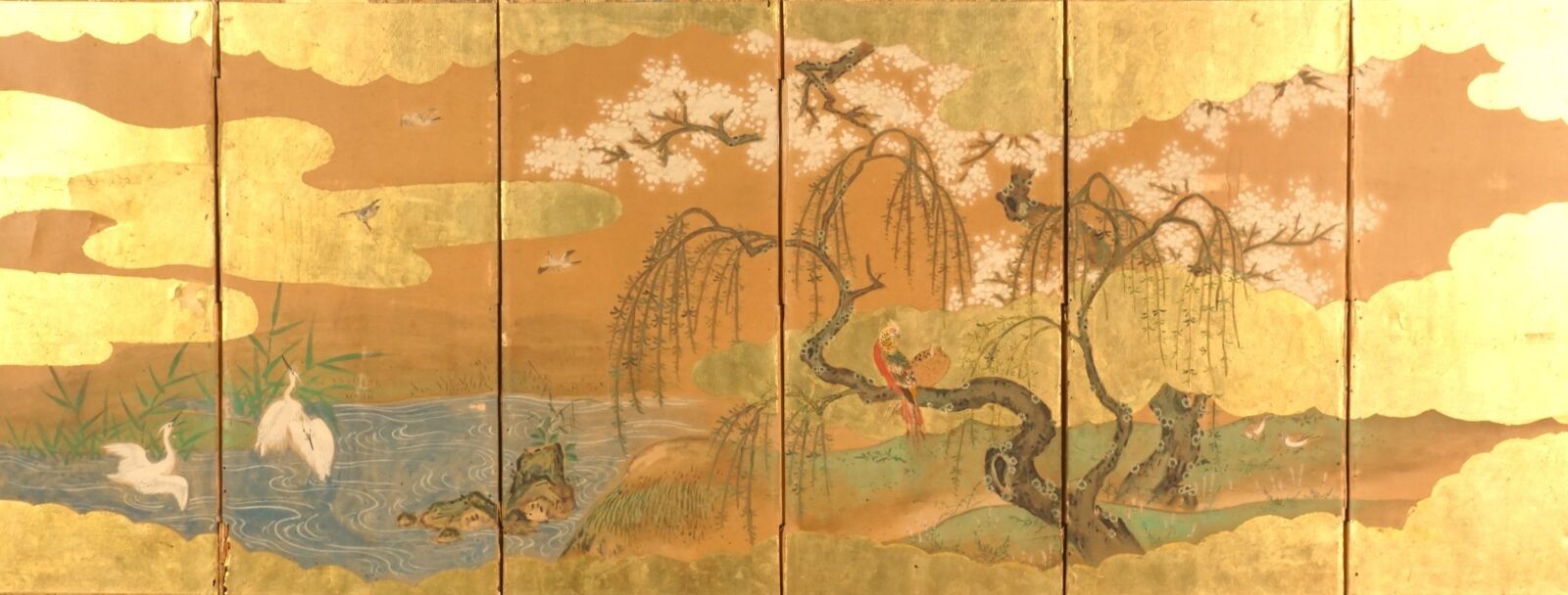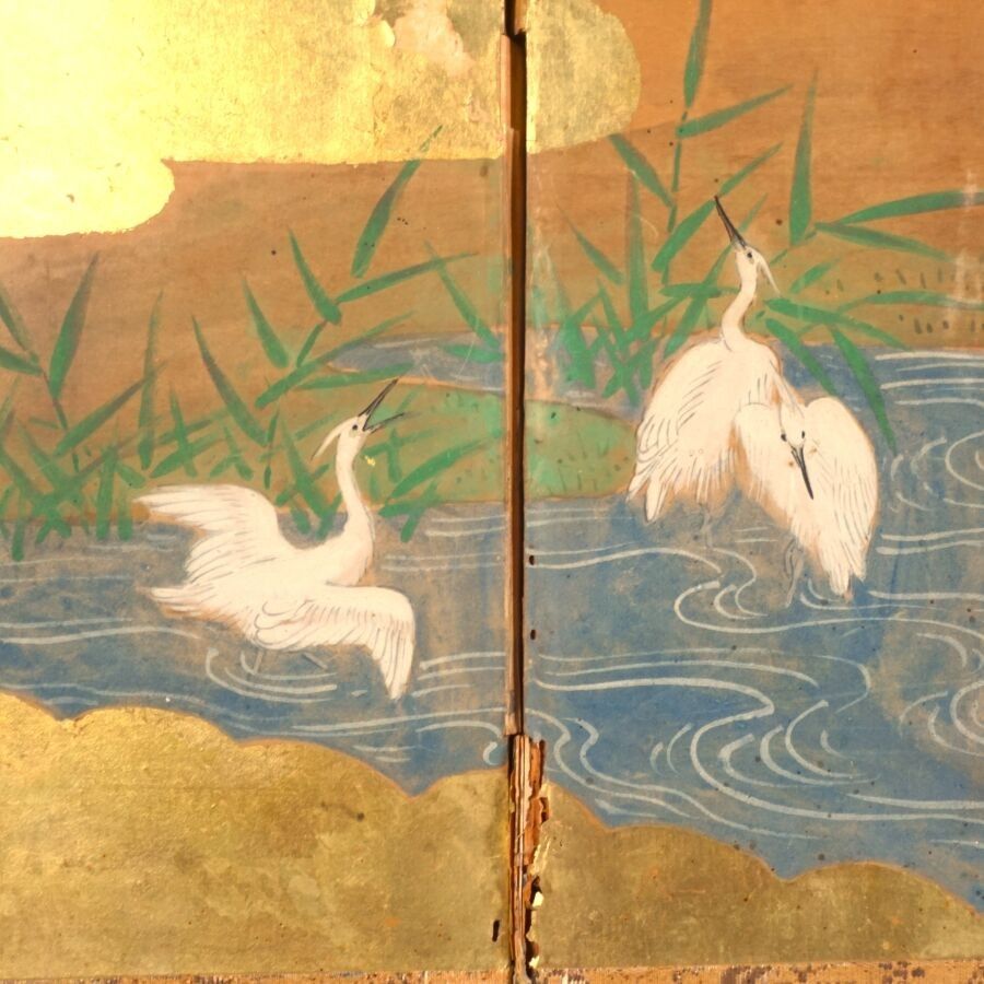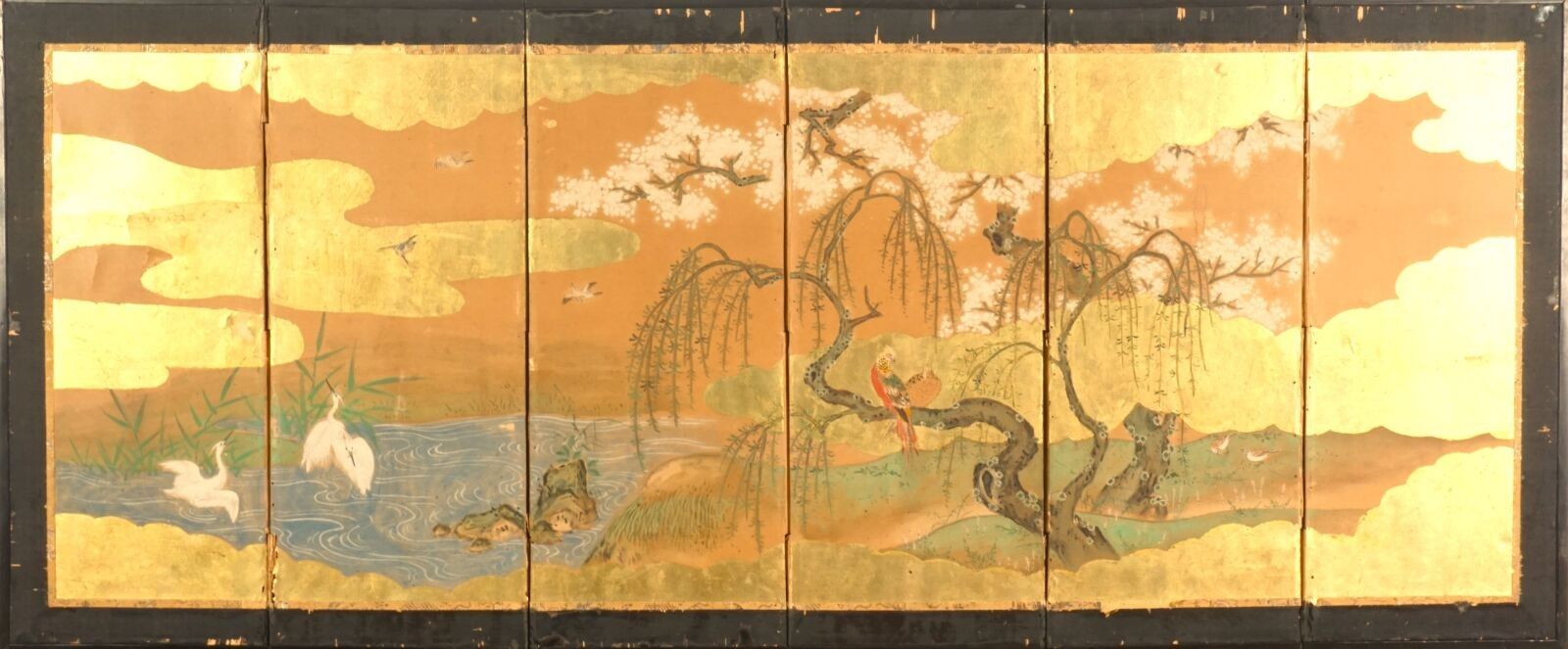 Six-leaf screen in ink, colour and gold highlights on paper decorated with cranes emerging from the waves among bamboo branches, pheasants perched on a weeping willow branch and flying birds, Japan, Meiji period, Dim. 41.5 x 102 cm (tears and wear).