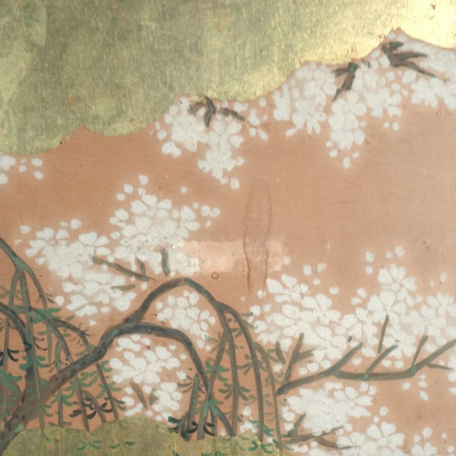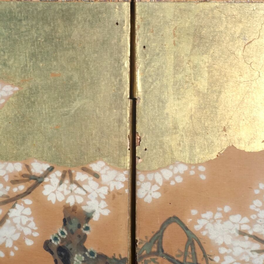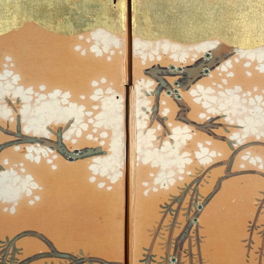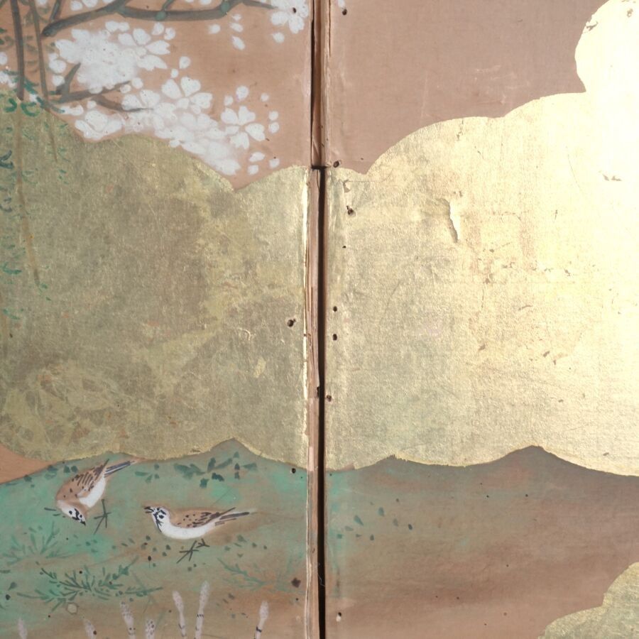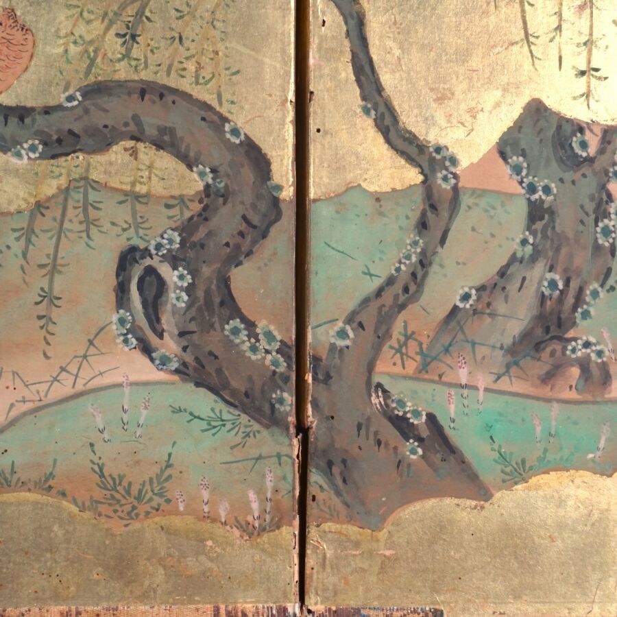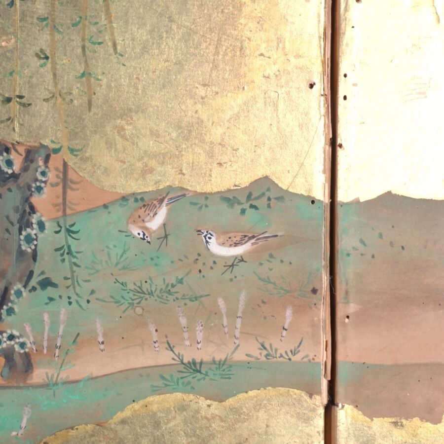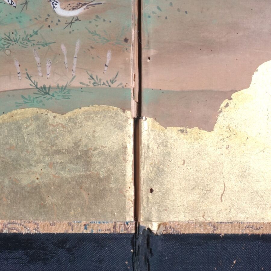 Six-leaf screen in ink, colour and gold highlights on paper decorated with cranes emerging from the waves among bamboo branches, pheasants perched on a weeping willow branch and flying birds, Japan, Meiji period, Dim. 41.5 x 102 cm (tears and wear).