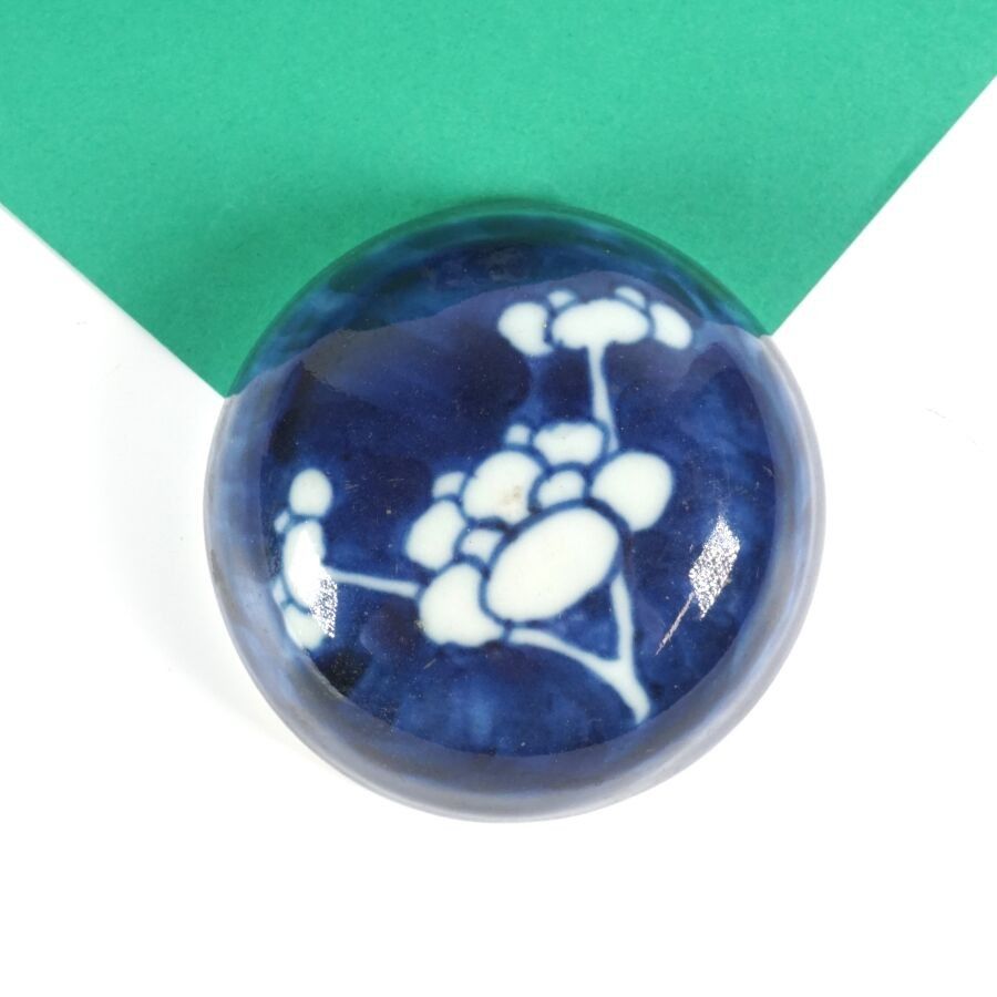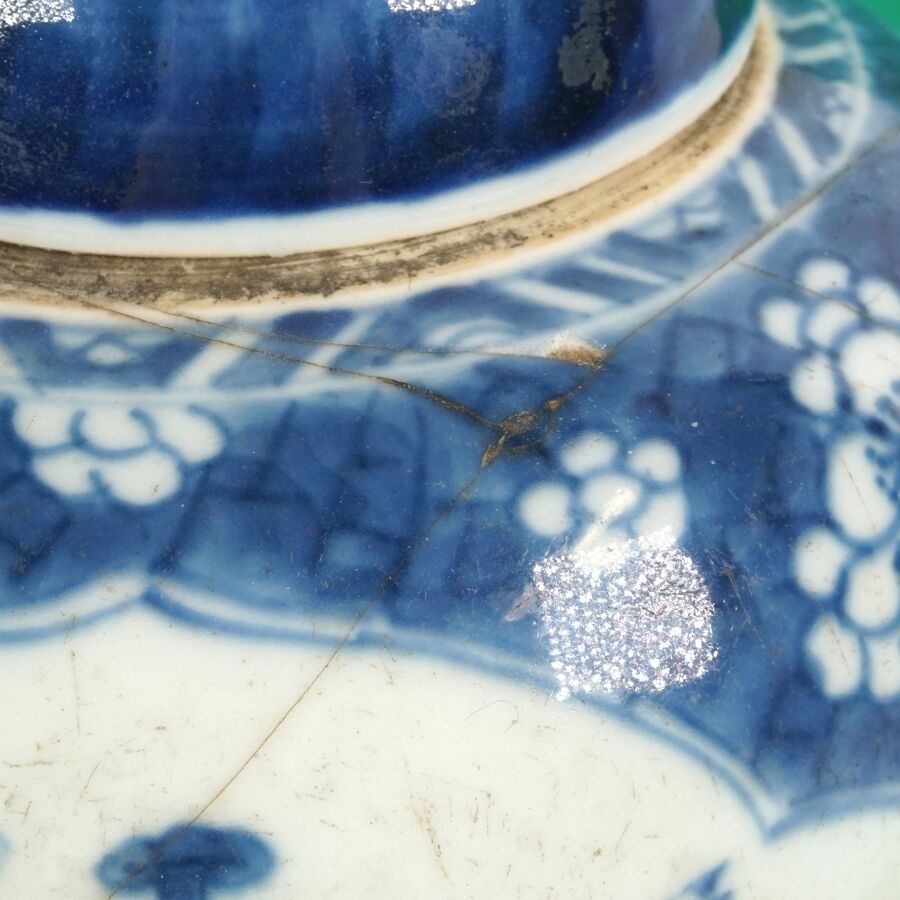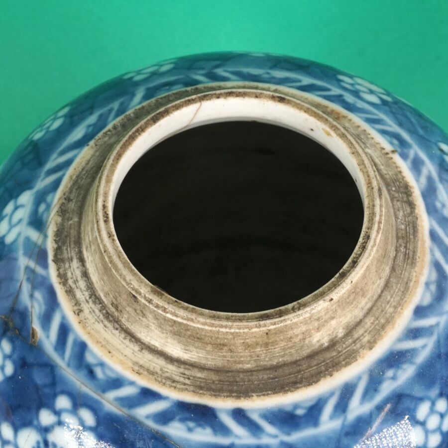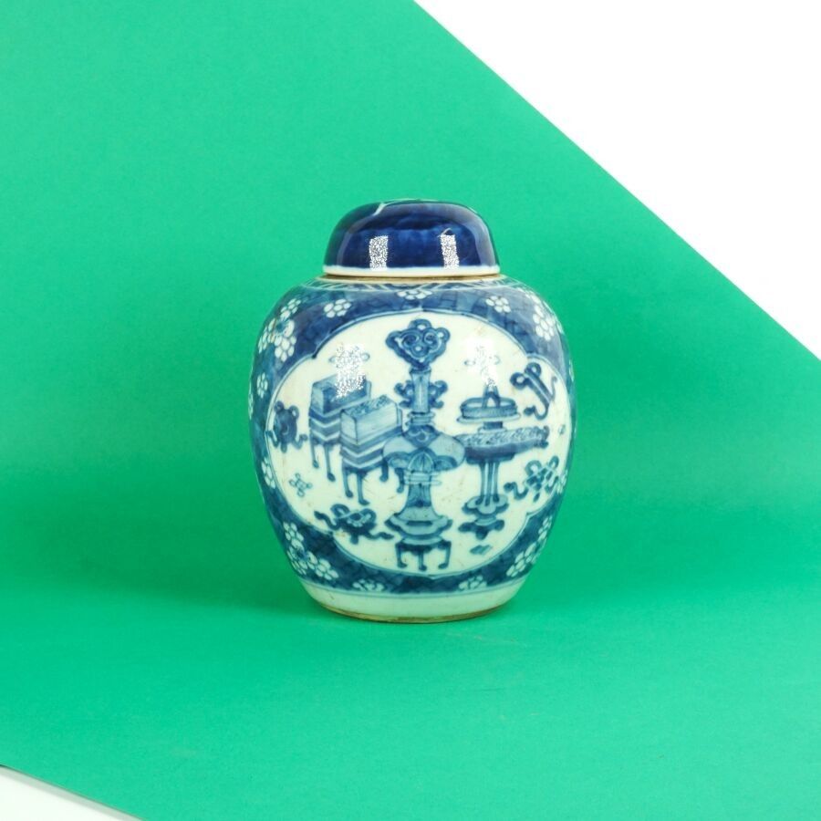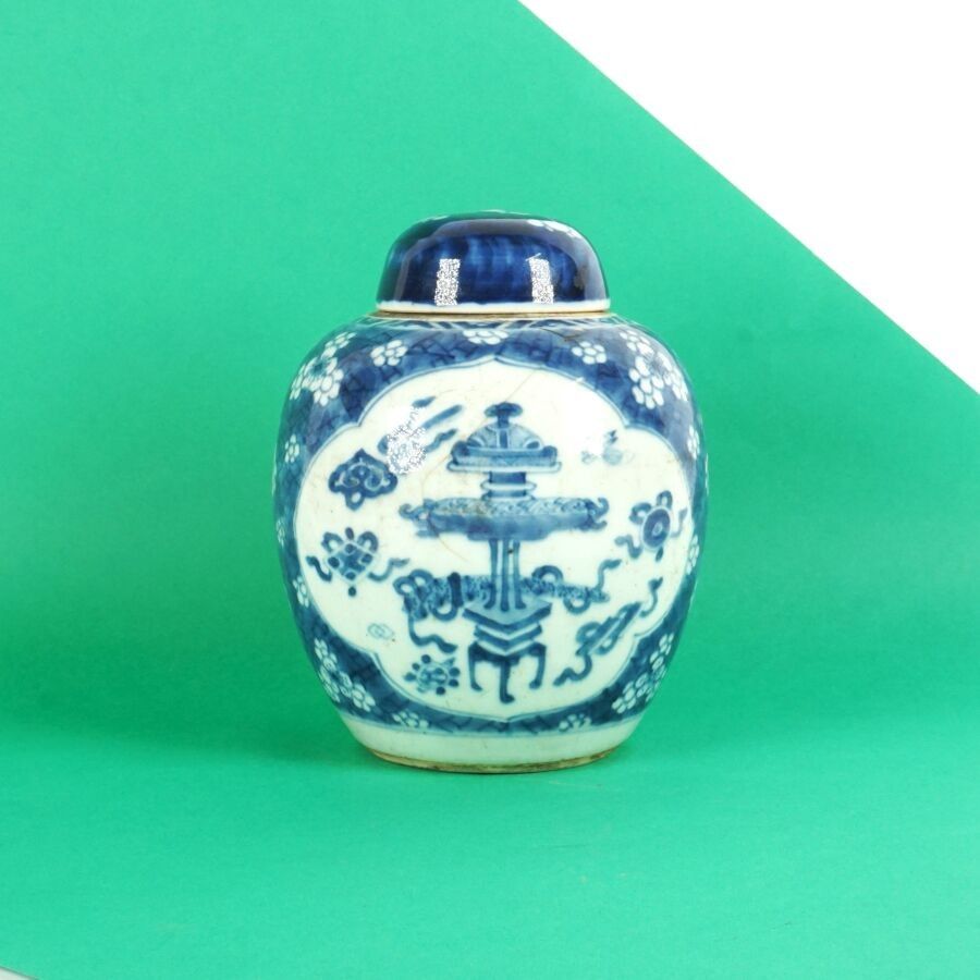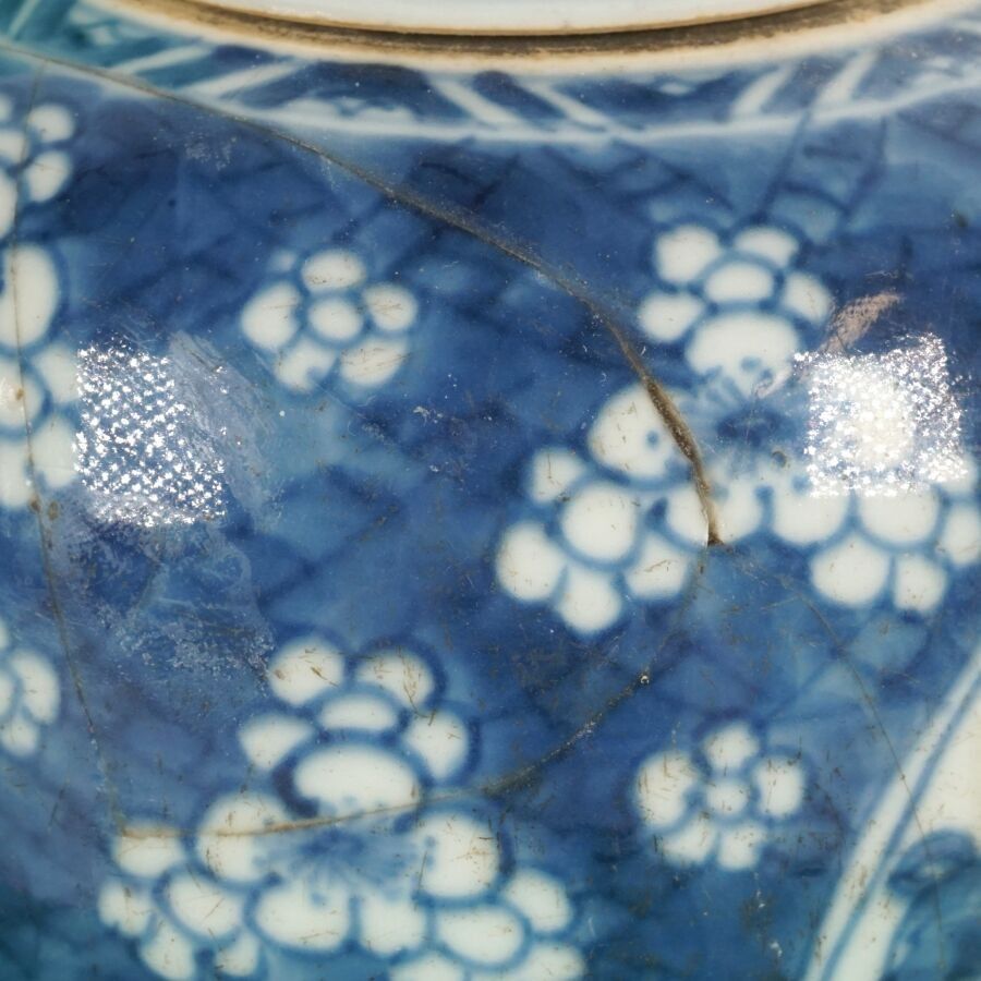 A white porcelain covered ginger pot, decorated in blue underglaze, with medallions of household objects on a background of prunus flowers and broken glass, China, 19th century, H. 17.5 cm (extensive restoration).
