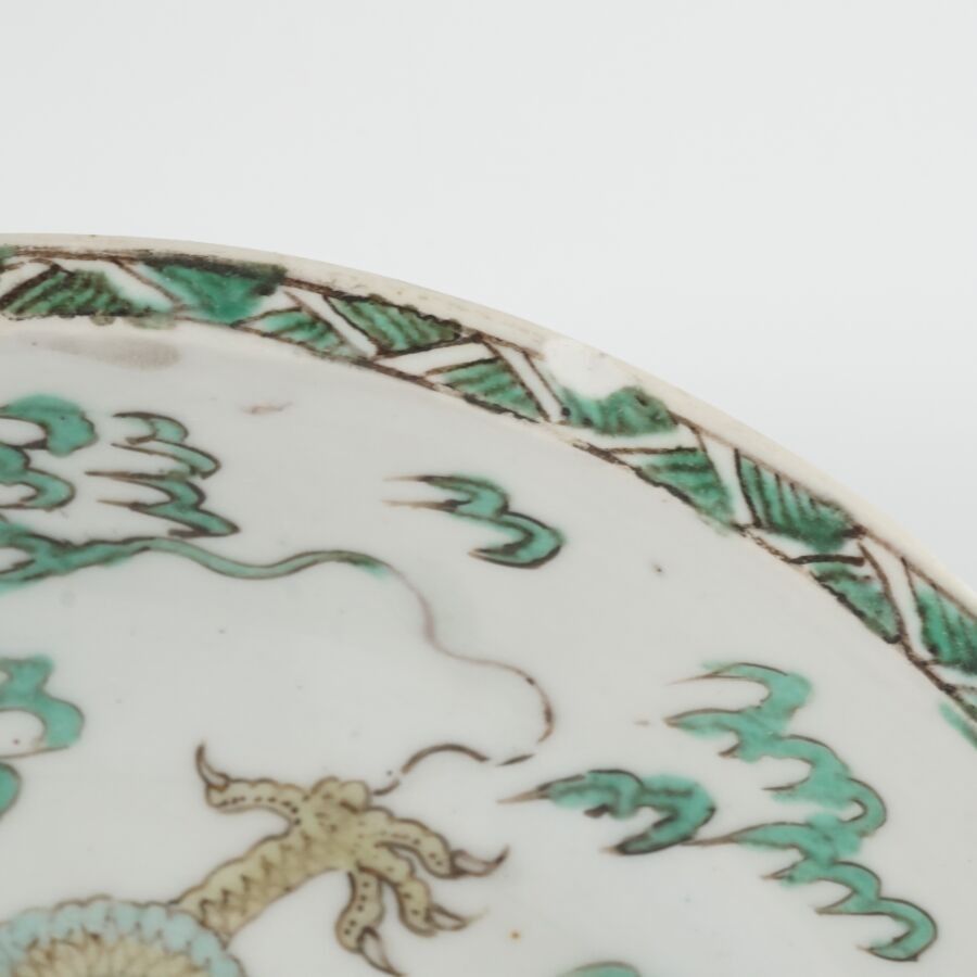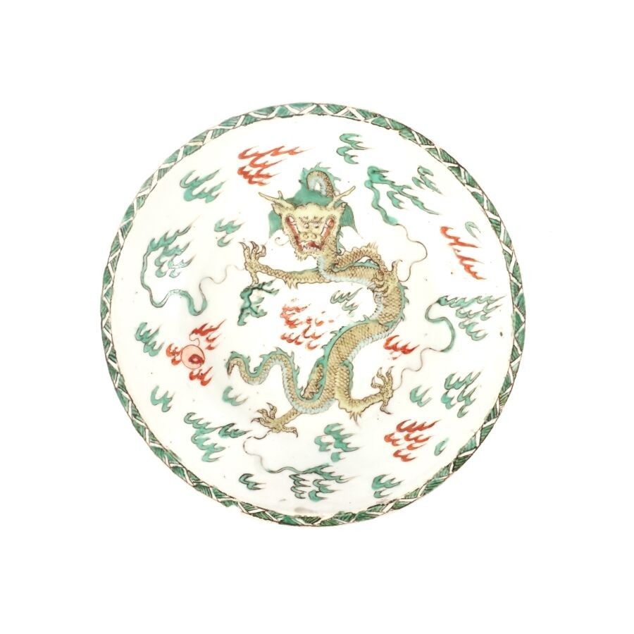 Soup bowl in porcelain and enamels of the green family, decorated with a dragon spread around the sacred jewel, among clouds, apocryphal mark Chenghua on the reverse, China, 18th century, D. 16.6 cm (tiny chip at the edge and heel).