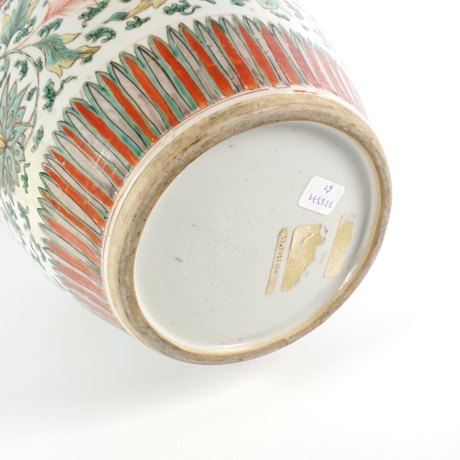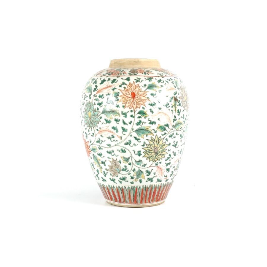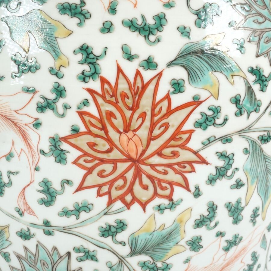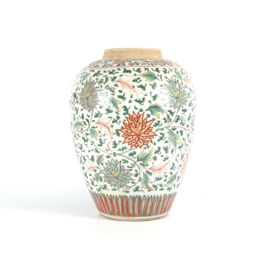 A green family style porcelain and enamel baluster vase, decorated with lotus flowers and foliage, China, late 19th century, H. 33.5 cm (lid missing).