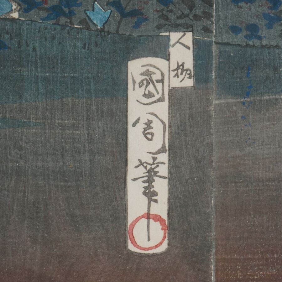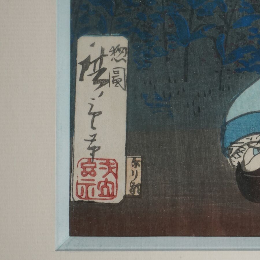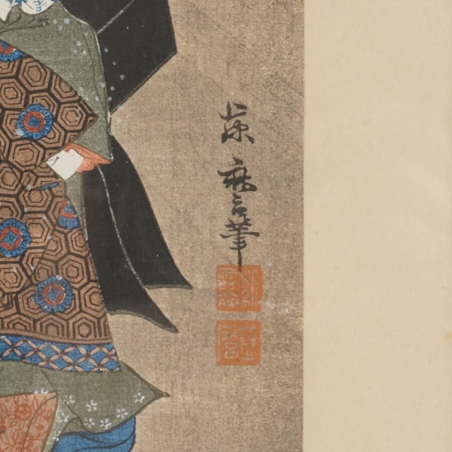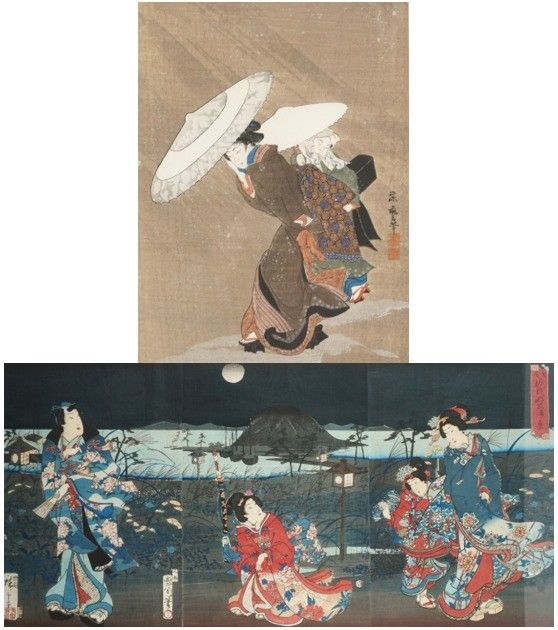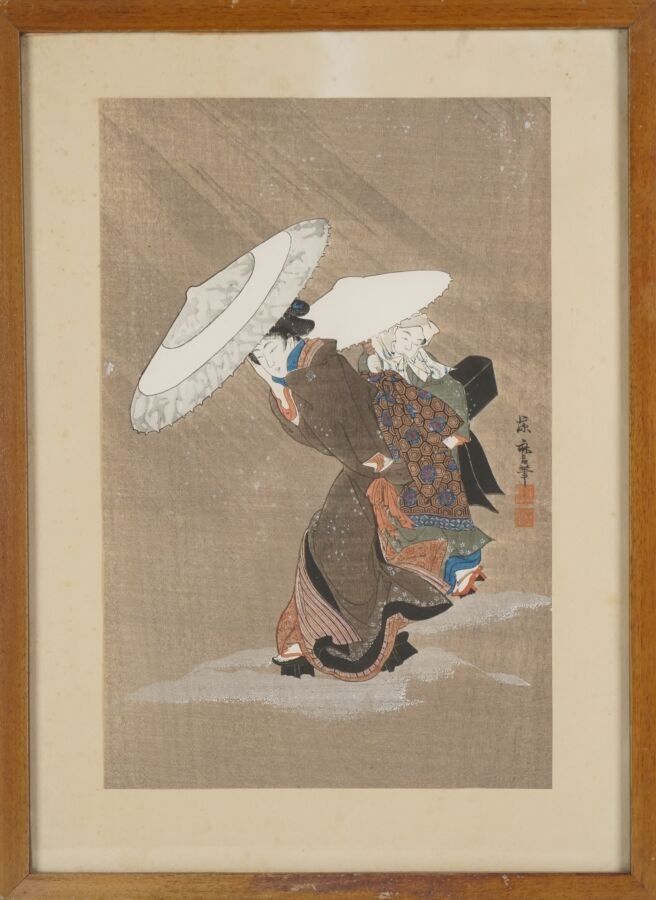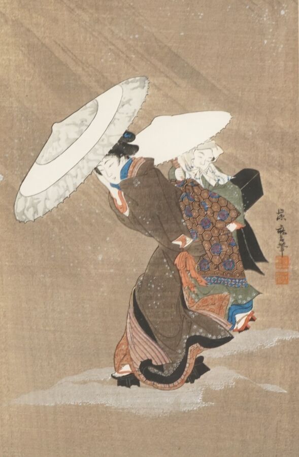 And a heightened print after Kitagawa Fujimaro titled "Beauty in the snow", 30 x 19.5 cm (on view).