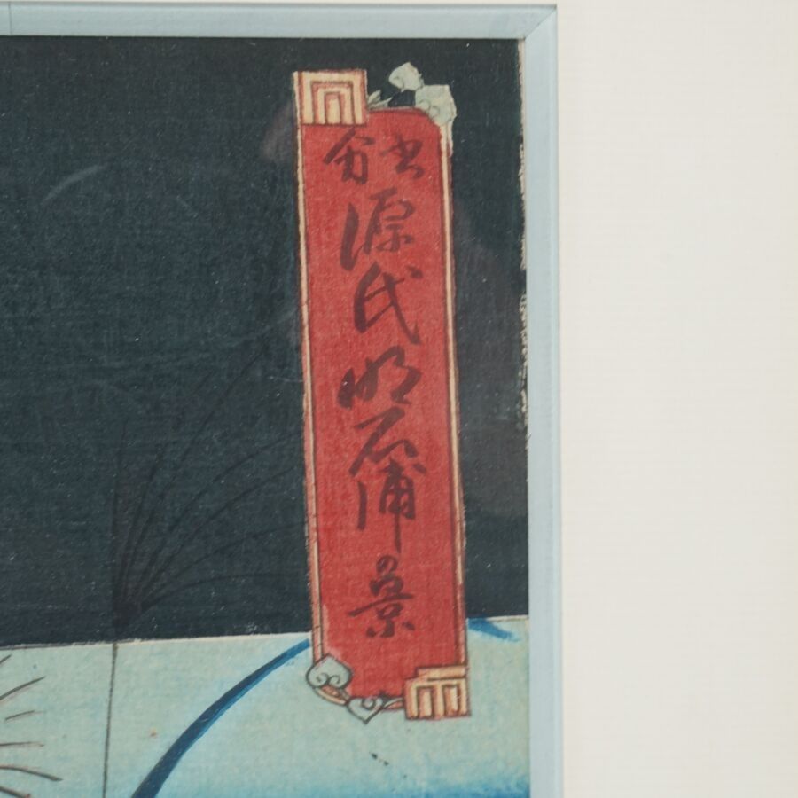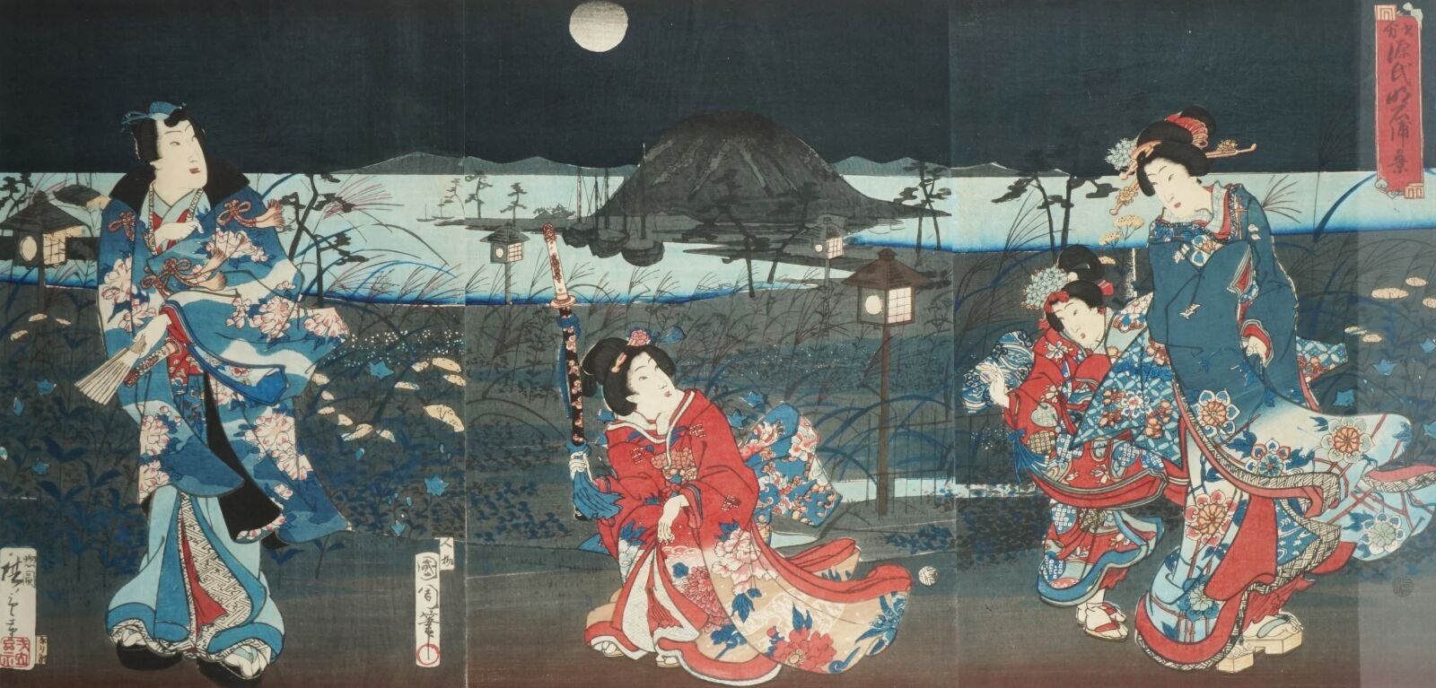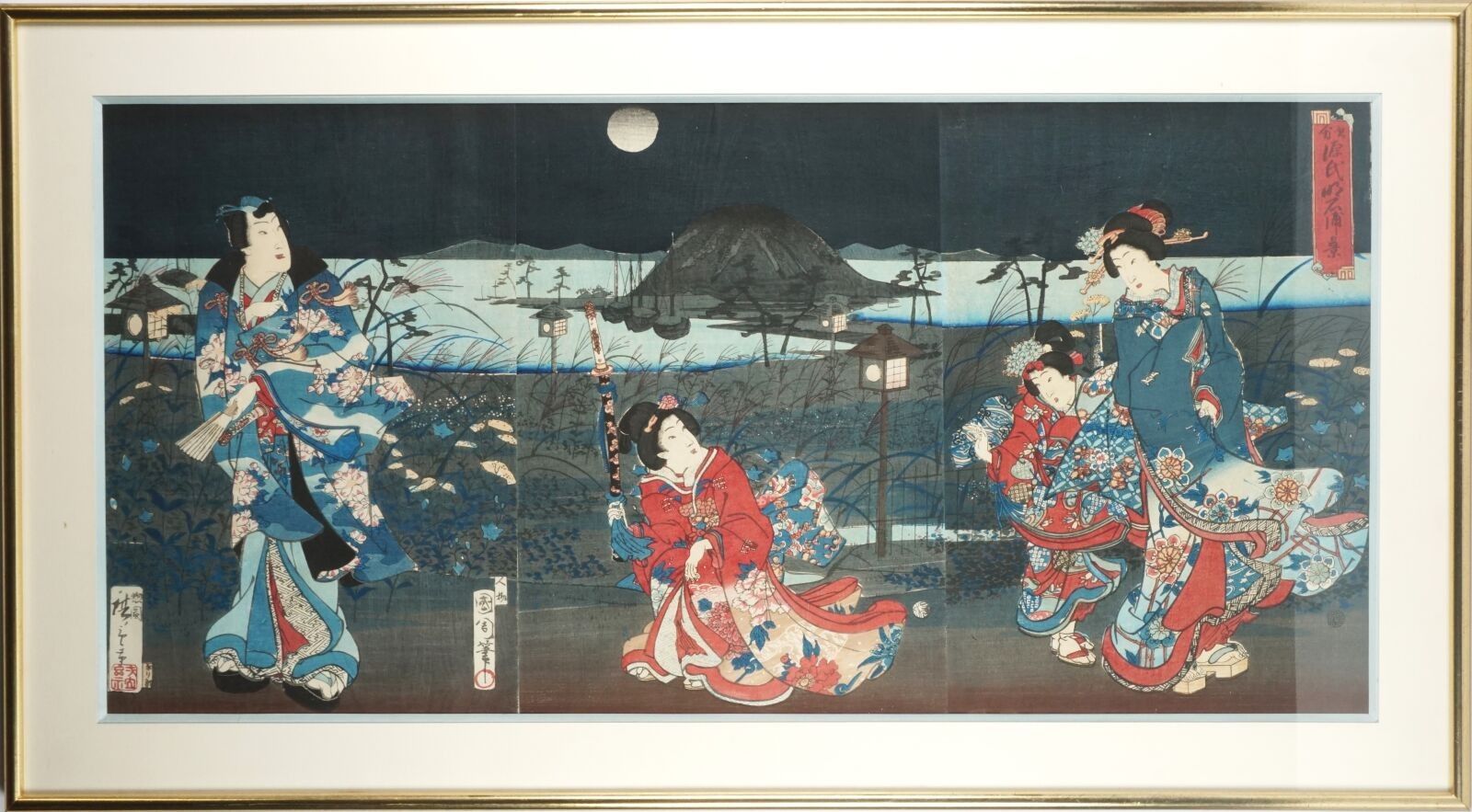 Three oban tate-e format prints forming a triptych by Toyohara Kunichika "View of Akashi Bay" 33.5 x 70 cm (on view).