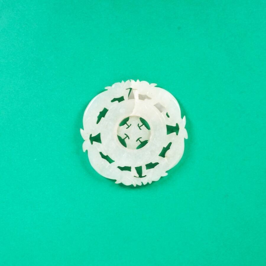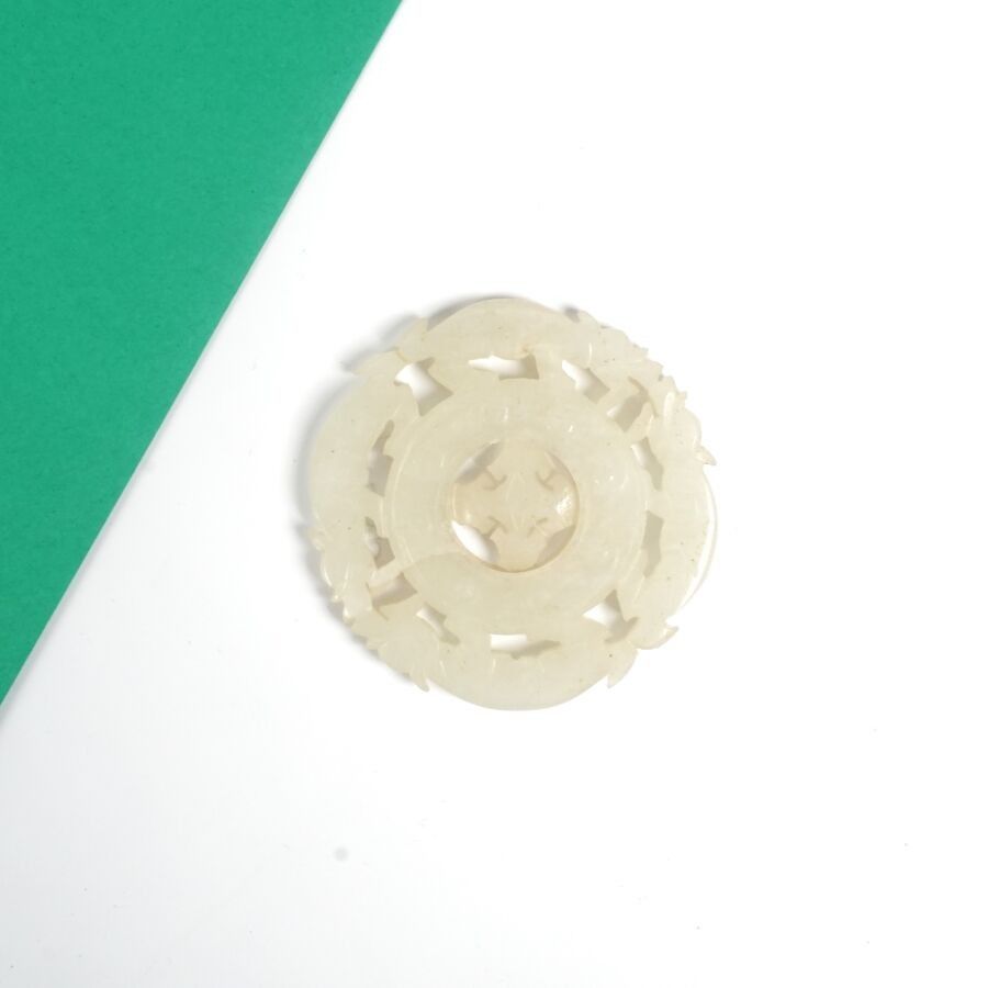 A white jade medallion, slightly celadon, in the form of a bi disc decorated with chilongs and stylized lingzhi motifs, the movable centre China, late Qing period, Diam. 5.5 cm (small chips to the movable element).