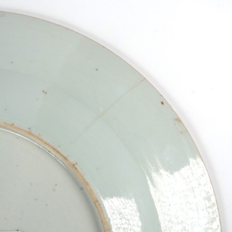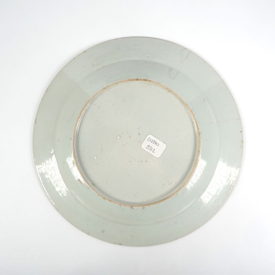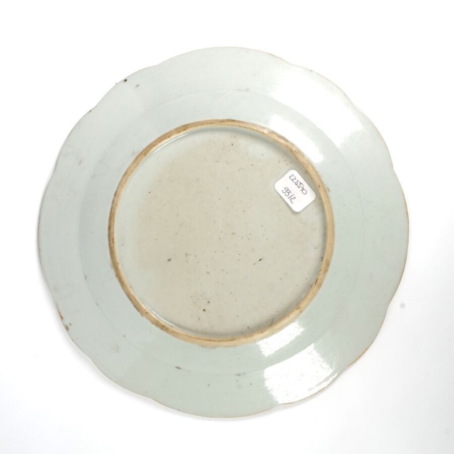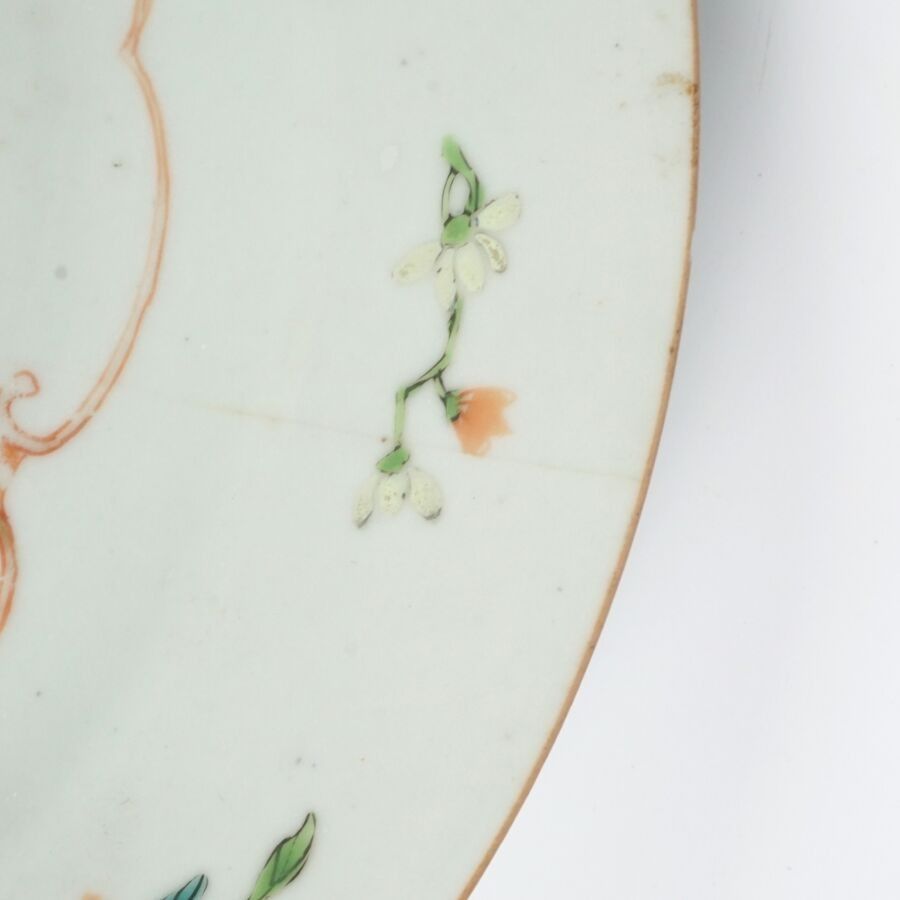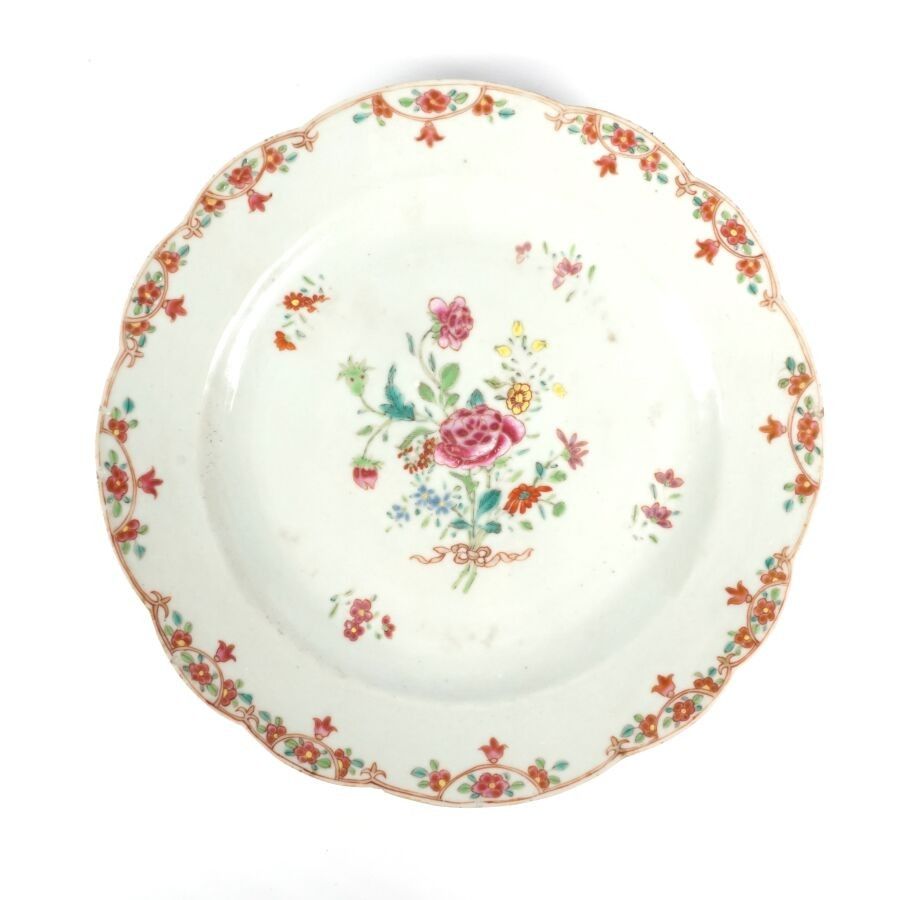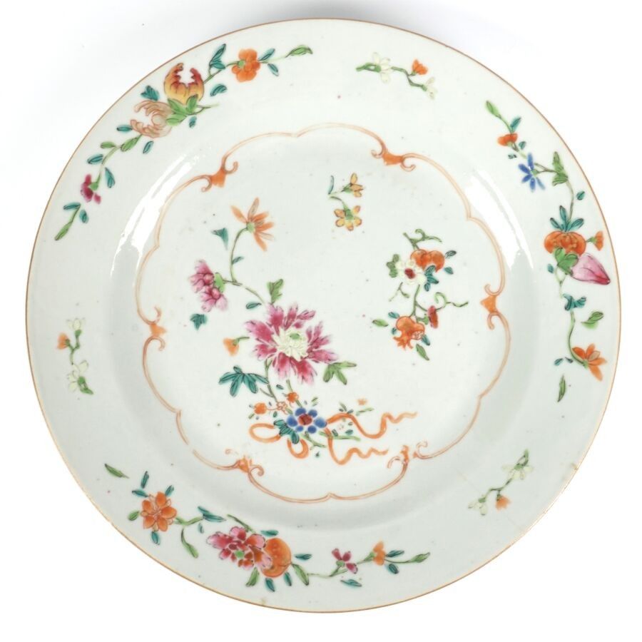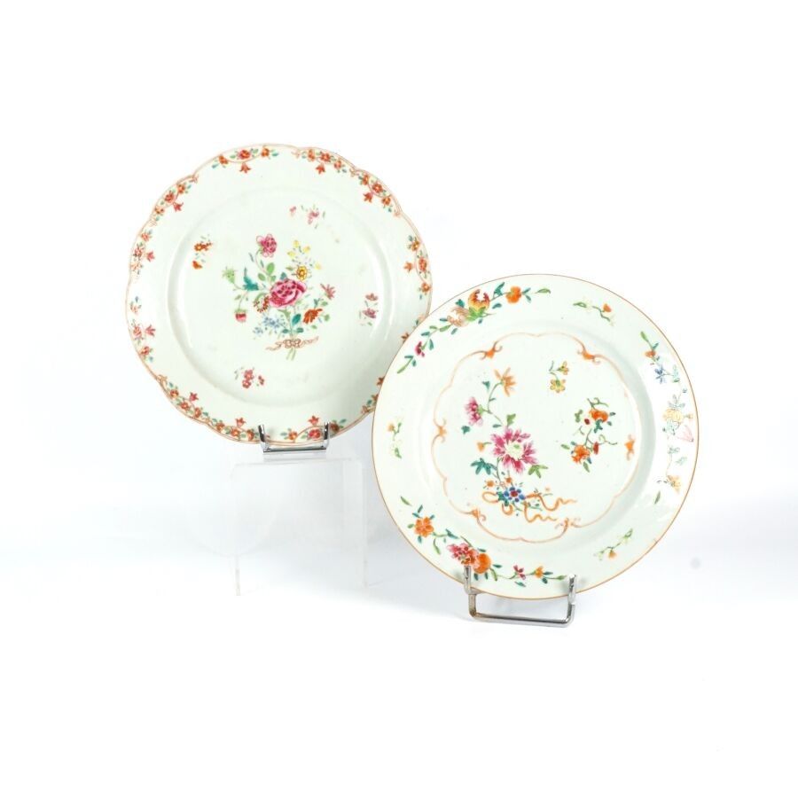 Two Famille Rose porcelain and enamel plates decorated with chrysanthemums and flowers, one with a floral garland and the other with peaches, Compagnie des Indes, China, 18th century, D. 22.5 cm and 22.6 cm (one with a small crack, the other with a few small chips along the edge).