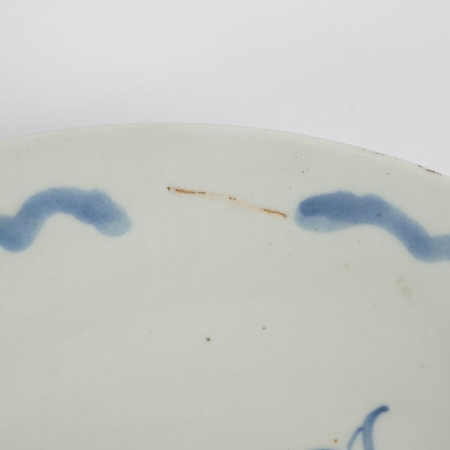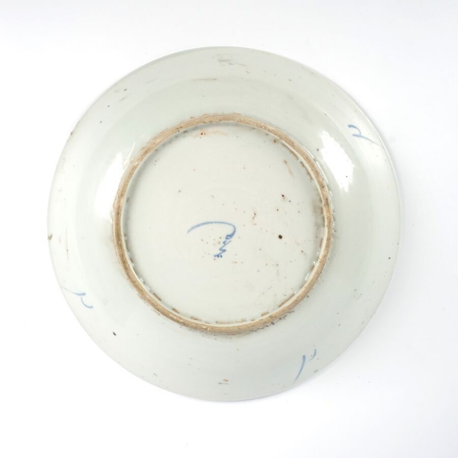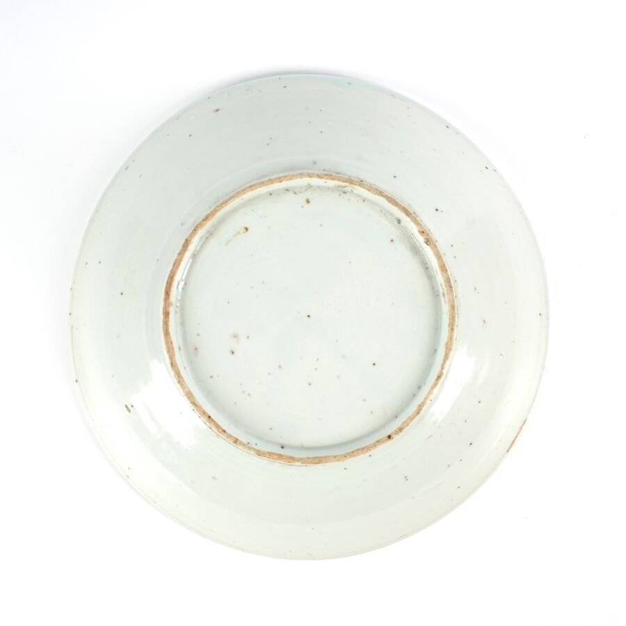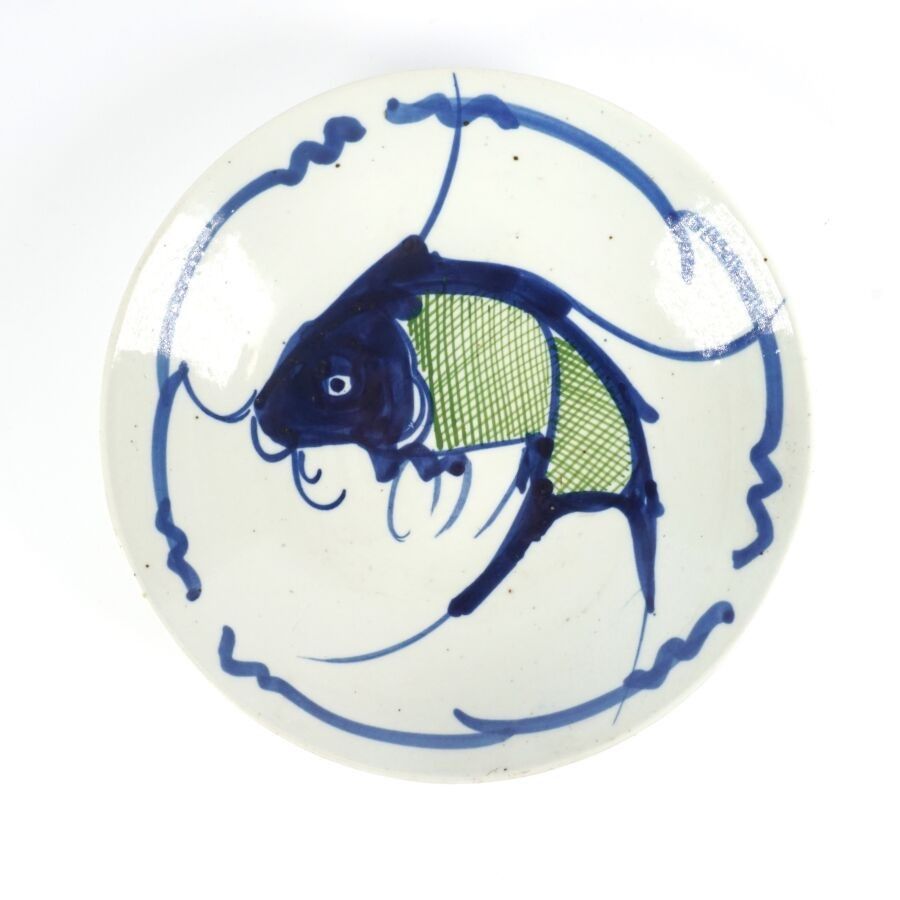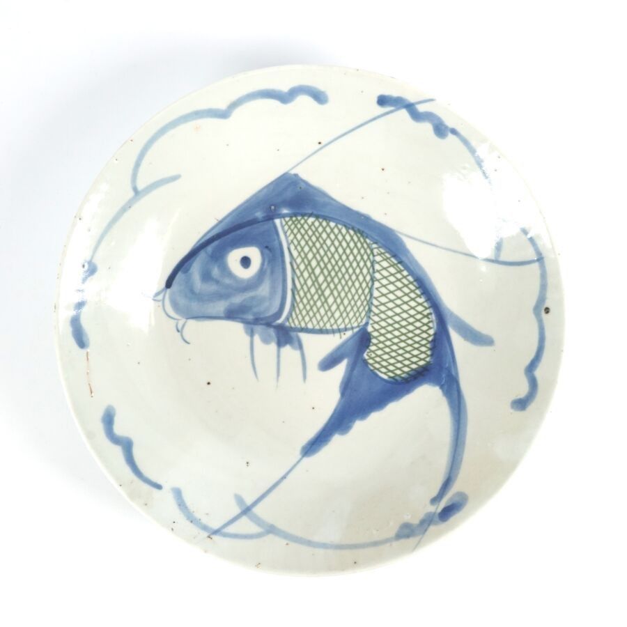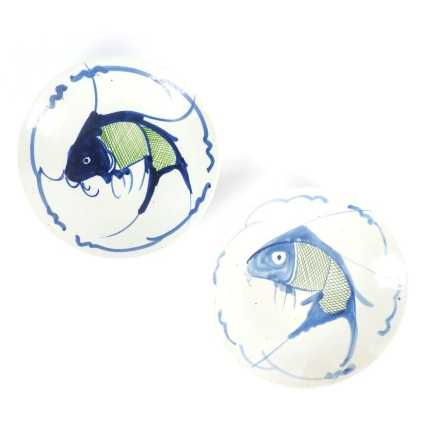 Two white porcelain plates with blue and green enamelled carp decoration, South China, early 20th century, Diam. 22 cm.