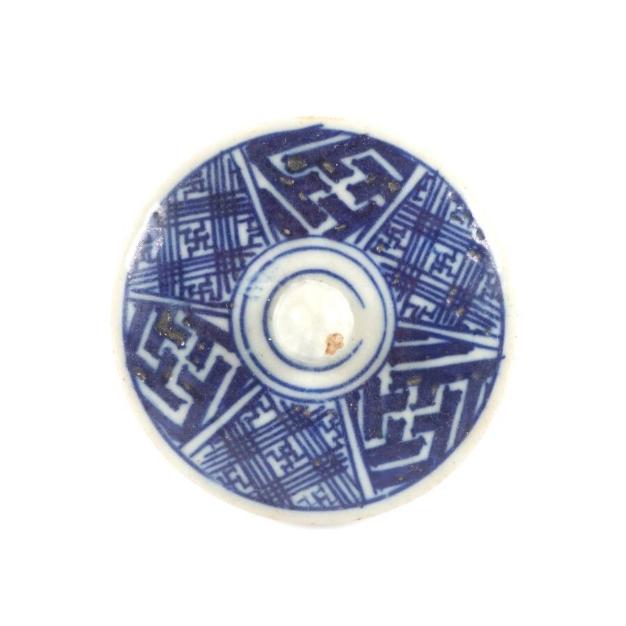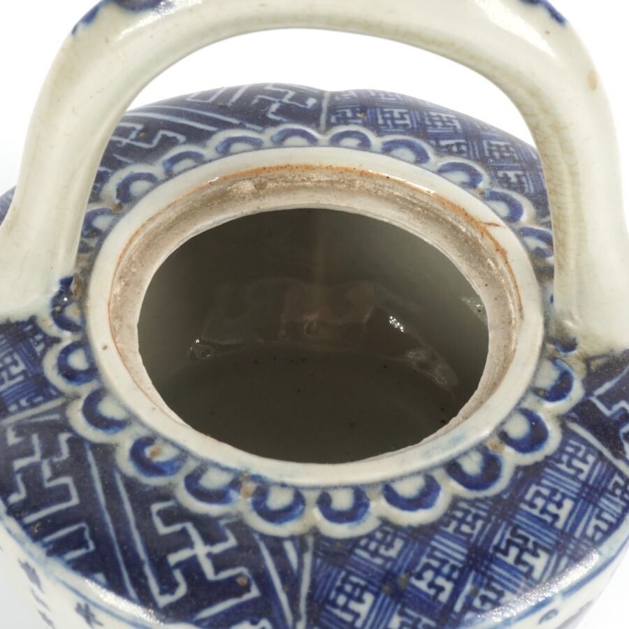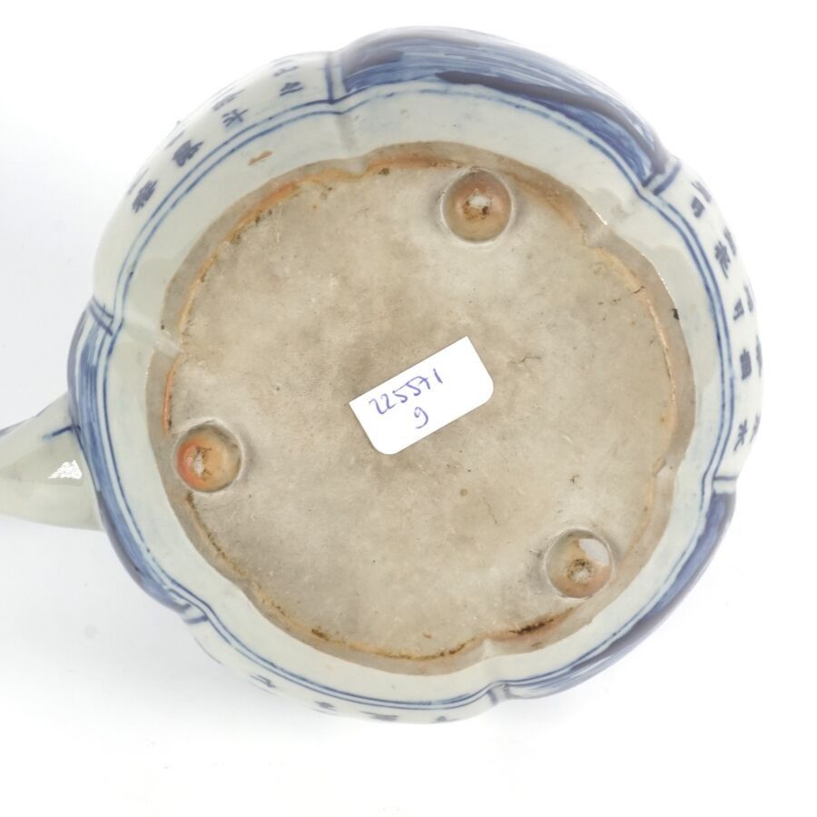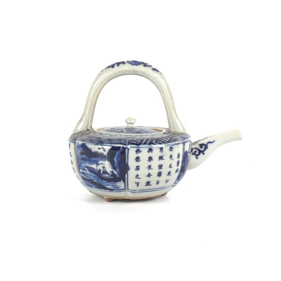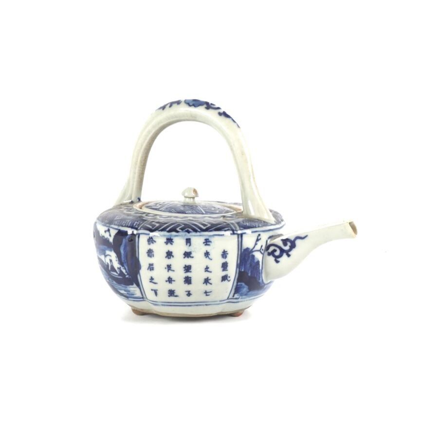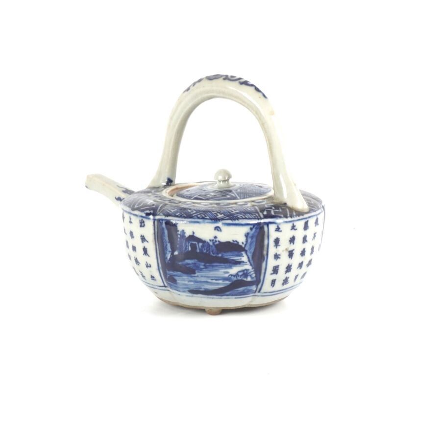 A blue-white porcelain teapot with printed calligraphy and landscape decoration, China, 20th century, H. 14.5 cm.