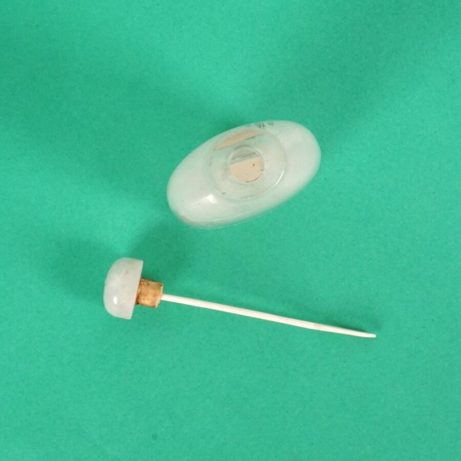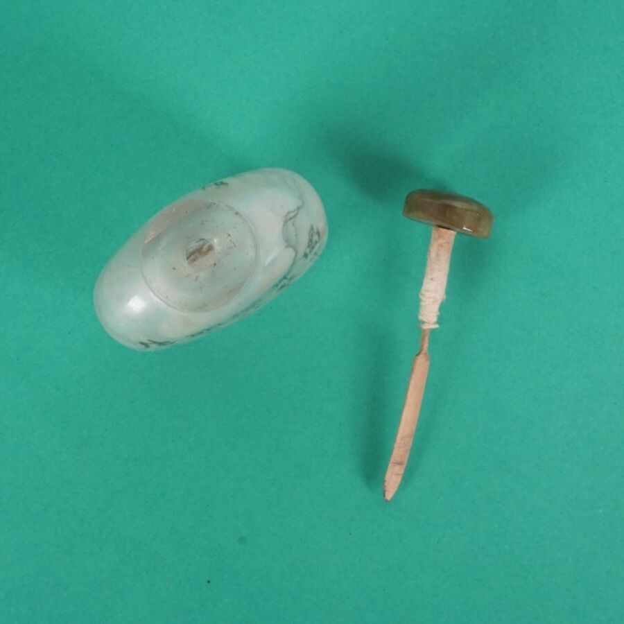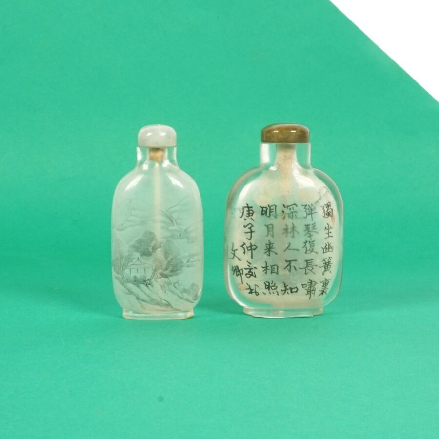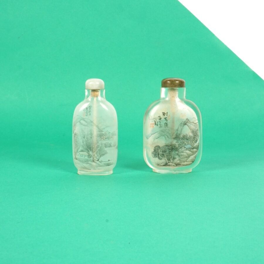 Two painted glass snuff bottles, one after the artist Zhang Baotian (Master snuff bottle under the reign of Emperor Guangxu) dated 1893, the stopper surmounted by a jadeite, with mountain and lake decoration, the second decorated with a calligraphic poem evoking the feeling of solitude, bears a signature of Wen Qing, dated 1840, China, late 19th - early 20th century, H. 6.8 cm and 7 cm.