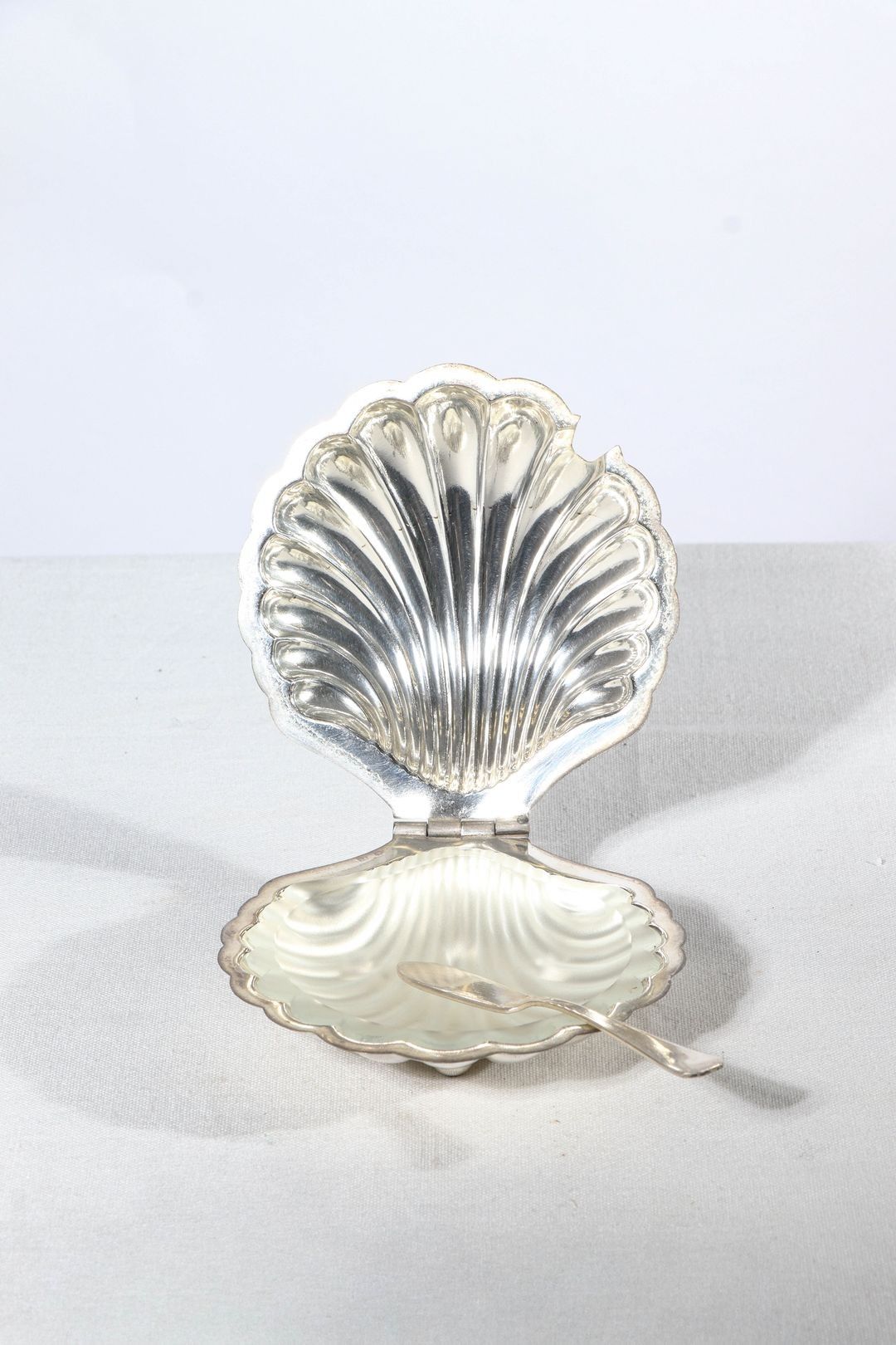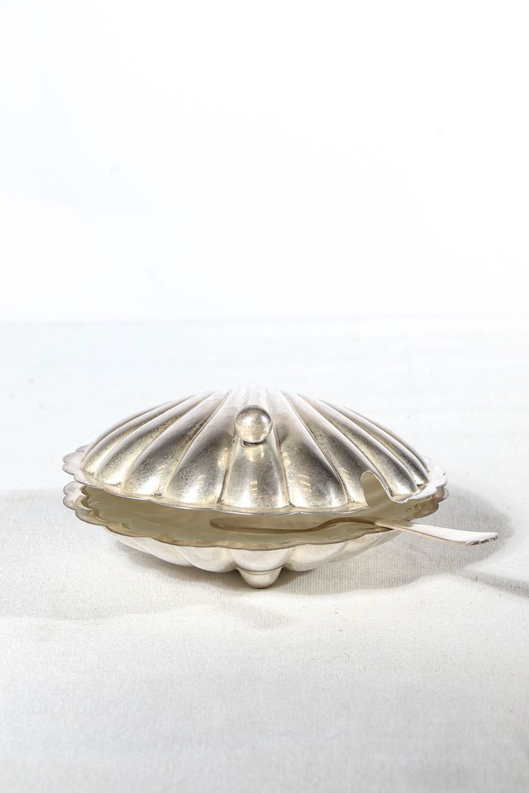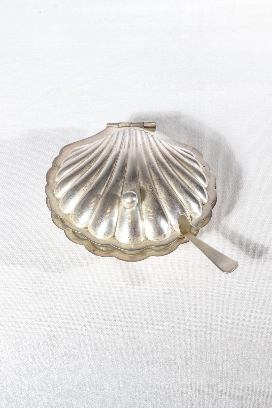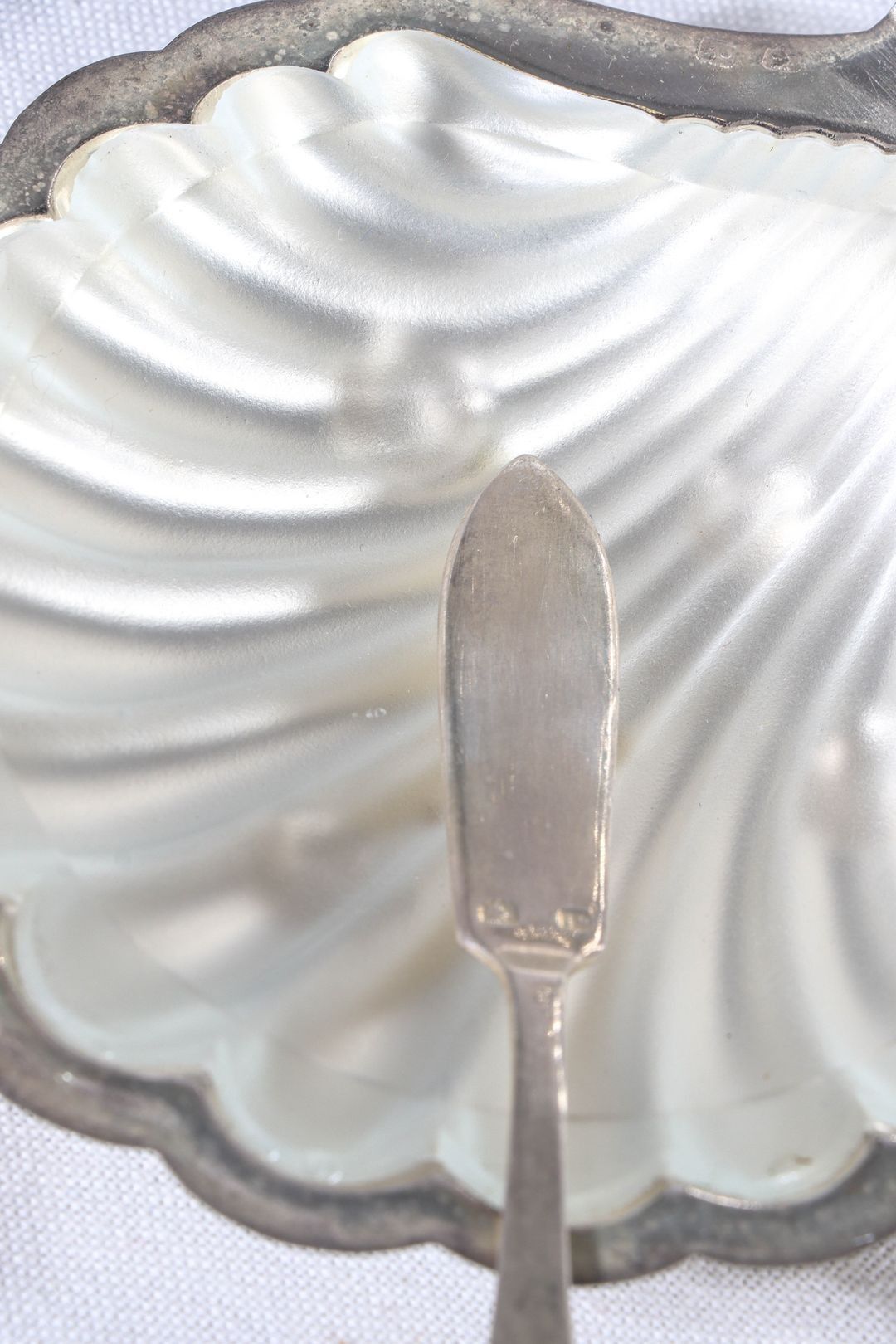 Scallop-shaped butter dish in silver-plated metal and glass.