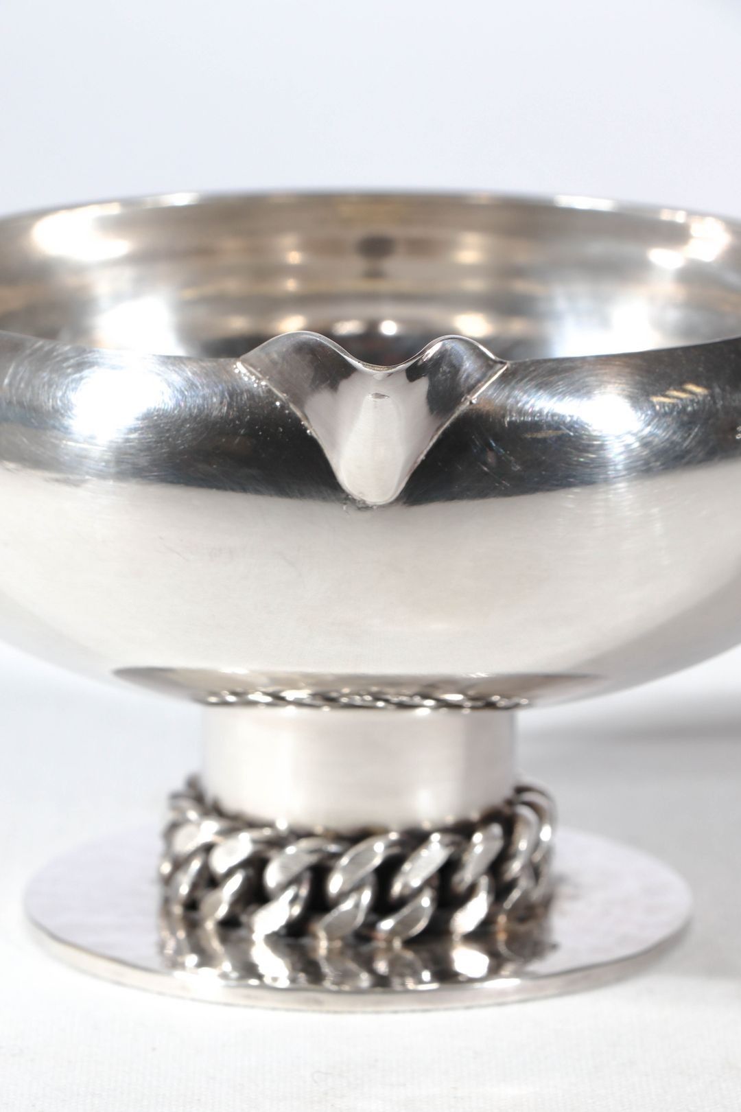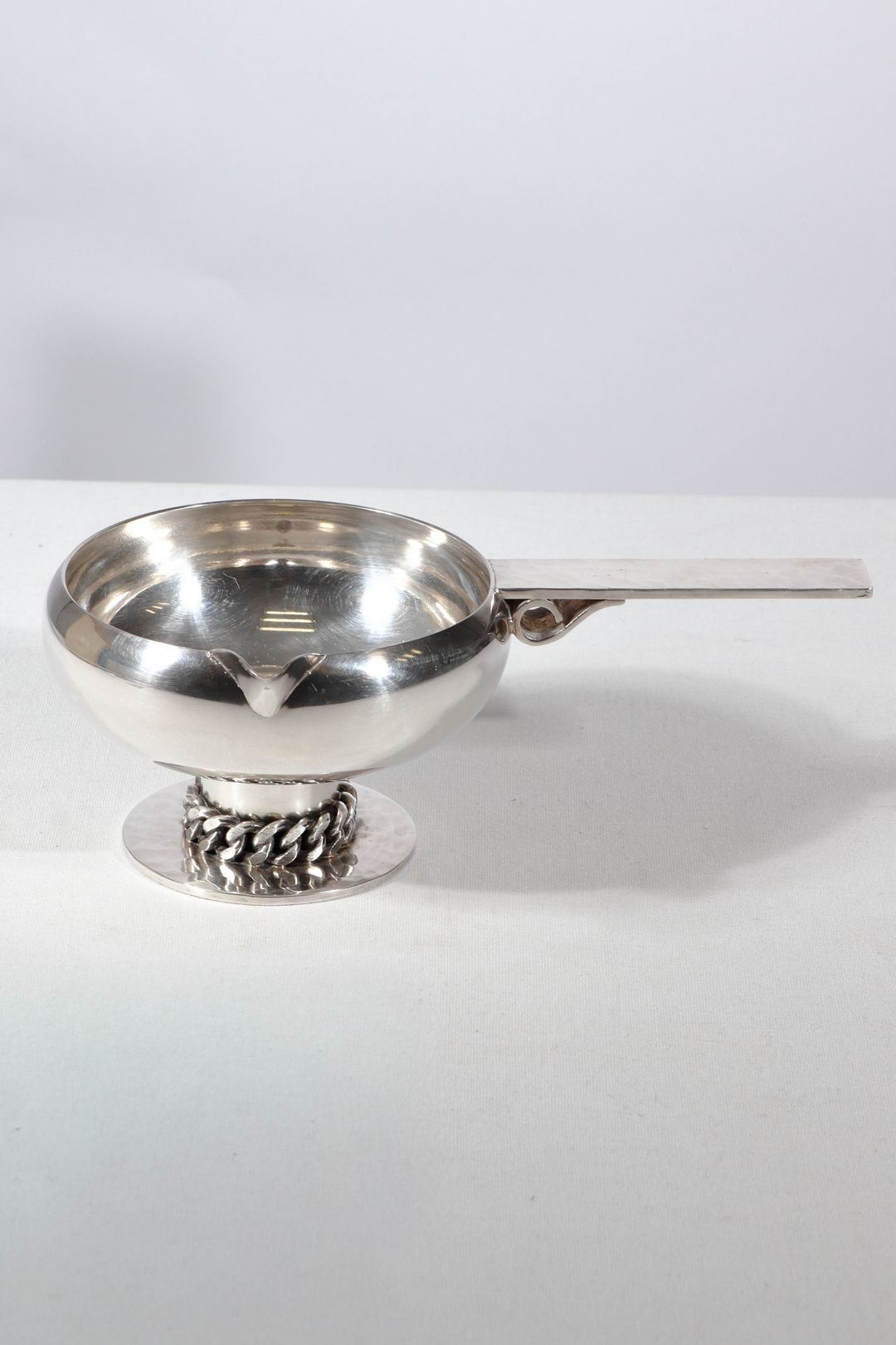 Round pocket bowl on a silver-plated metal pedestal reminiscent of a frying pan. The base underlined by a chain.