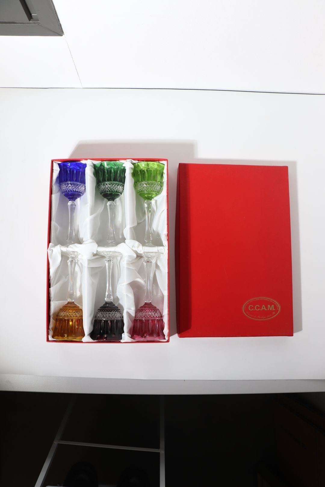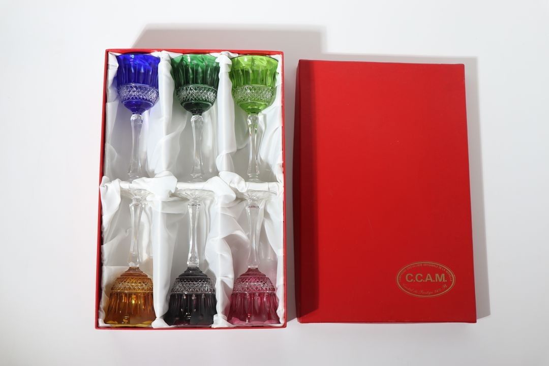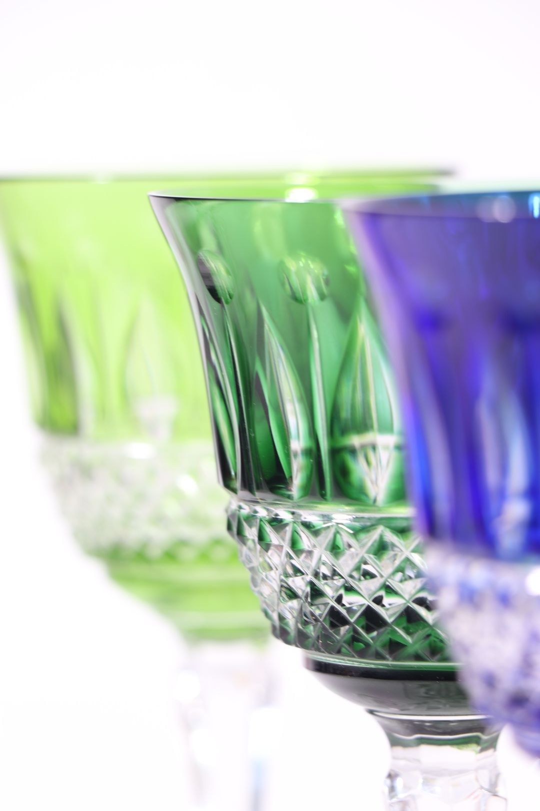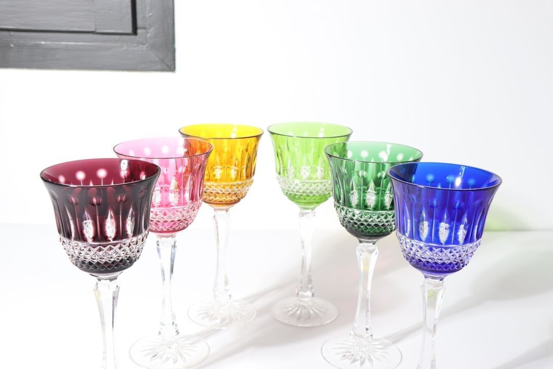 In the Saint-Louis style. Set of 6 cut crystal stemmed glasses in different colours. Engraved Cristal Prestige CCL under the foot. H:21cm. A few missing pieces. - Recoverable VAT
