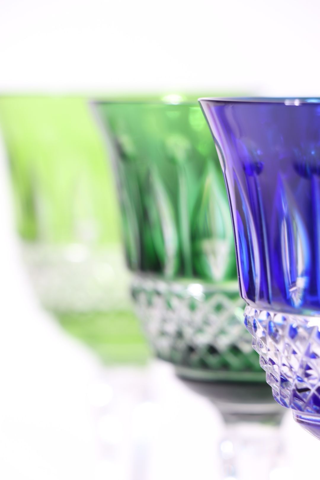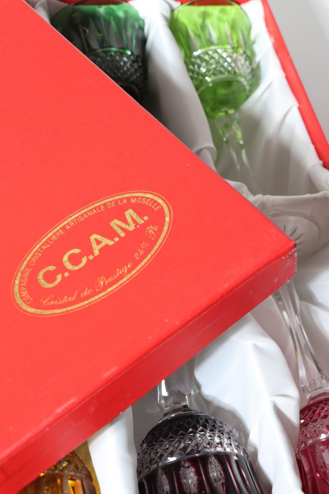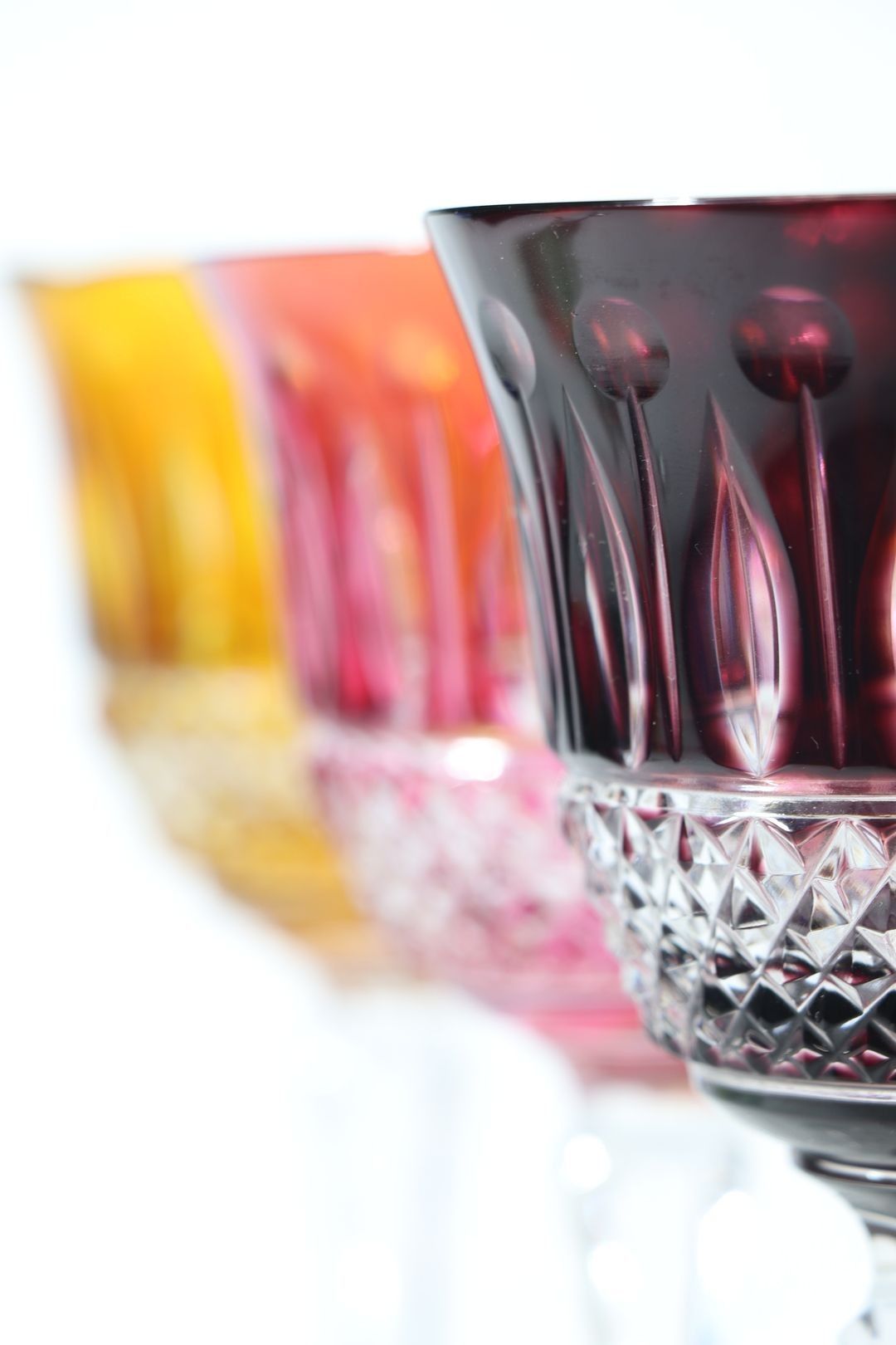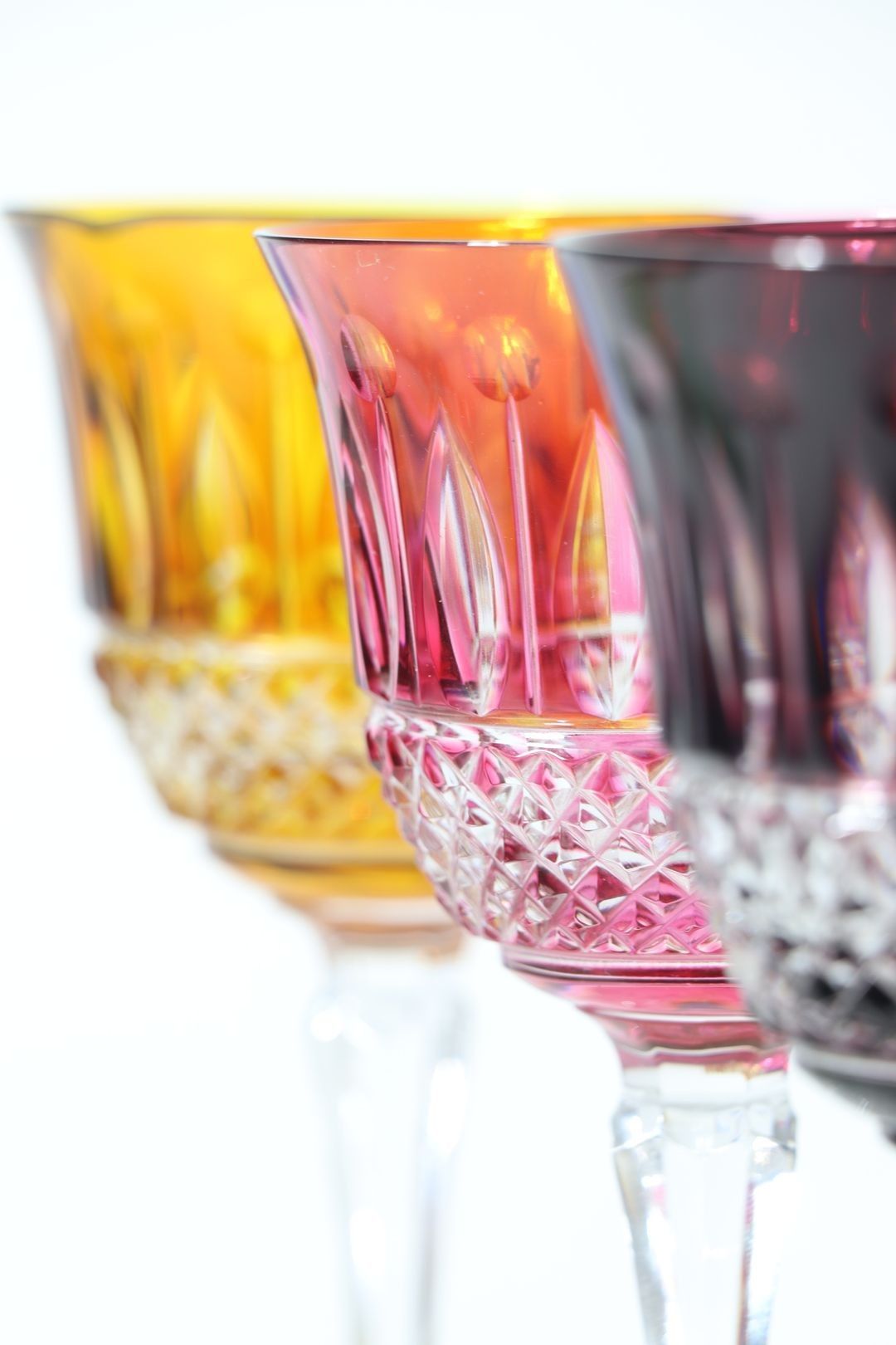 In the Saint-Louis style. Set of 6 cut crystal stemmed glasses in different colours. Engraved Cristal Prestige CCL under the foot. H:21cm. A few missing pieces. - Recoverable VAT