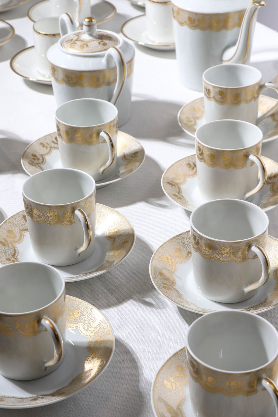 Very good condition with a few minor flaws (some cups slightly chipped and one saucer glued back together).