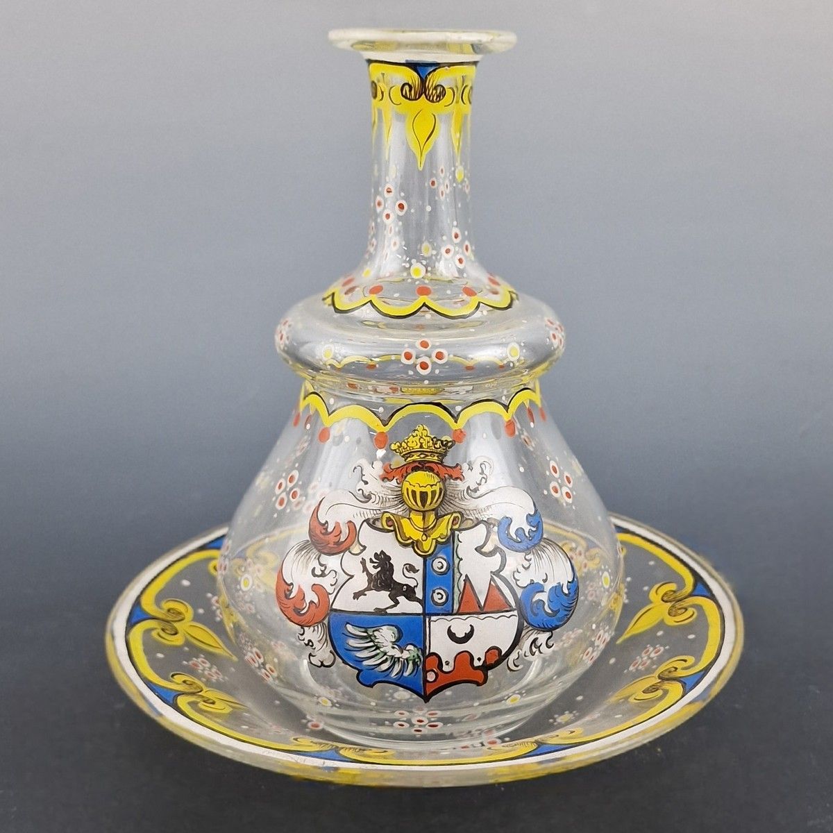 WATER GLASS CARAFEE H. 16 cm AND CIRCULAR TRAY D. 15.5 cm in white glass - Austria - Vienna Late 19th Century with polychrome enamel decoration, in the centre a coat of arms under a crowned helmet, the tray decorated with a frieze of fleurs-de-lis