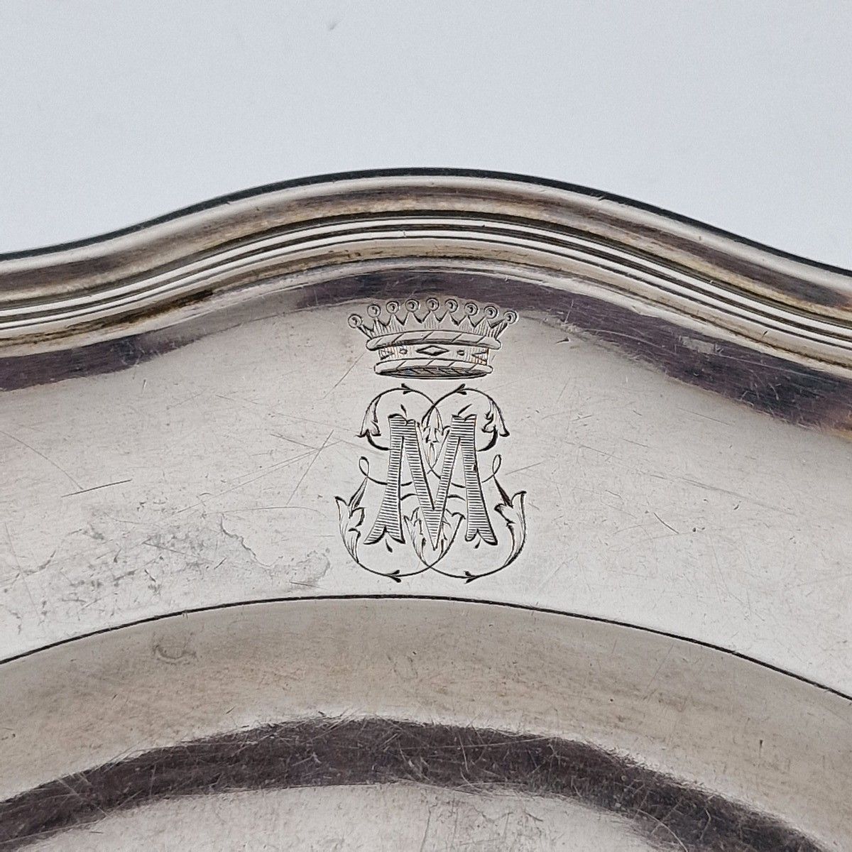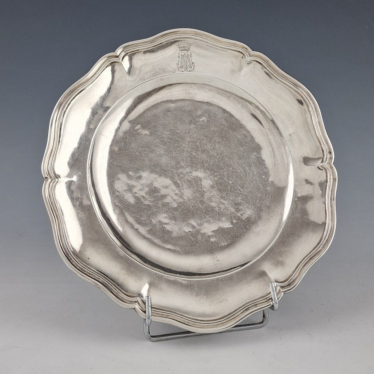SMALL ROUND PLAT with rim and pinched ribs in Minerva 950 Millièmes silver in the 18th century style - Late 19th century with engraved decoration of a triple monogram stamped with a count's crown